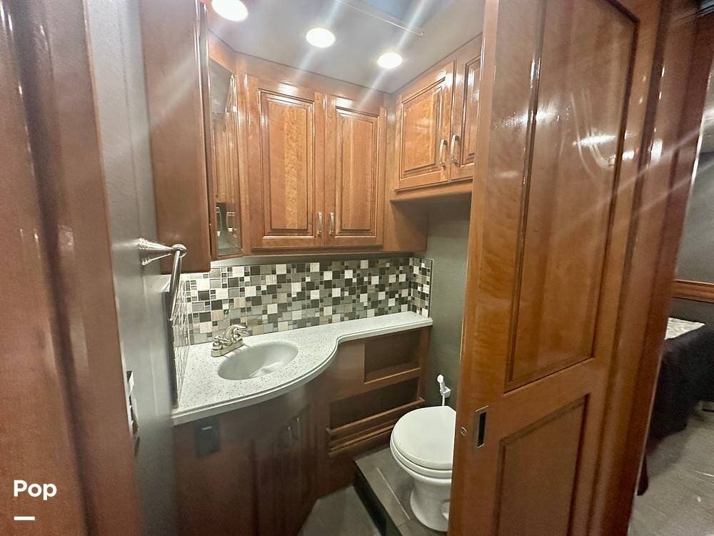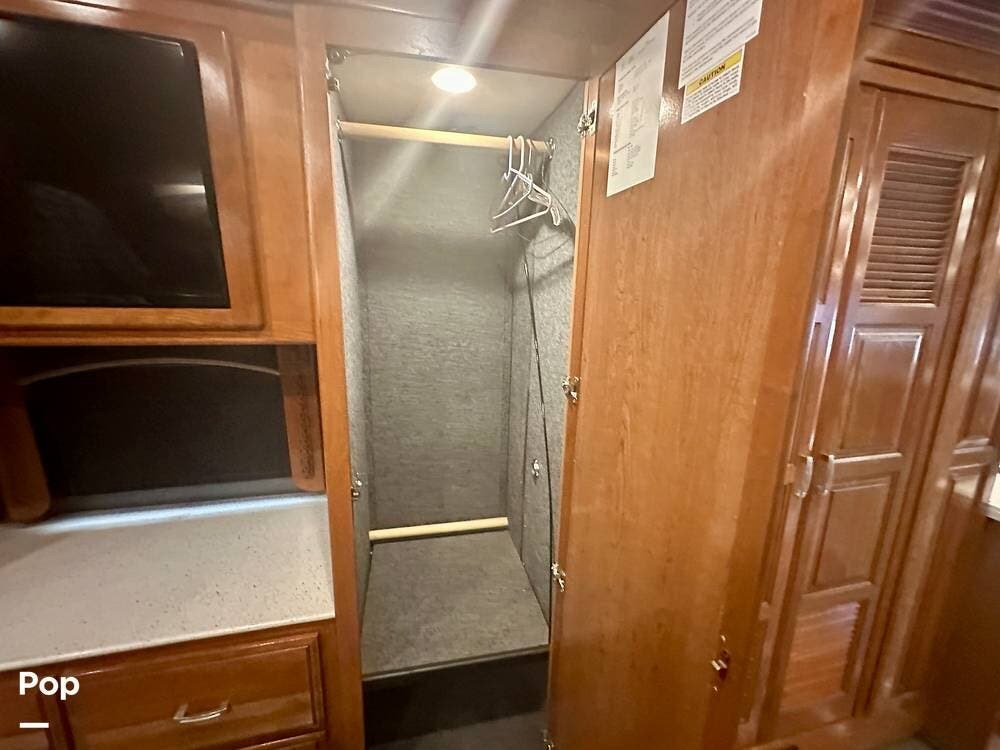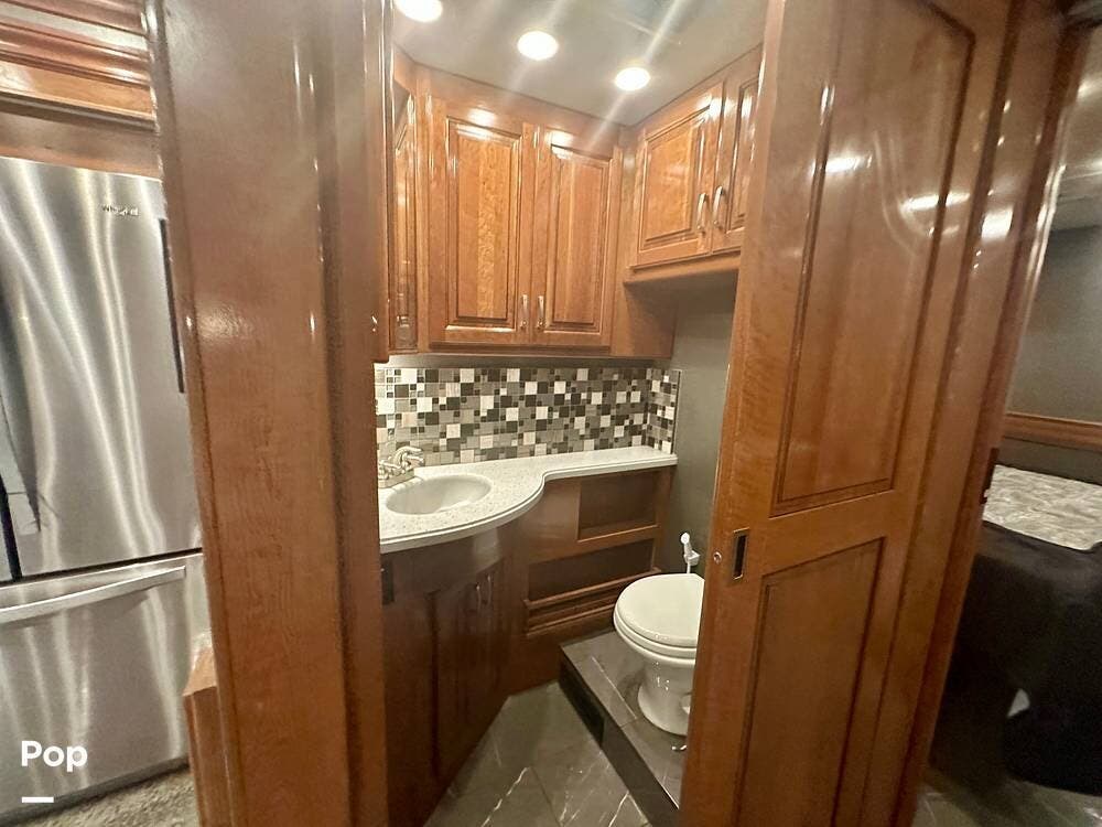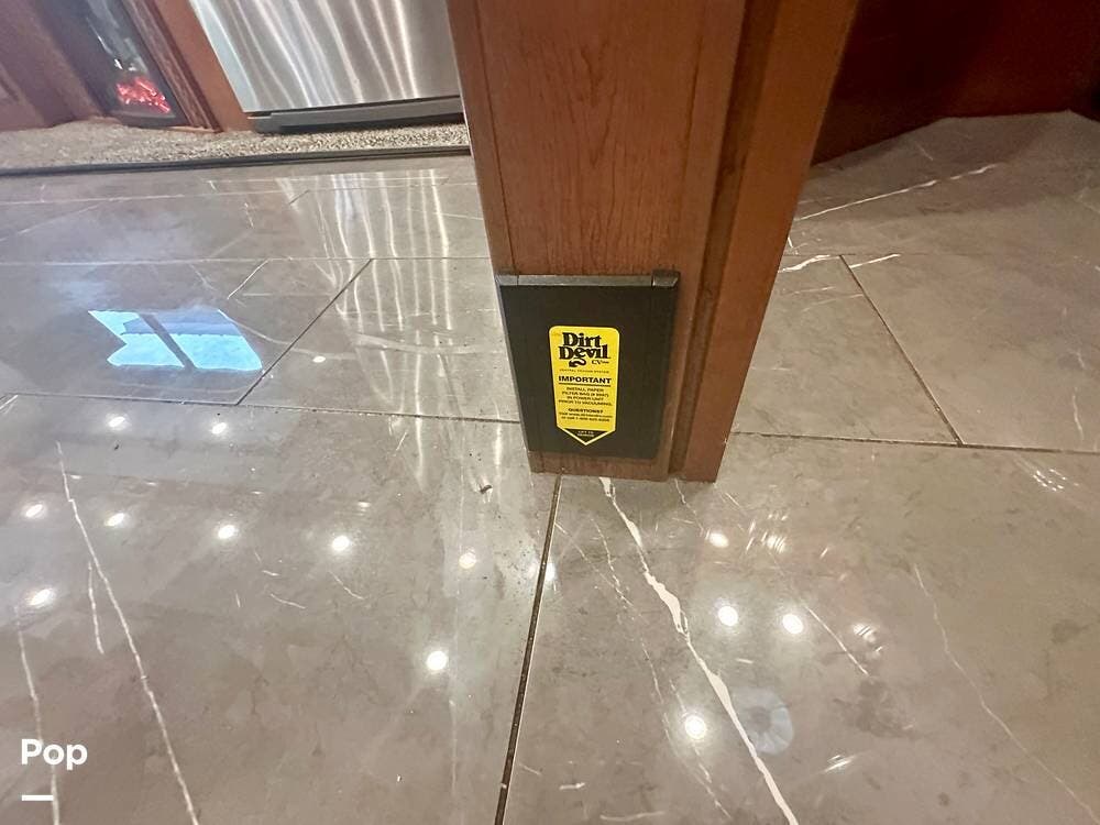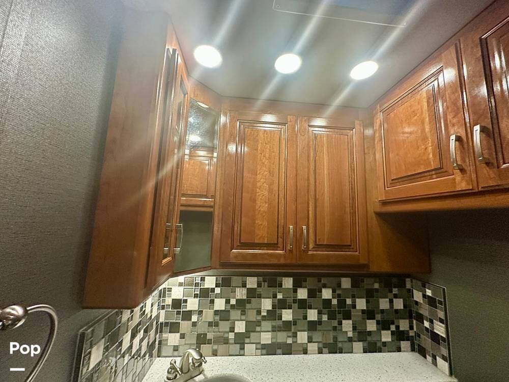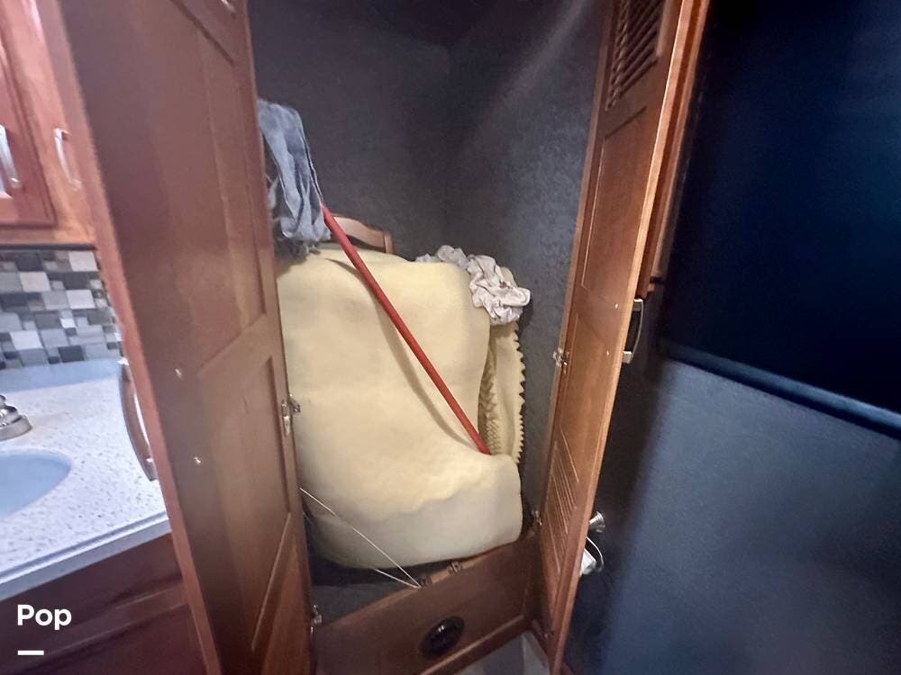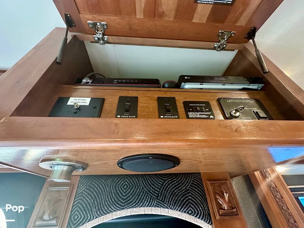 The kitchen is well equipped with a full-size refrigerator and freezer, a dishwasher, a stovetop, and a convection microwave. It brings the conveniences of a full kitchen on the road, including a large pantry and plenty of cabinets and drawers for all your cooking needs.