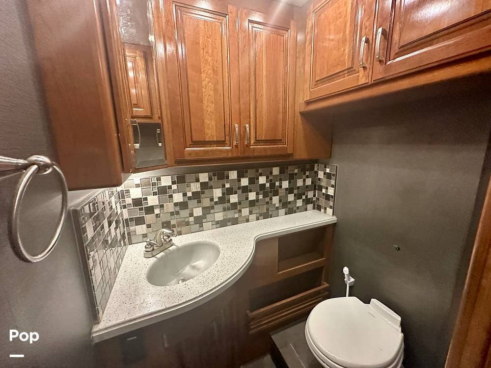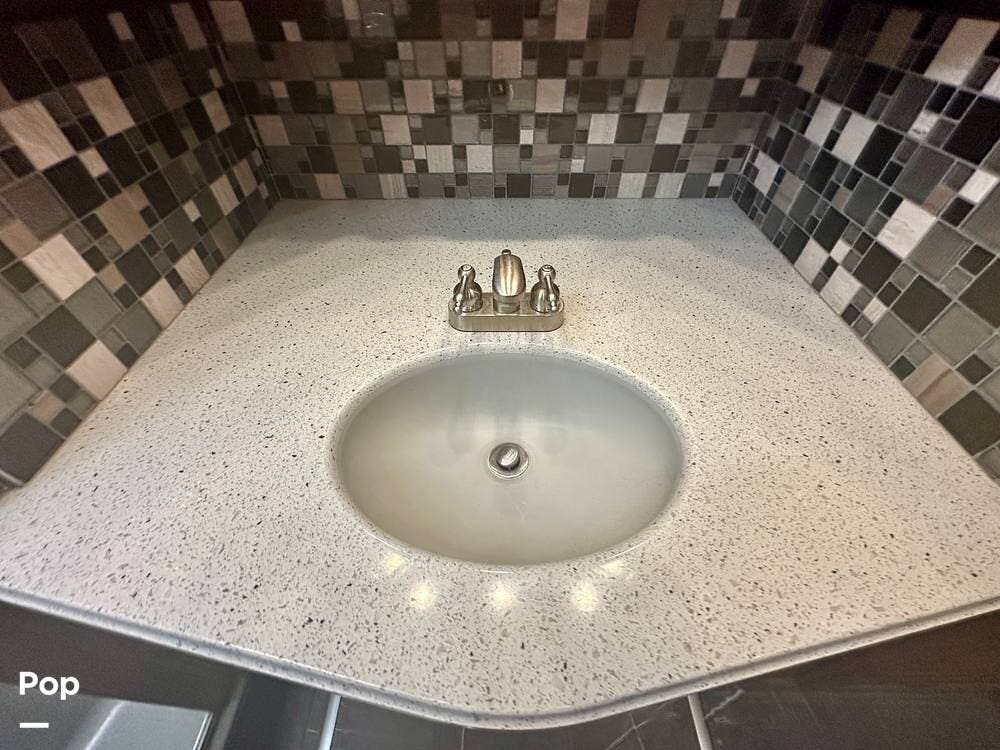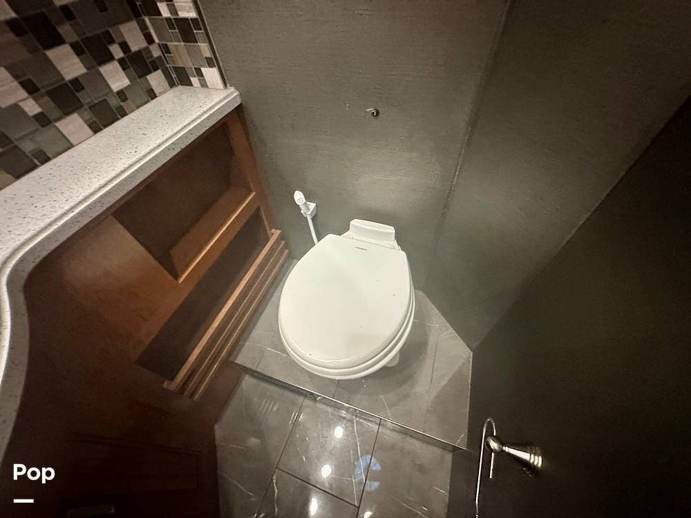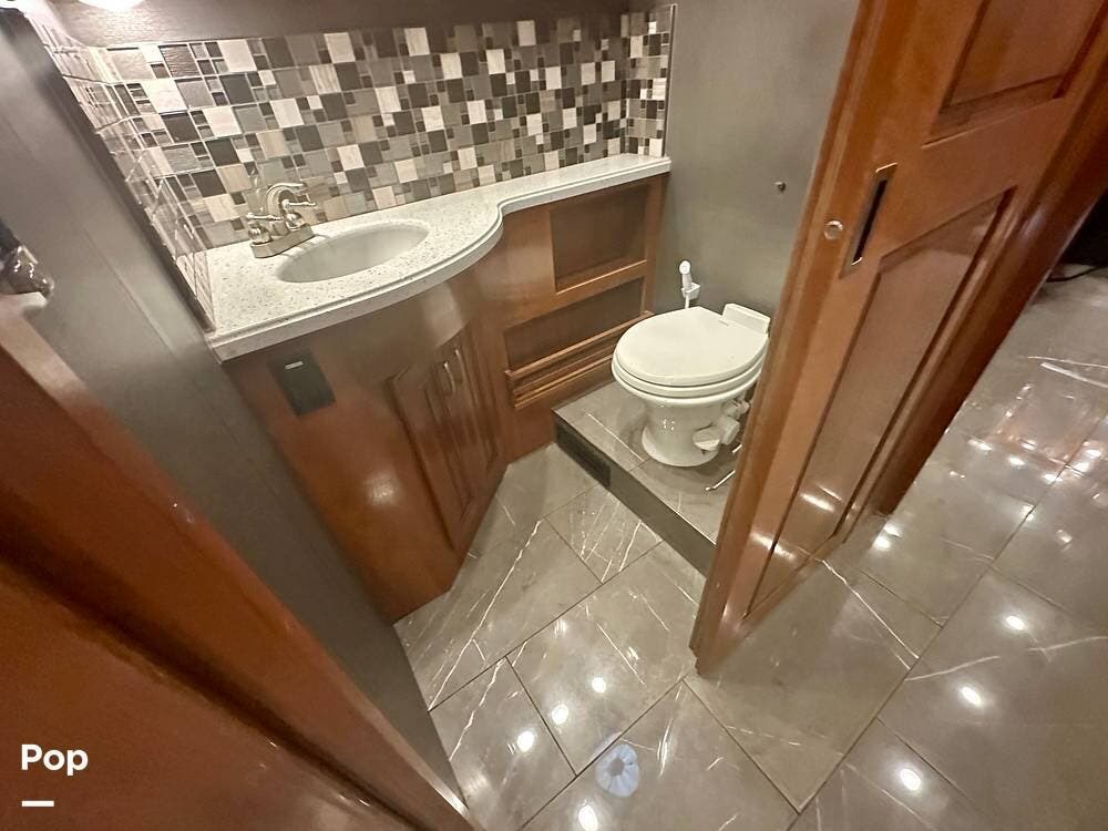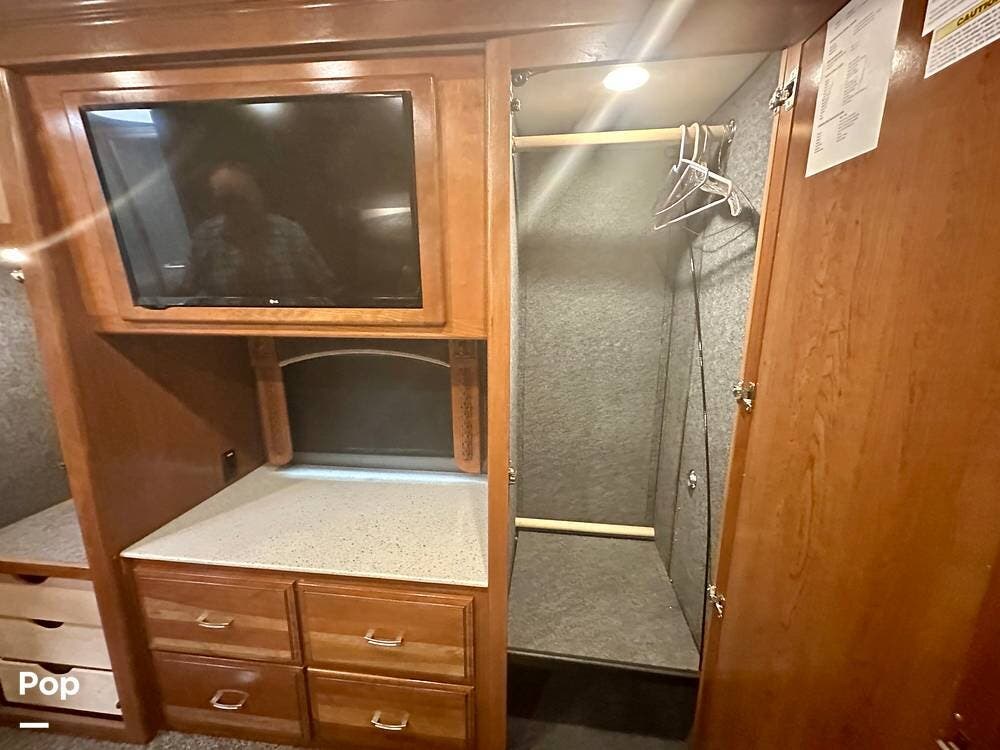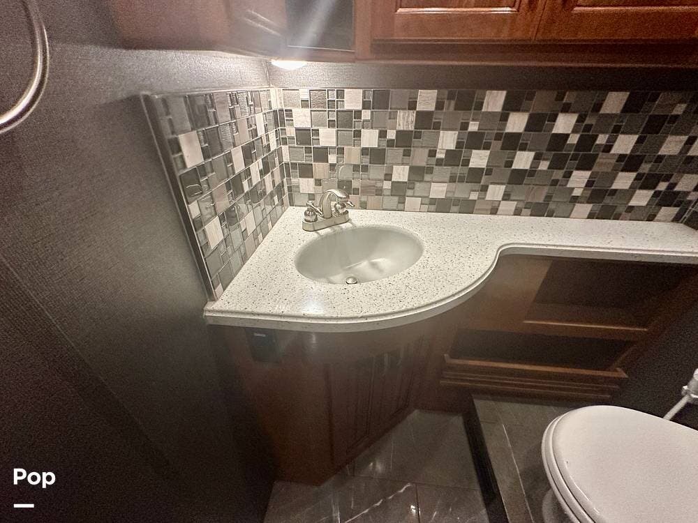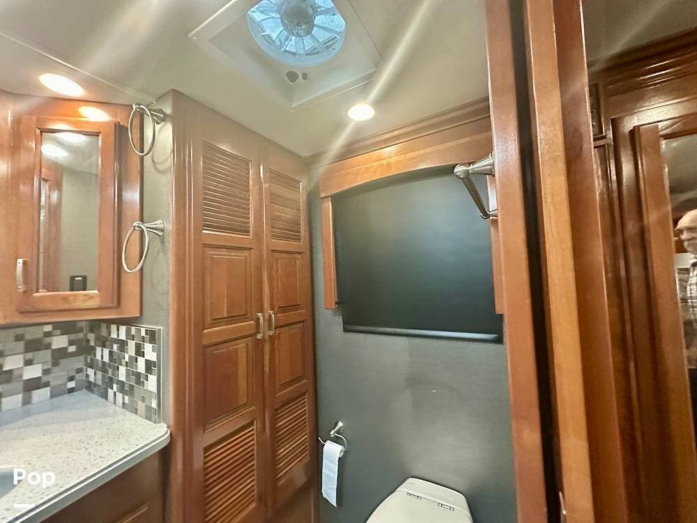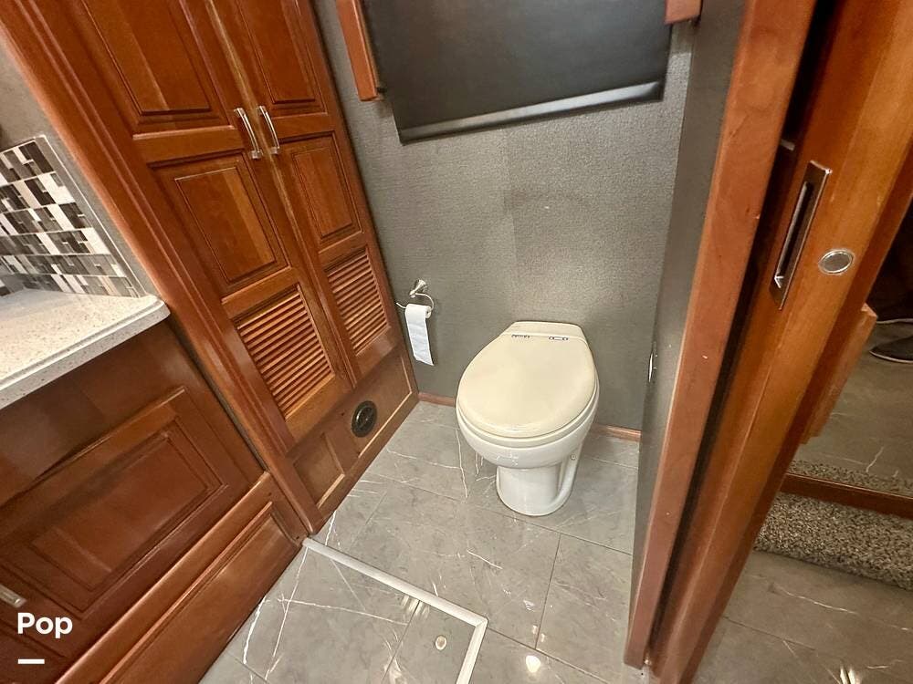 The kitchen is well equipped with a full-size refrigerator and freezer, a dishwasher, a stovetop, and a convection microwave. It brings the conveniences of a full kitchen on the road, including a large pantry and plenty of cabinets and drawers for all your cooking needs.