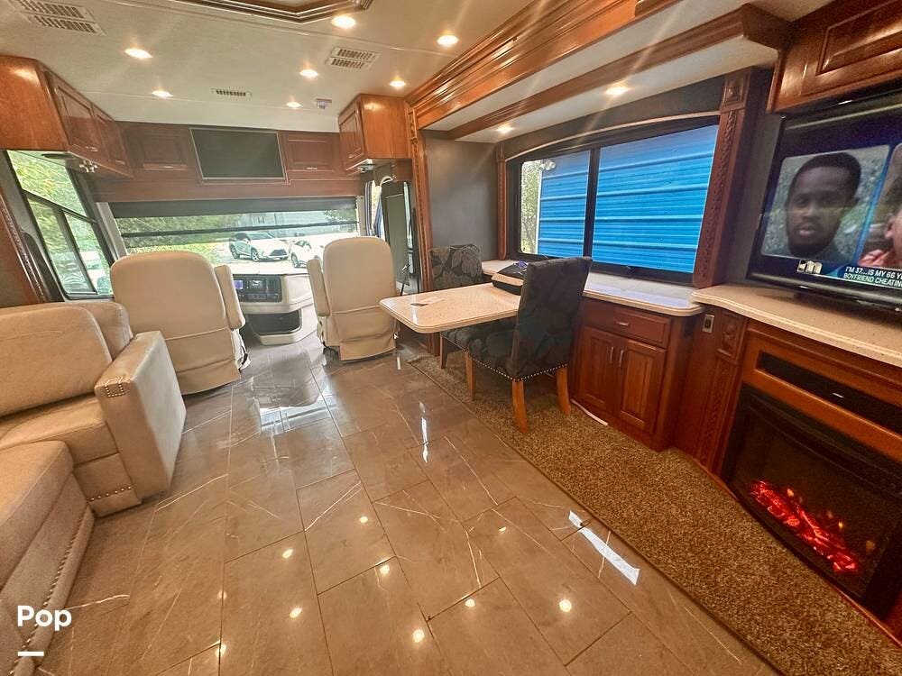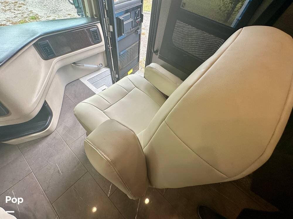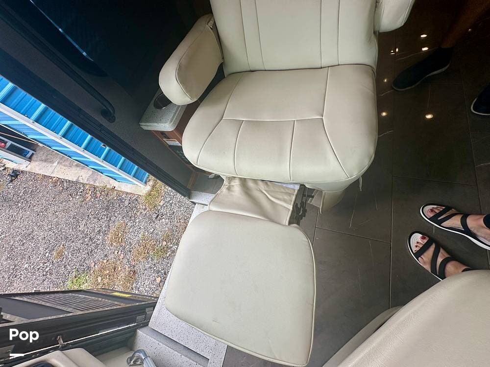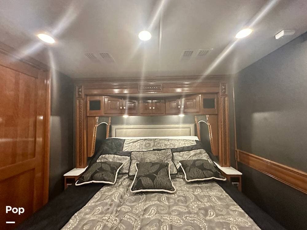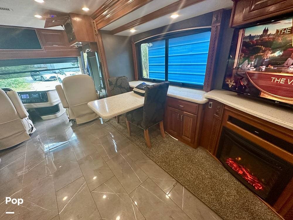 A white leather couch and fireplace add a cozy touch, perfectly complemented by three TVs throughout the coach. The driver and passenger seats, which come with leg rest swivels, can be adjusted for extra seating. While the outside entertainment system with TV and stereo invites evenings under the stars.