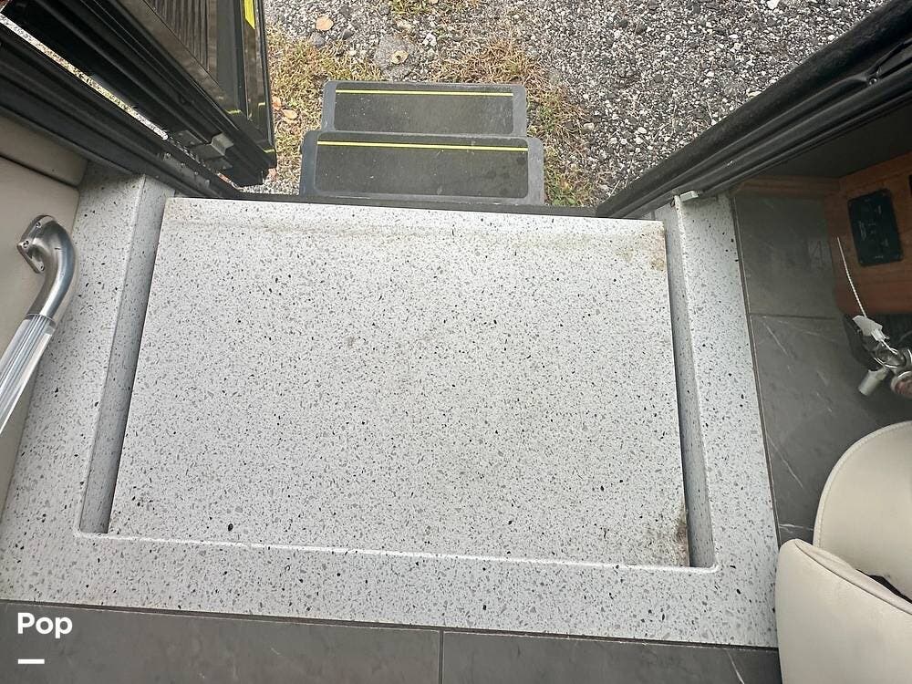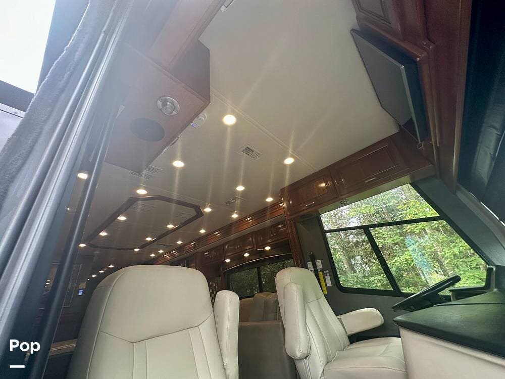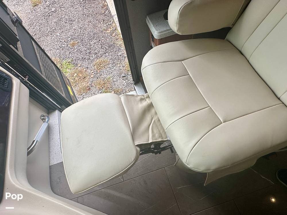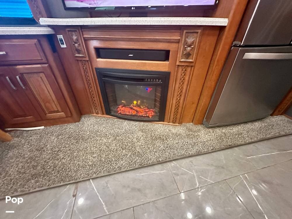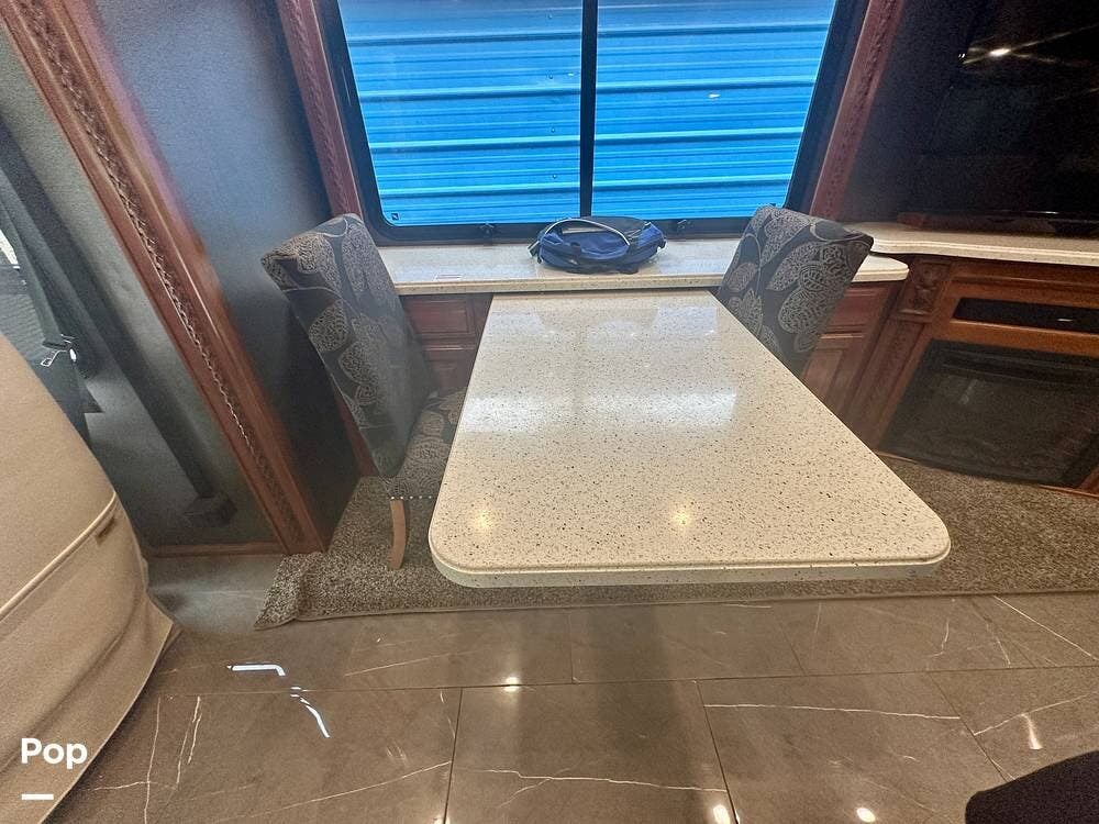 A white leather couch and fireplace add a cozy touch, perfectly complemented by three TVs throughout the coach. The driver and passenger seats, which come with leg rest swivels, can be adjusted for extra seating. While the outside entertainment system with TV and stereo invites evenings under the stars.