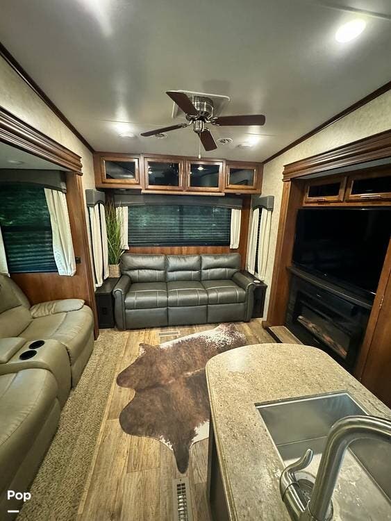 The main living area features theater seating and a sleeper sofa, both with a great view of the fireplace and entertainment center.