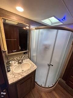 The front-located master bedroom has a slide, which really opens up the room. A 60"X 80" queen bed with space to walk around the sides and plenty of storage space makes it super comfortable. There is also a flat-screen TV in the master suite.
