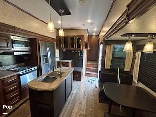 In the center-located kitchen/living area, the large slides oppose, making this space extra roomy. There is a mid-size refrigerator/freezer, microwave, oven, and stove.