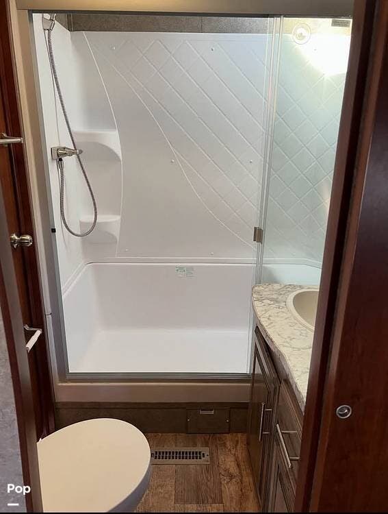 The bathroom is complete with a large walk-in shower and additional storage space.
