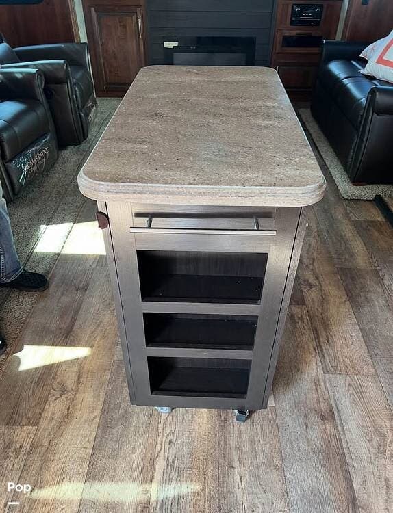 The kitchen and dining areas are also located on adjacent slides, with the optional rolling kitchen island serving as a separator between them. The island is perfect for meal preparation or as a buffet.