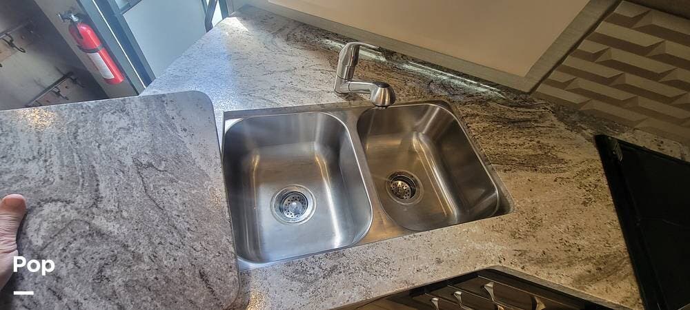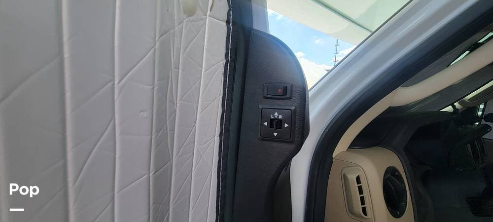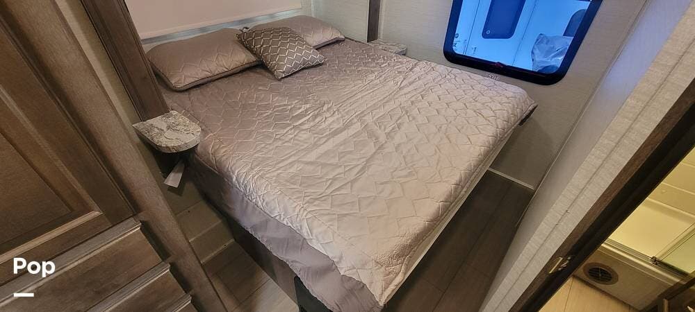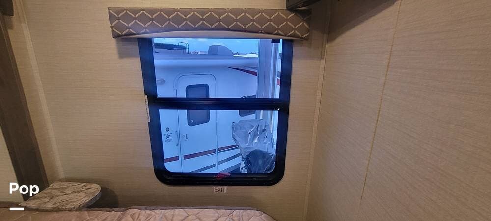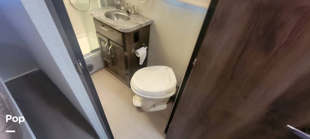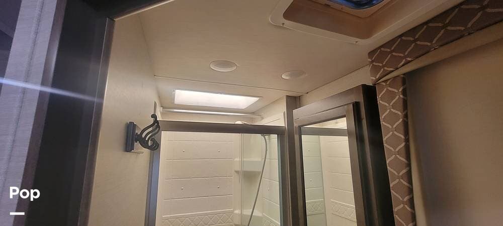 The bathroom in this RV is unique. It has a long window with blinds and window treatments. The shower is spacious, and the room's layout is lovely. Take a look.