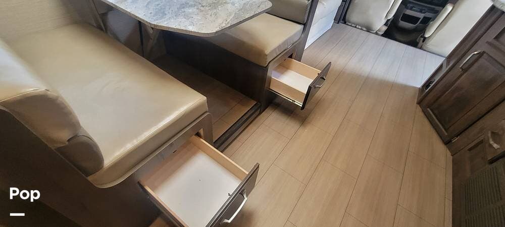 The unit includes a closet, a booth dinette, and light-colored floors that brighten the inside.