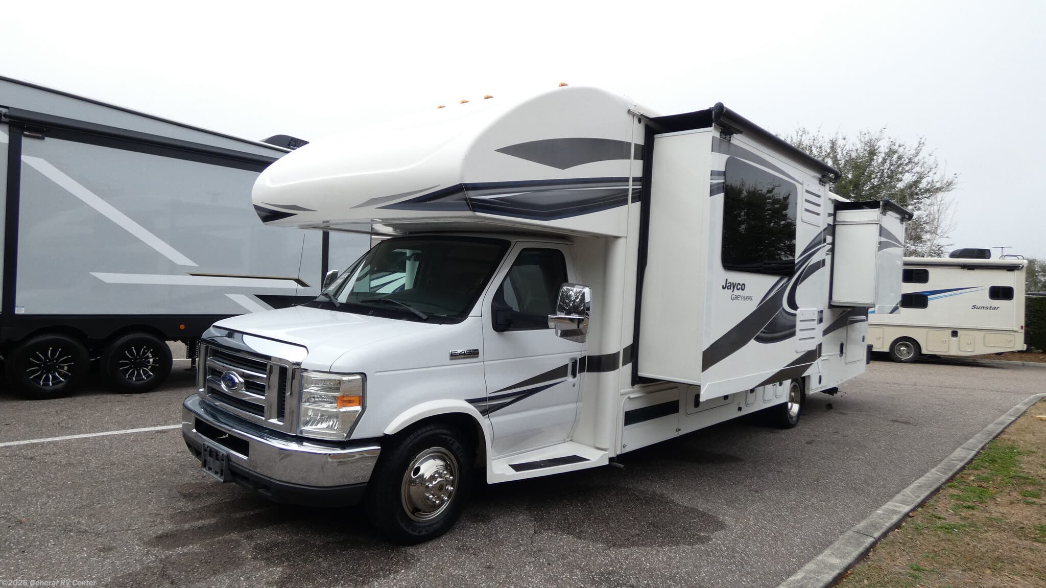 **Jayco Greyhawk class C motor home 31DS highlights:** - Double Slide Outs - Exterior Storage - 16' Awning - Cab-Over Bunk Come travel the country in style and comfort in this 31DS Greyhawk class C gas motor home! You will love the extra space that the double slide outs have to offer, plus there is room in the front of the motor home where you can easily do a little entertaining. Above the cab there is a bunk or your can choose to add an optional front entertainment center. At night you can also retreat to the rear room where you will find a queen bed, two wardrobes, plus a 24" LED TV. When you are ready to relax outdoors come enjoy the shade from the 16' awning. Outside you will also find plenty of exterior storage for all of your outdoor camping gear and more! Get ready for a comfortable and fun traveling and camping experience with the Jayco Greyhawk class C motor home. The fiberglass exterior has vinyl graphics, a seamless fiberglass front cap and a one-piece fiberglass roof. In the kitchen you will find beautiful Sienna Maple cabinets, elegant countertops, and a stainless steel sink. Throughout each model there are vinyl floors, LED lights, and ball-bearing drawer guides. When you are ready for a little rest and relaxation in the evening then come to the comfortable bedroom where you will find plenty of residential touches which include a queen bed plus a 24" LED TV! The mandatory Customer Value Package includes features such as a JRide Plus, a Jayco-exclusive Garmin Infotainment System, remote-controlled, heated sideview mirrors, frameless windows, plus more! What are you waiting for, come enjoy the ride with a Greyhawk!