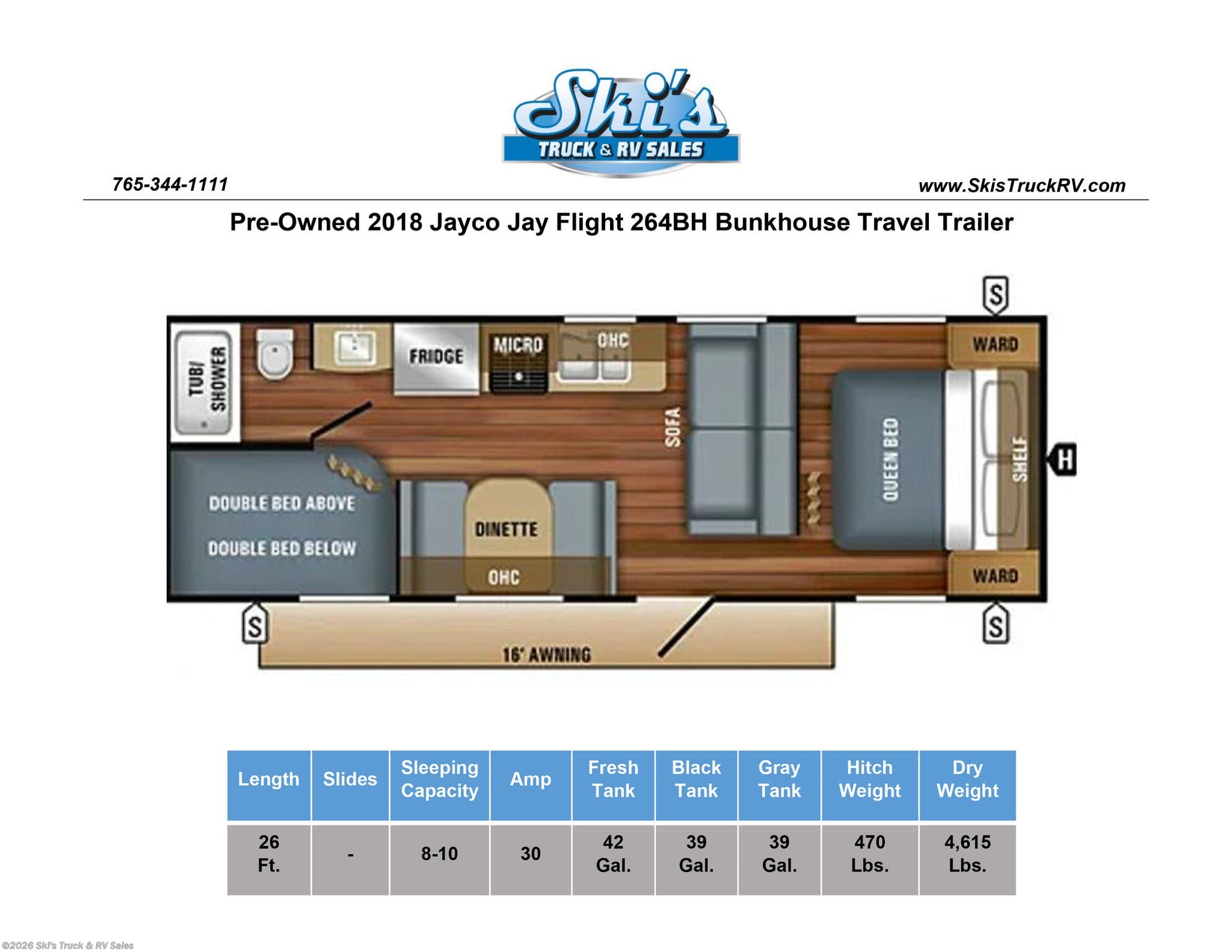 Pre-Owned 2018 Jayco Jay Flight 264BH Bunkhouse Travel Trailer; 26 Foot; Sleeps 8-10; Lightweight; Hitch Weight: 470 Lbs.; Dry Weight: 4615 Lbs.; 30 Amp; Manual Tongue and Stabilizer Jacks; 42 Gal. Fresh Water Cap.; 39 Gal. Black Water Cap.; 39 Gal. Gray Water Cap.; Two 20 Lbs. Propane Tanks; 13,500 BTU AC; 20,000 BTU Furnace; 6 C.F. Gas/Elec. Refrigerator; 6 Gal. Water Heater; Microwave; 3-Burner Stove/Oven; One TV Jack; 24 In. TV; AM/FM/CD/DVD; Speakers (Outside Speaker in Awning Arm Does Not Work; Price Reflects This); Pantry; Jack-knife Sofa; Queen Bed; One Bathroom with Shower/Tub Combo; 16 Foot Power Awning with LED Lights ; Outside Shower; Exterior Storage; Climate Package; Tinted Windows; Goodyear Tires; Spare Tire; Financing Available; Good Pre-Owned Bunkhouse Travel Trailer for the Price: $12,995. Call 765-344-1111 or visit us online at for more information and photos.