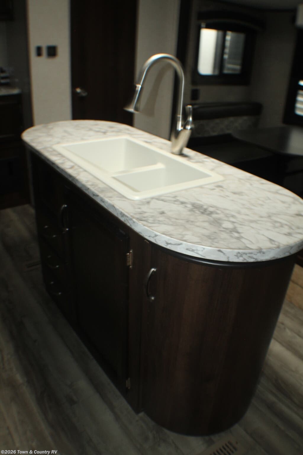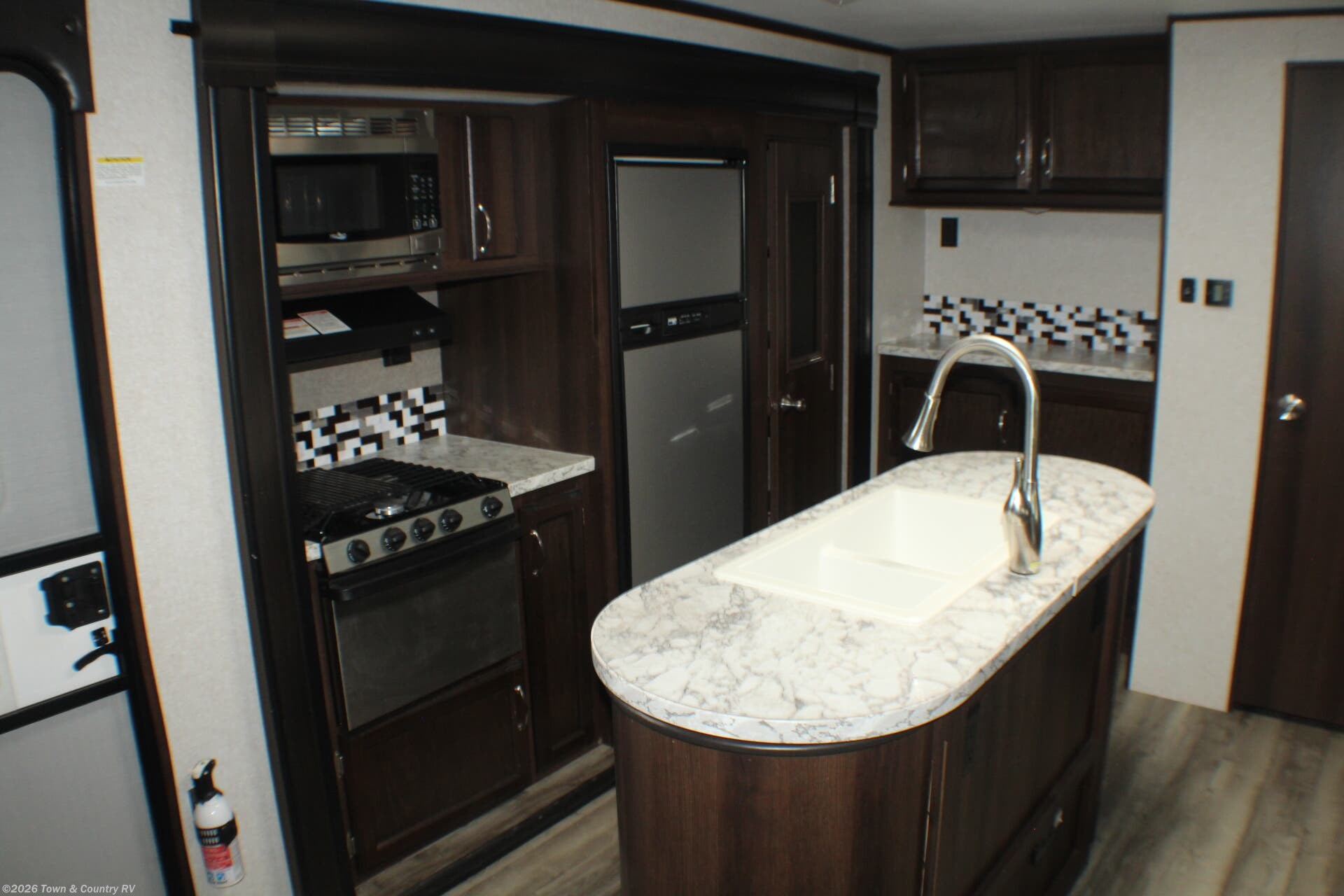 Front Bedroom - Front Bathroom - Back Bunks: 3 Slides, Air, Awning, Furnace, Back Ladder, Outside Kitchen, Outside Shower, TV, 2 Sofa/Beds, Kitchen Island, Booth Dinette, Double Sink, Oven/Stove, Microwave, Refrigerator, Pantry, Sleeps 9, GVWR: 10,950#, Unloaded Weight: 8,600#.