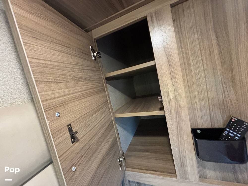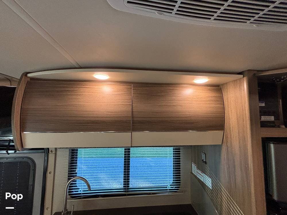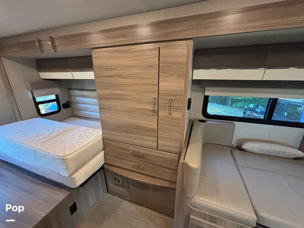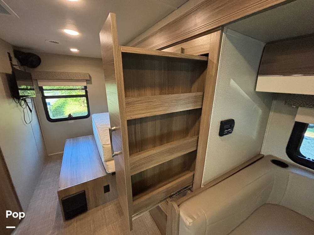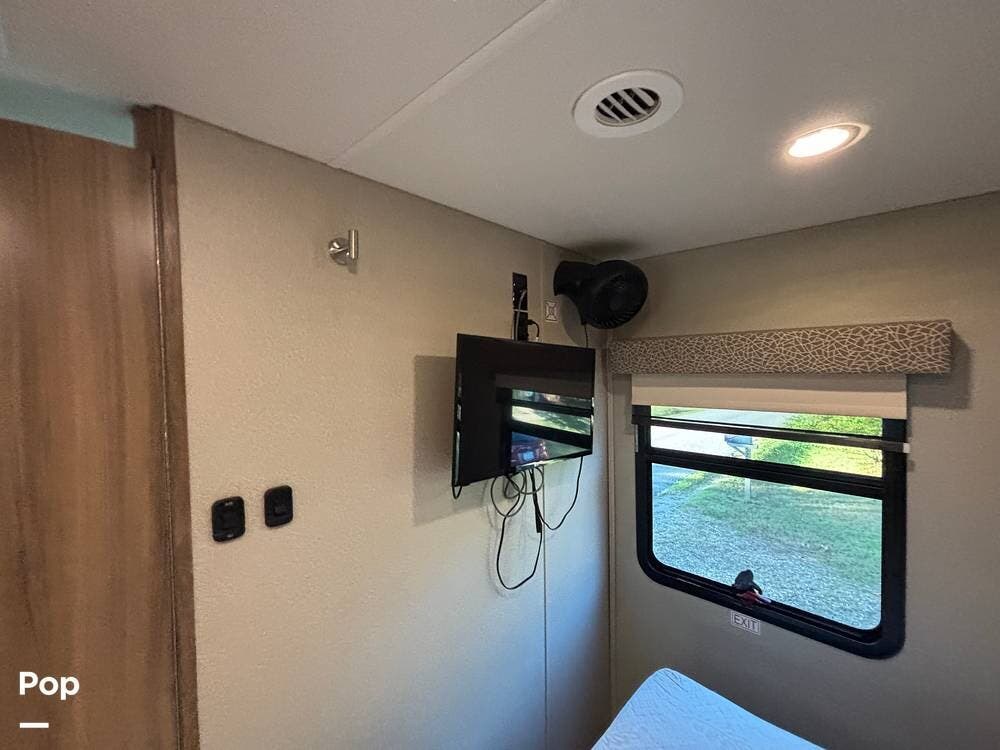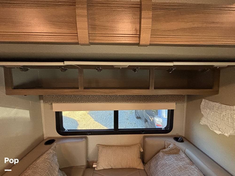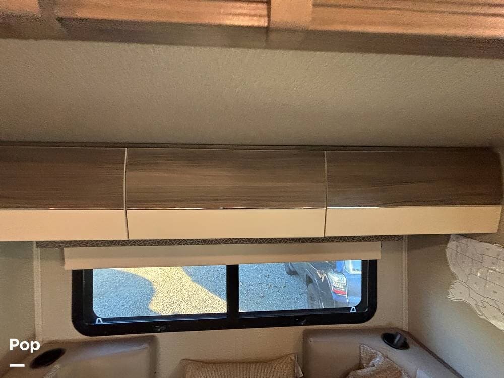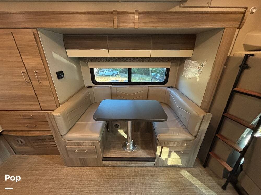 Inside, the living area welcomes you with a booth dinette that doubles as additional sleeping space when needed. Large windows let in plenty of natural light, and overhead cabinetry provides convenient storage for everyday items. The entertainment system is thoughtfully placed so you can enjoy shows or movies while relaxing after a day on the road.