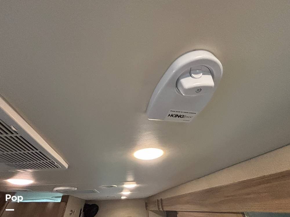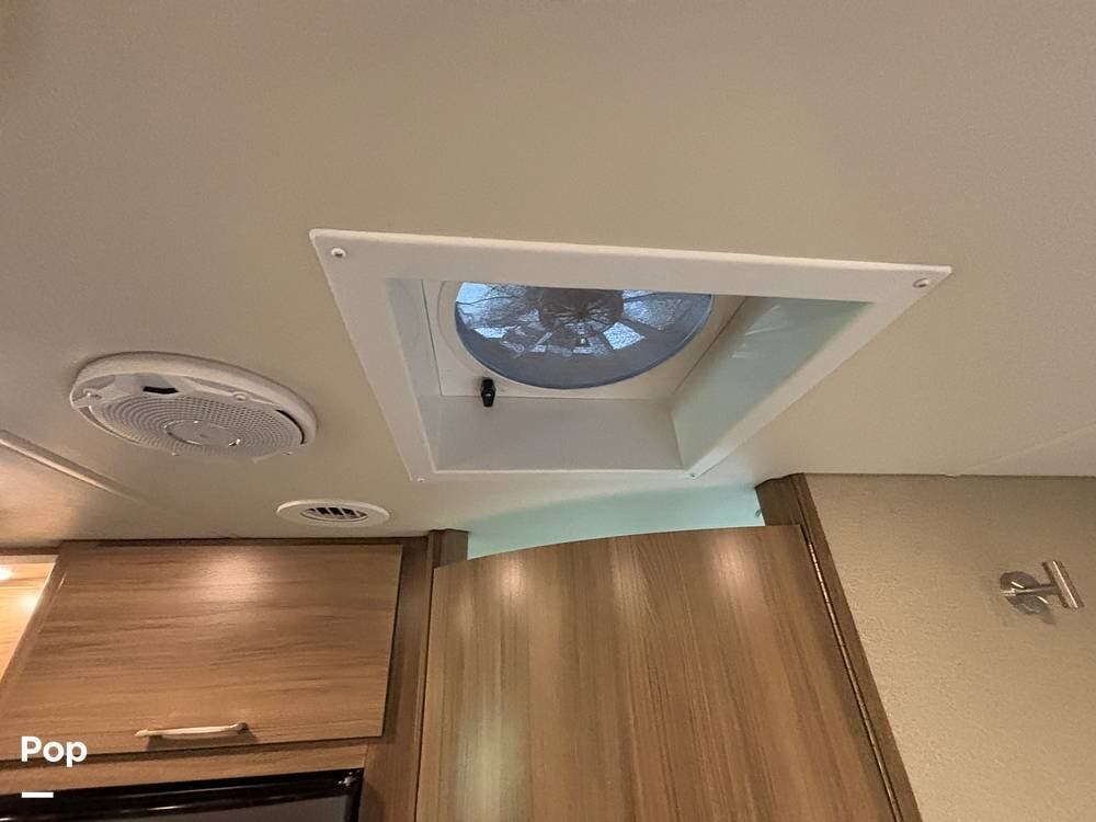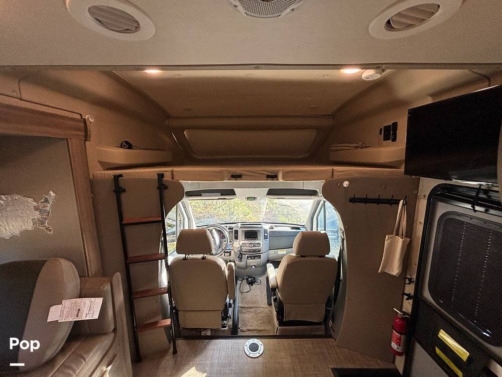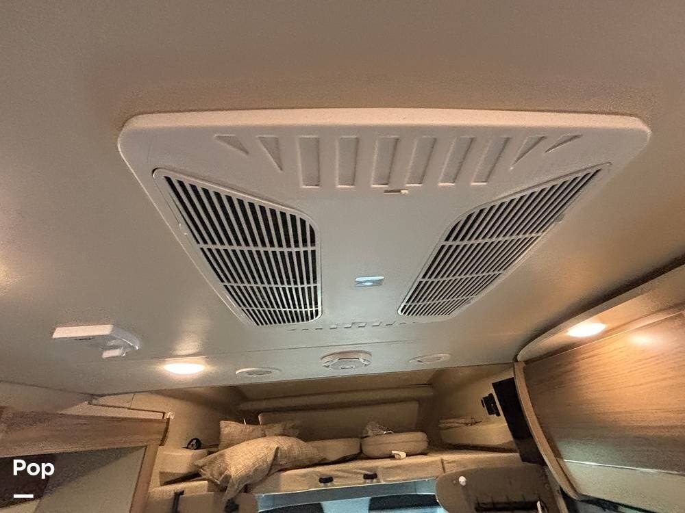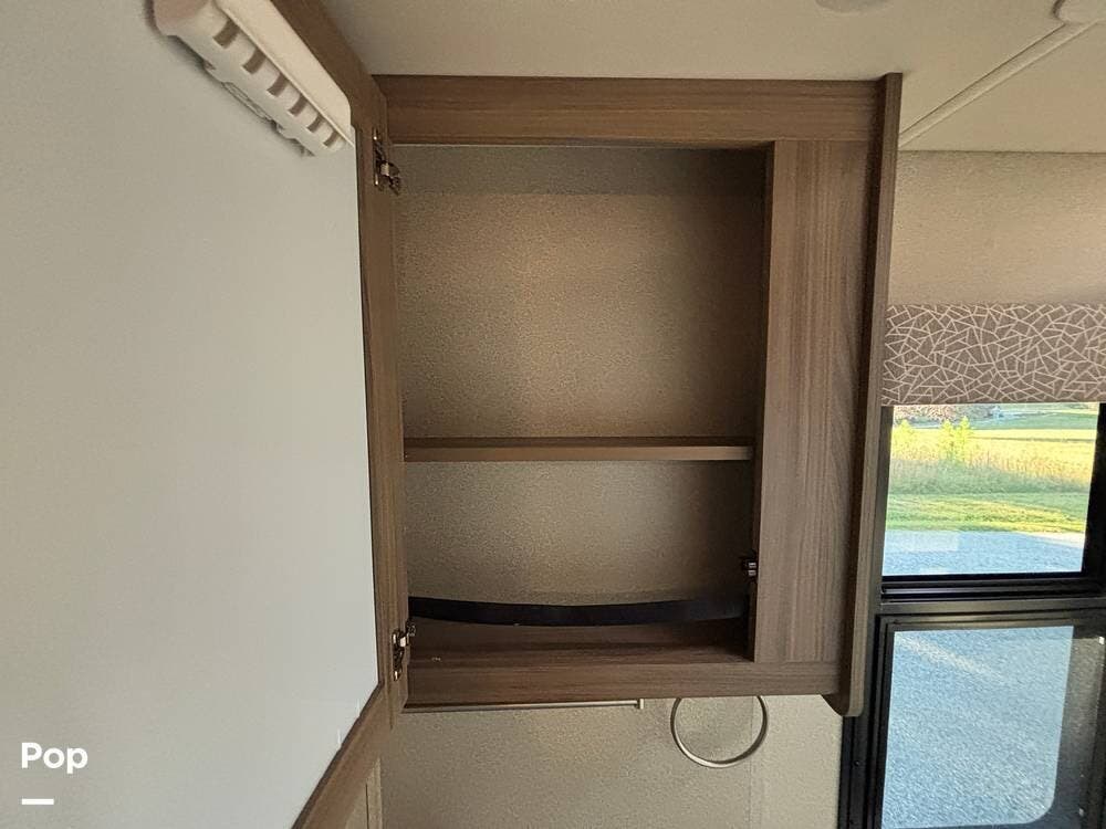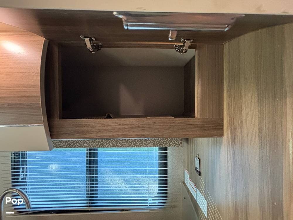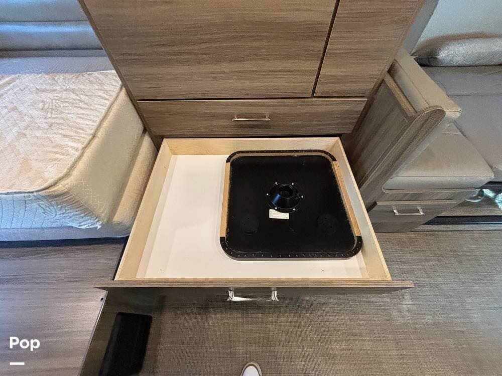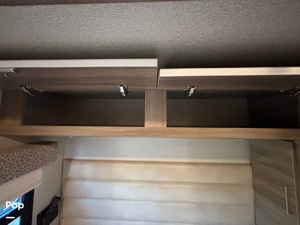 Inside, the living area welcomes you with a booth dinette that doubles as additional sleeping space when needed. Large windows let in plenty of natural light, and overhead cabinetry provides convenient storage for everyday items. The entertainment system is thoughtfully placed so you can enjoy shows or movies while relaxing after a day on the road.