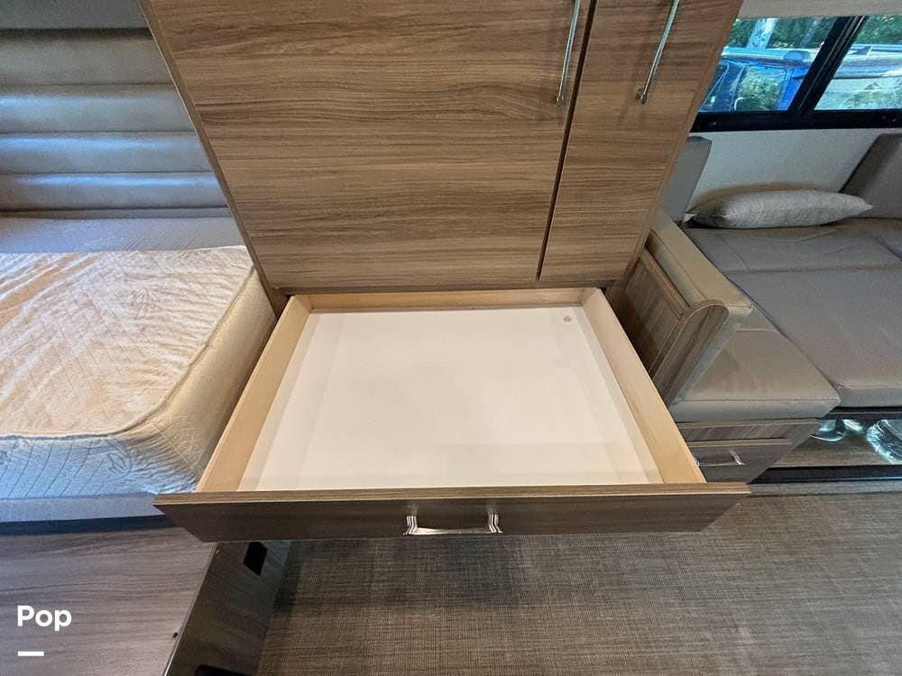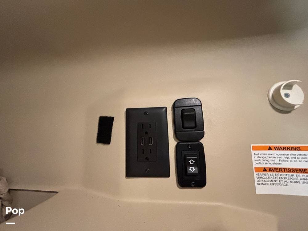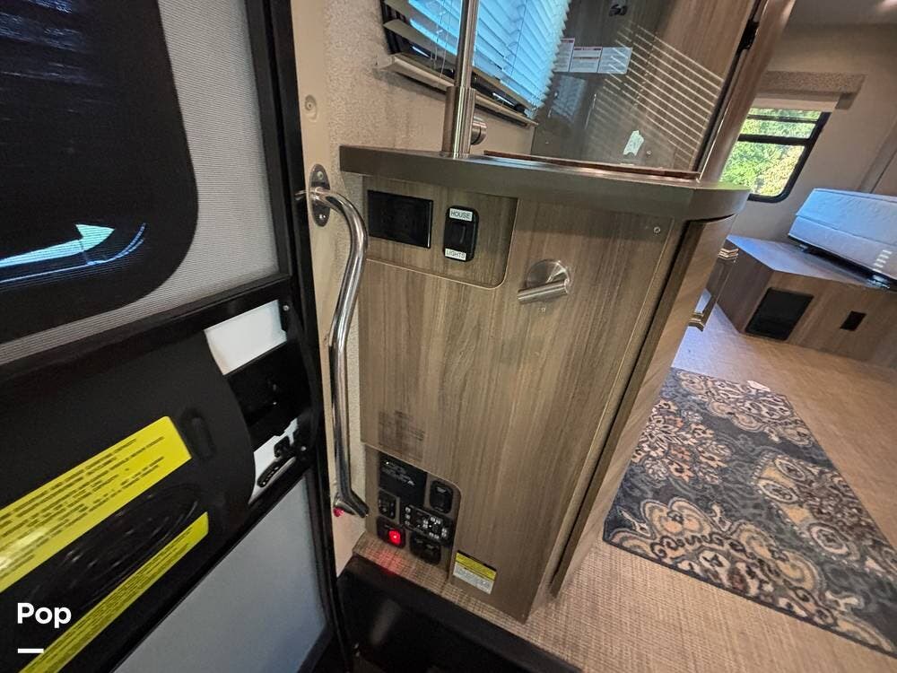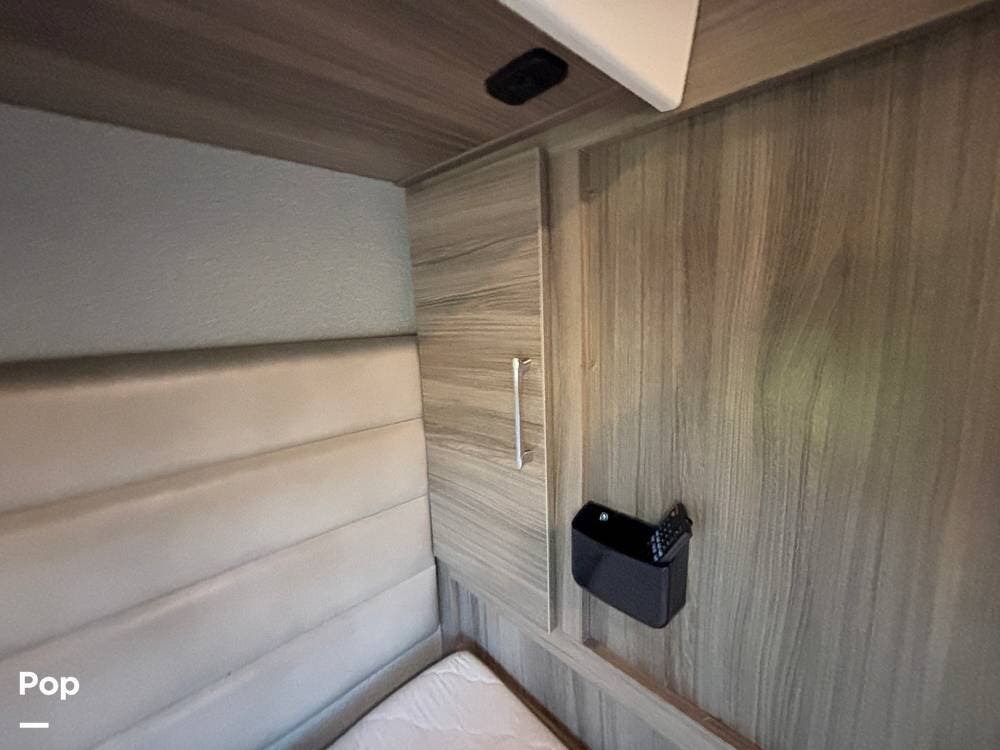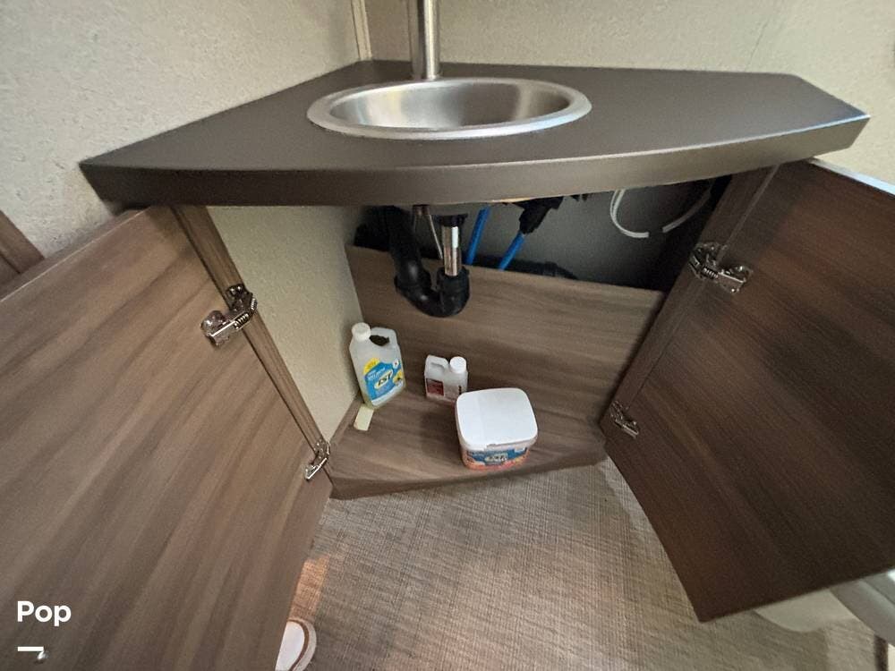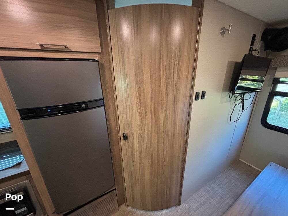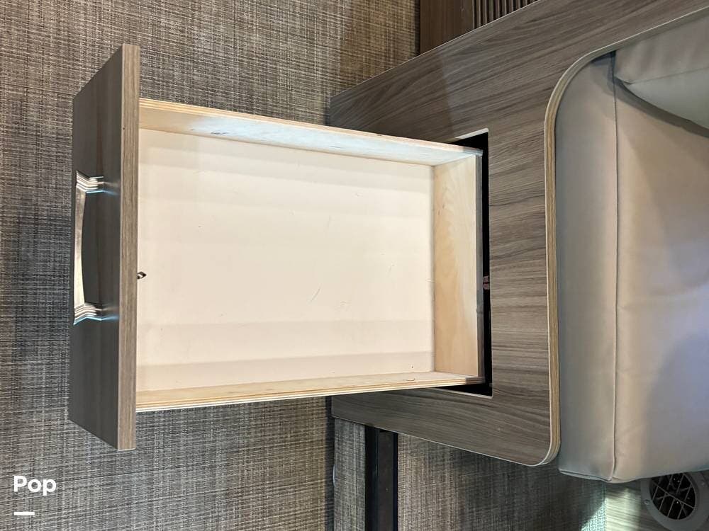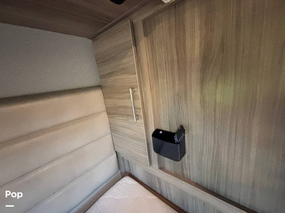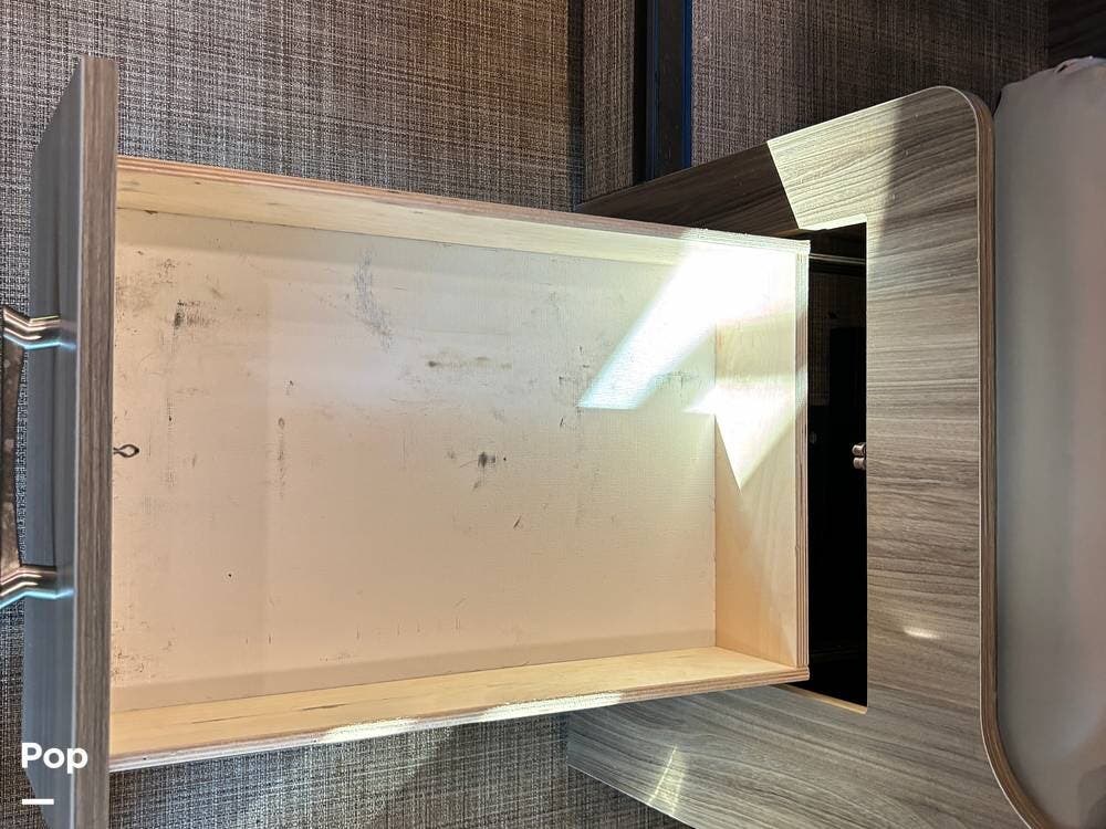 Inside, the living area welcomes you with a booth dinette that doubles as additional sleeping space when needed. Large windows let in plenty of natural light, and overhead cabinetry provides convenient storage for everyday items. The entertainment system is thoughtfully placed so you can enjoy shows or movies while relaxing after a day on the road.