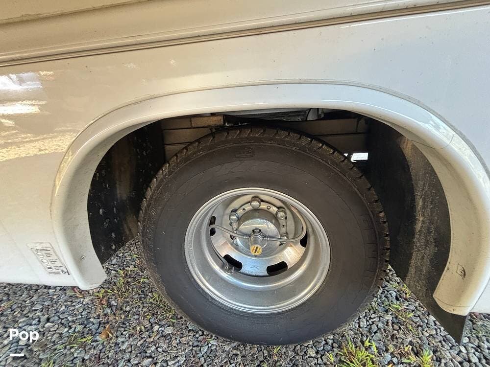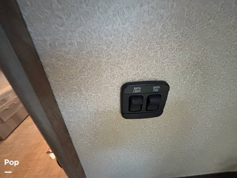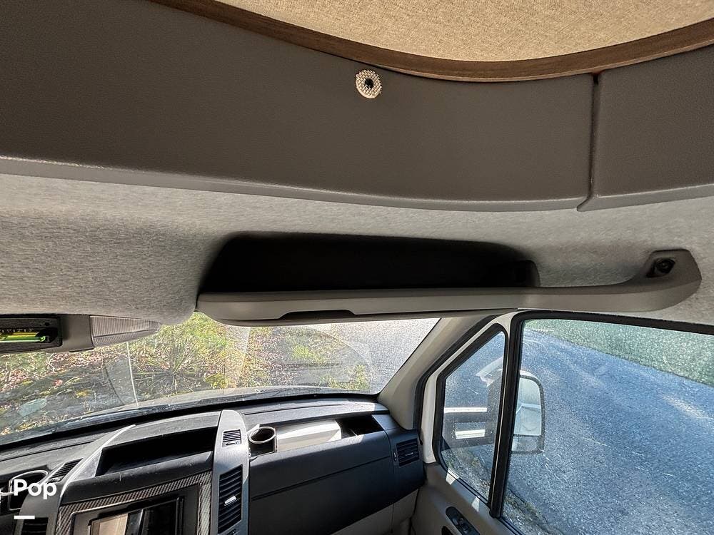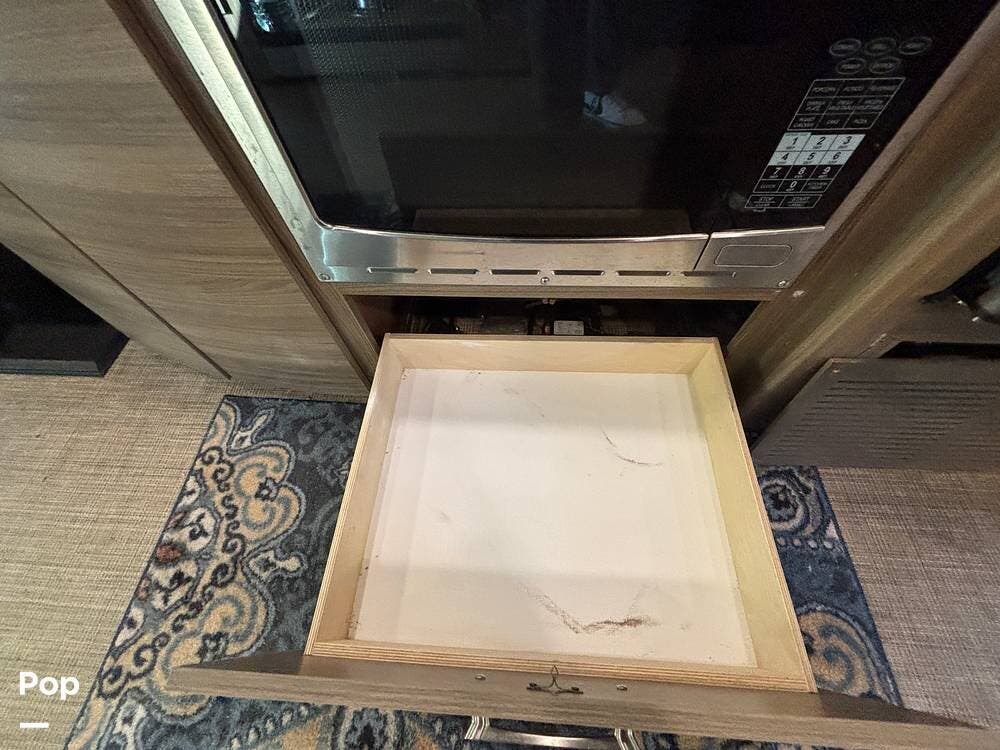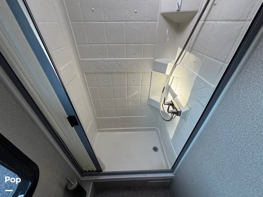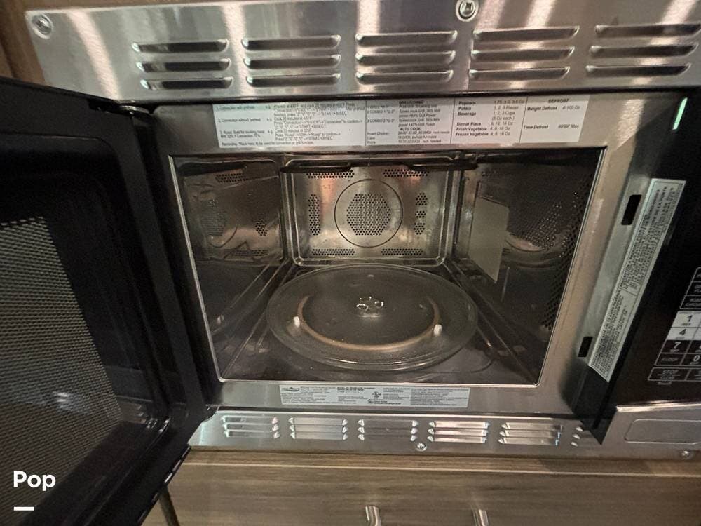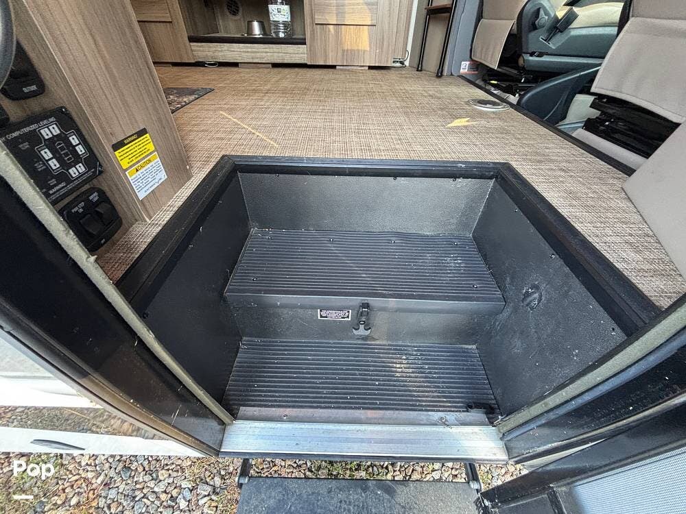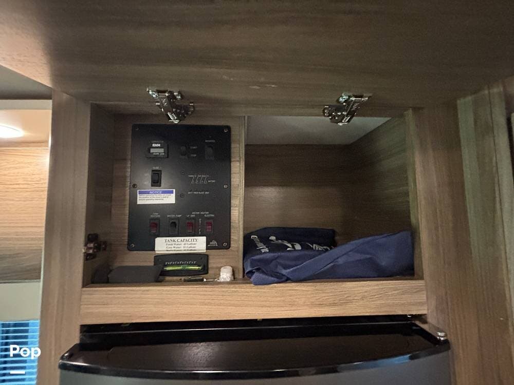 Inside, the living area welcomes you with a booth dinette that doubles as additional sleeping space when needed. Large windows let in plenty of natural light, and overhead cabinetry provides convenient storage for everyday items. The entertainment system is thoughtfully placed so you can enjoy shows or movies while relaxing after a day on the road.