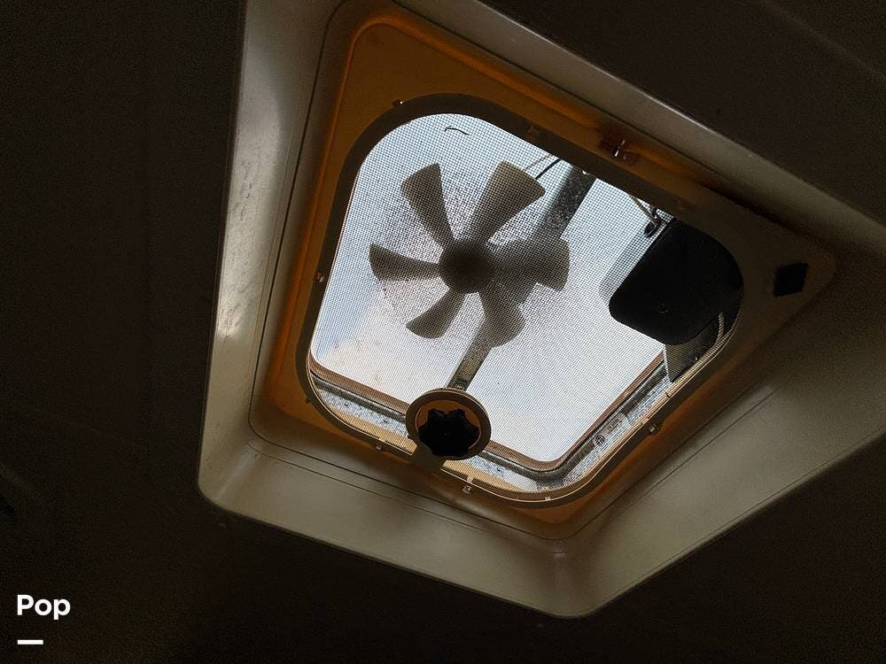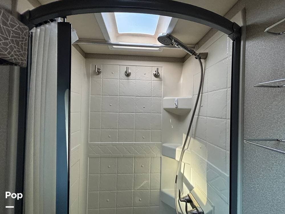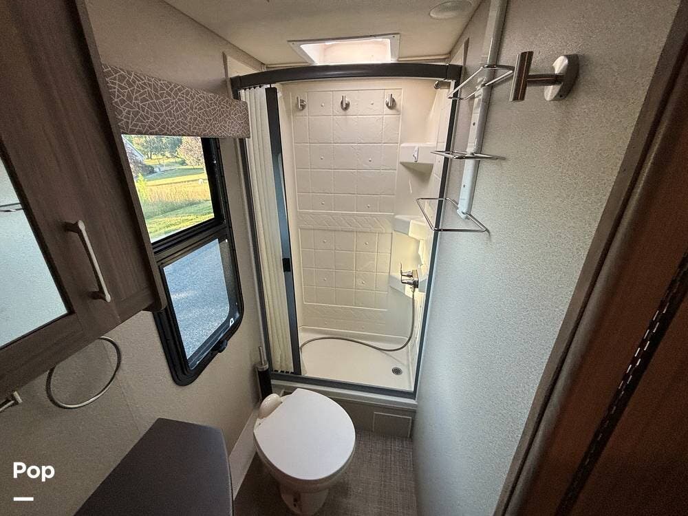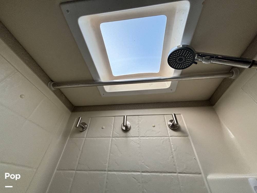 The bathroom is compact yet fully functional, featuring a shower with a skylight that brings in natural light and provides extra headroom. A porcelain toilet and vanity with sink are also included, along with mirrored medicine storage for your personal toiletries. With its efficient layout, the bathroom is easily accessible and designed to maximize the available space.