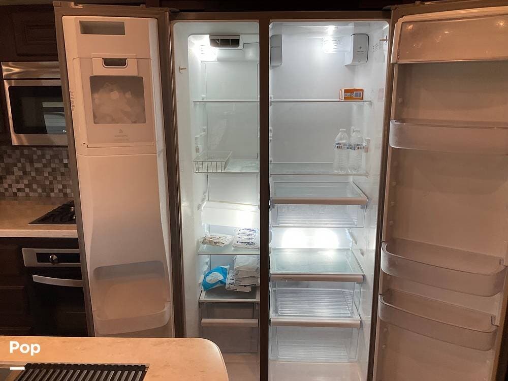 To the rear is the full-size kitchen and living room, featuring a fireplace, a couch, and a theater.