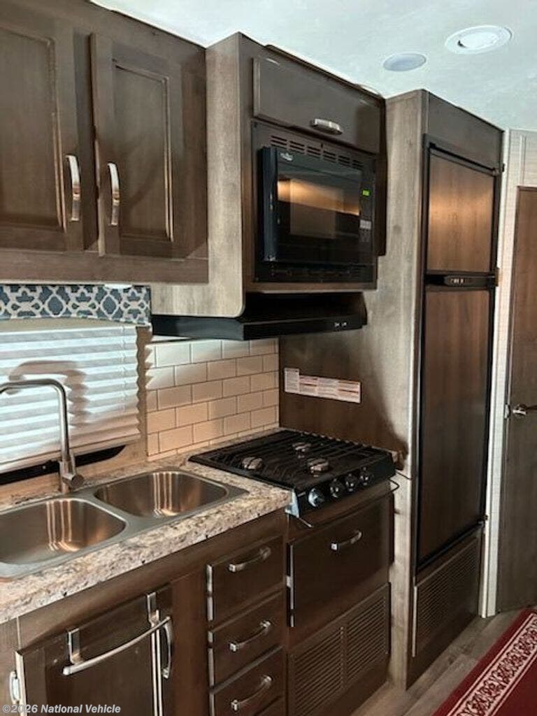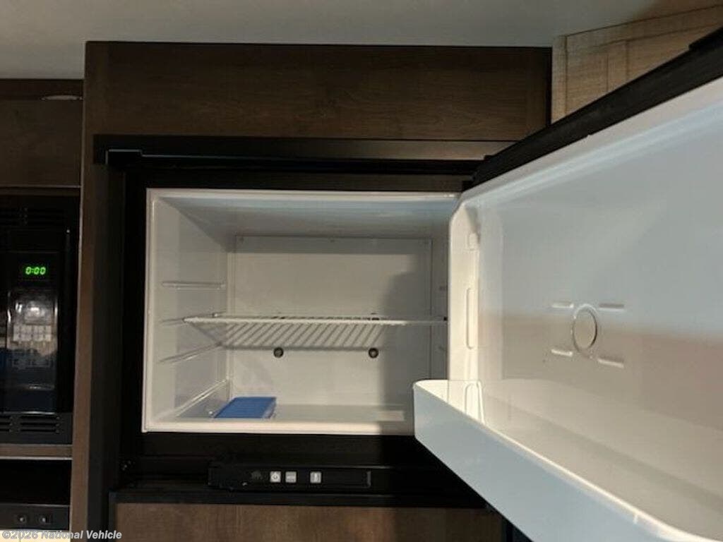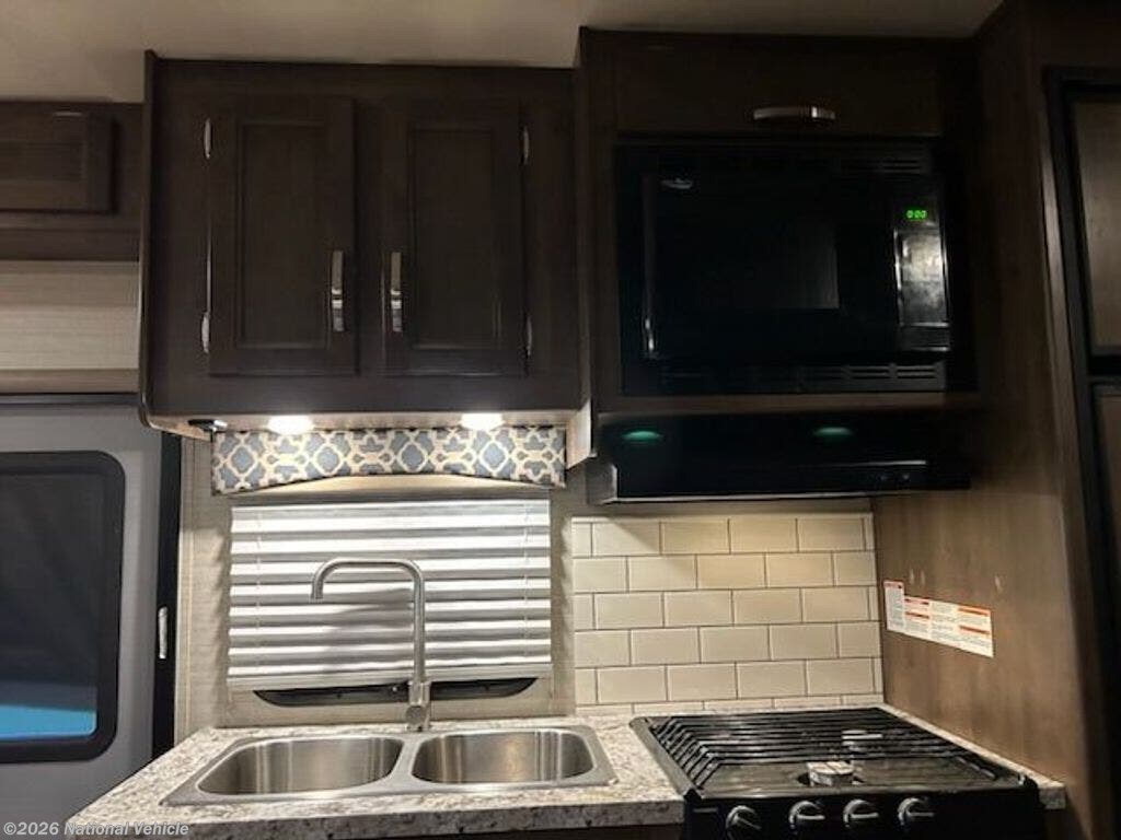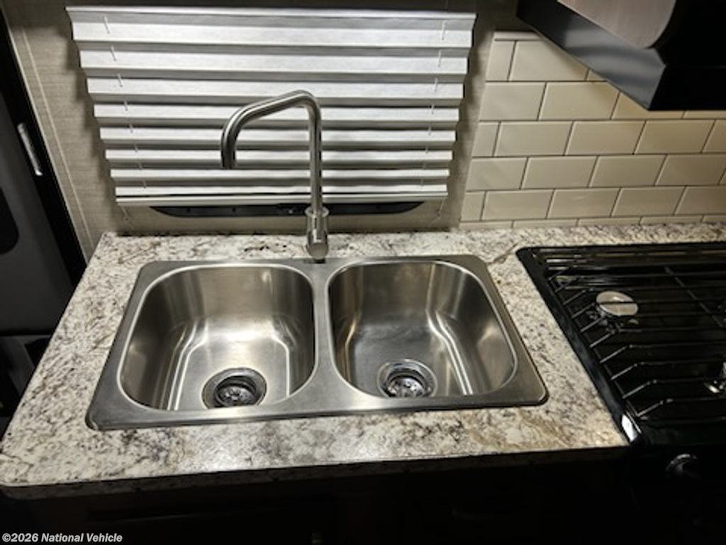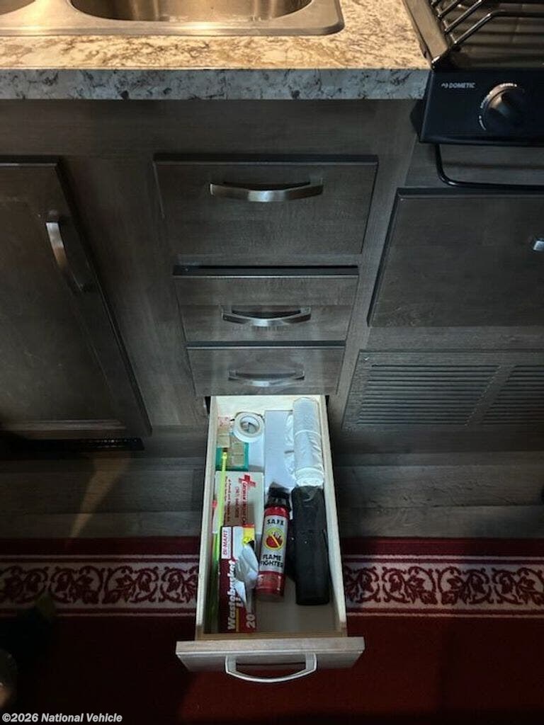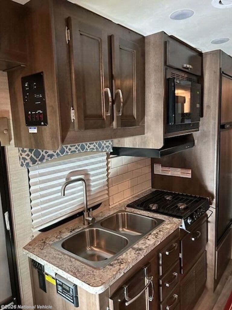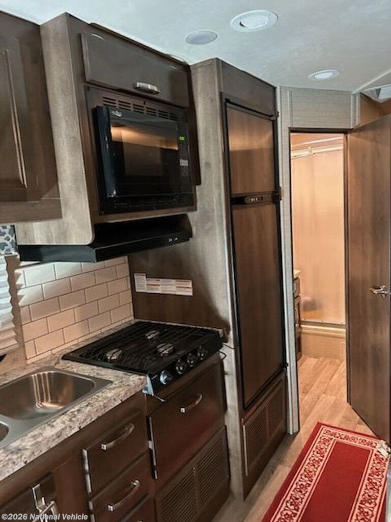 Inside, the thoughtfully designed floorplan maximizes comfort and functionality. A spacious slide-out expands the main living area, providing room for a comfortable dinette and lounge space. The fully equipped kitchen includes a three-burner cooktop, convection microwave, refrigerator, and ample cabinetry so you can easily prepare meals on the road. Recessed LED lighting and generous storage throughout create a bright, organized living environment.