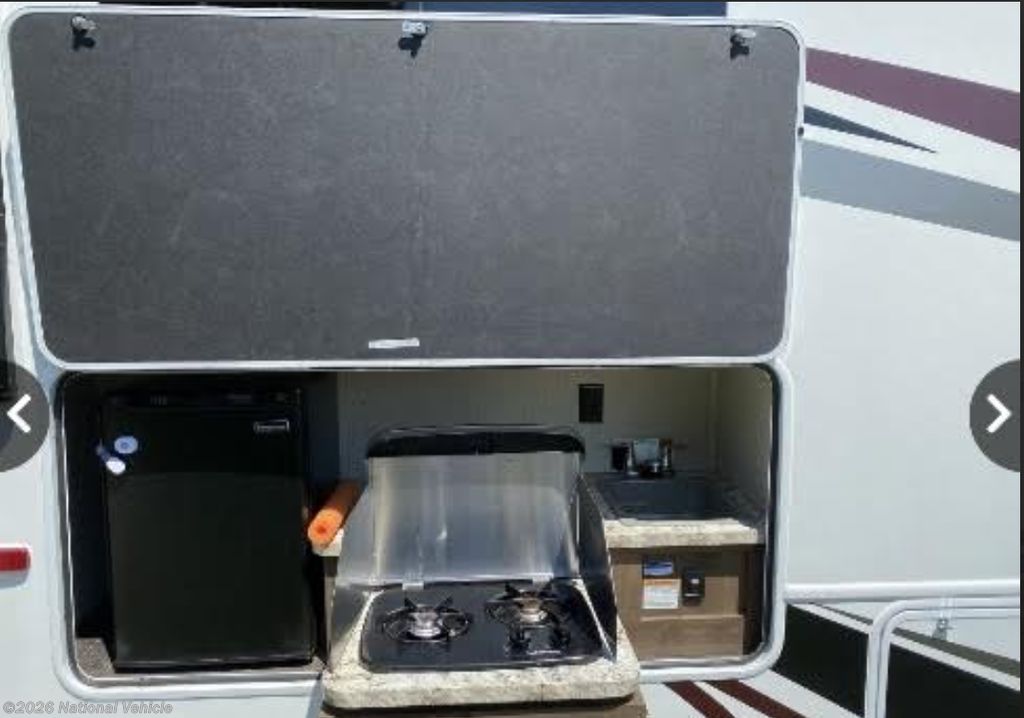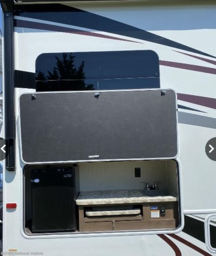 Outside, enjoy effortless setup and relax under the 18? electric awning. The fully equipped outdoor kitchen-featuring a stove, sink, and refrigerator-makes entertaining easy, while the rear video camera ensures stress-free maneuvering and parking.