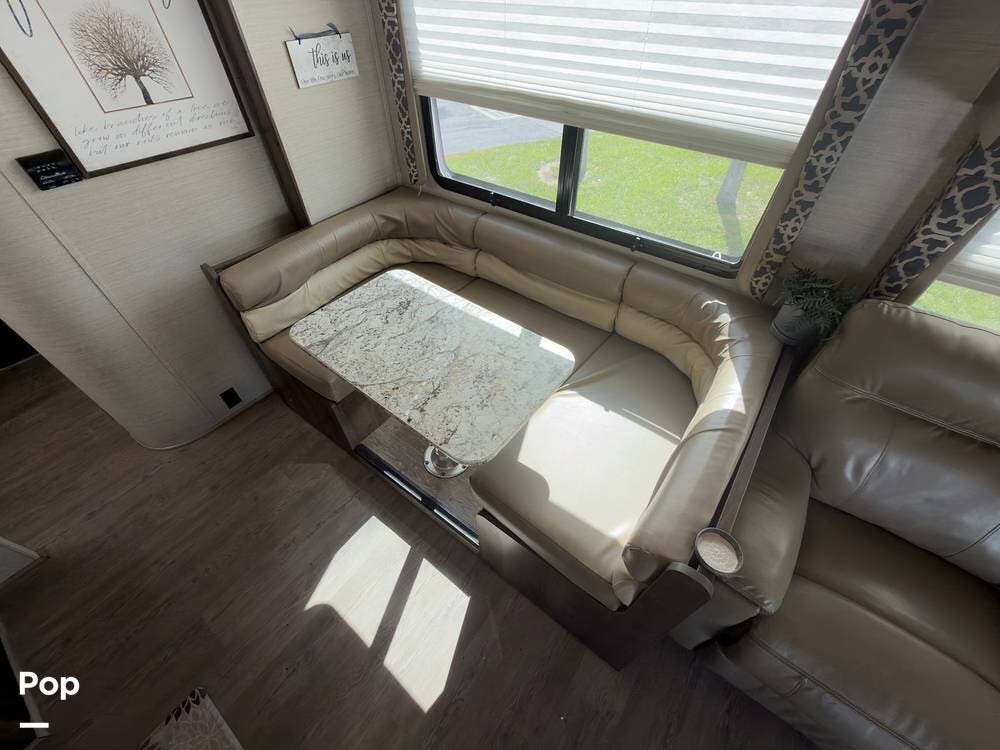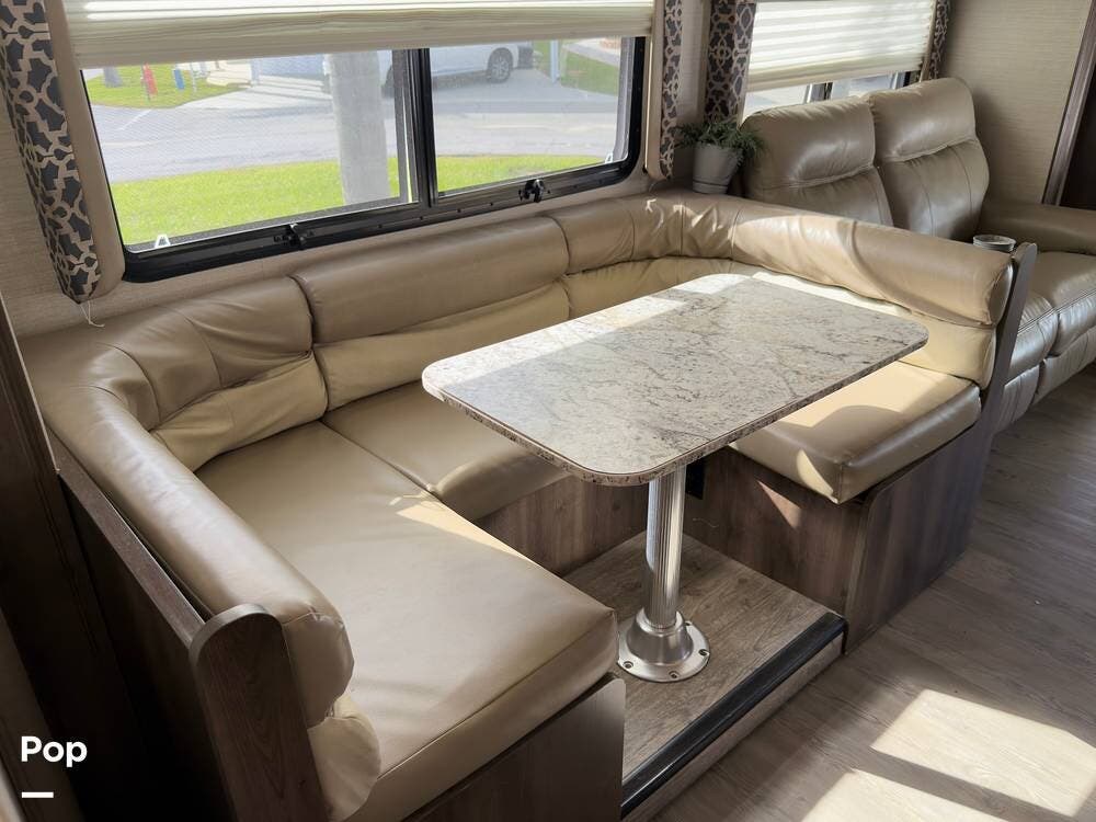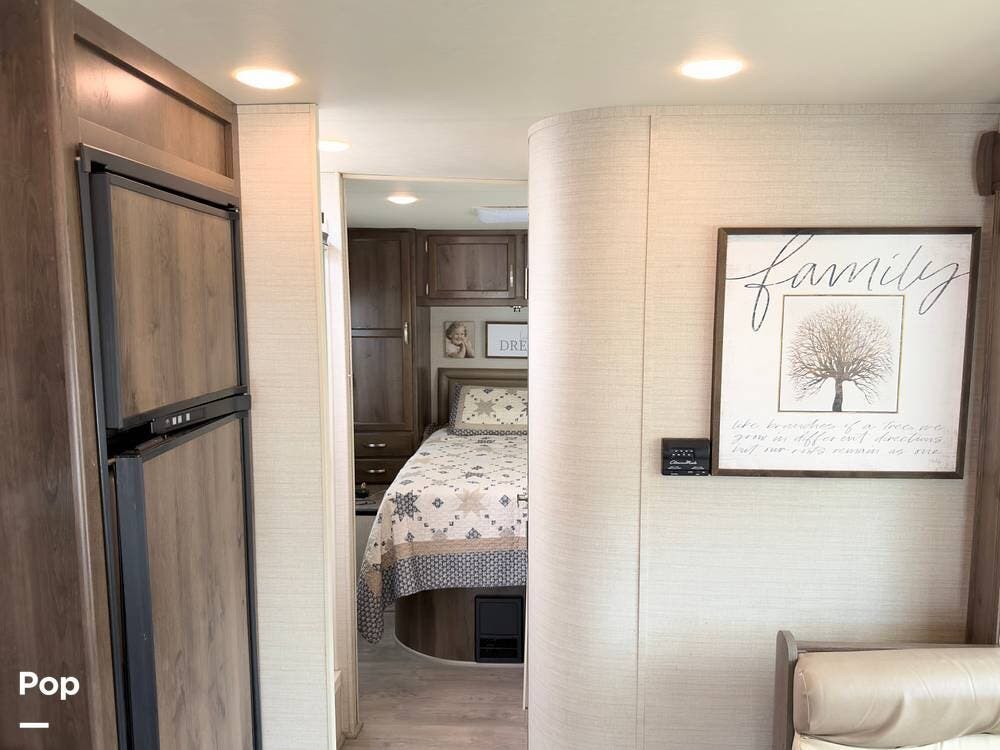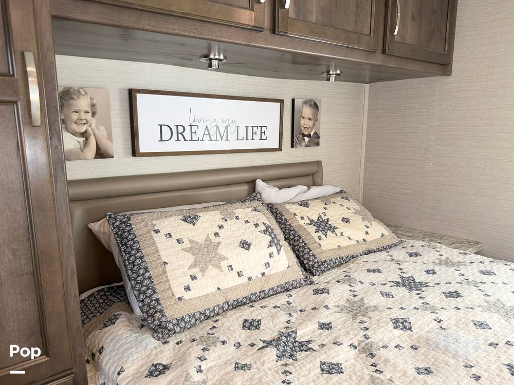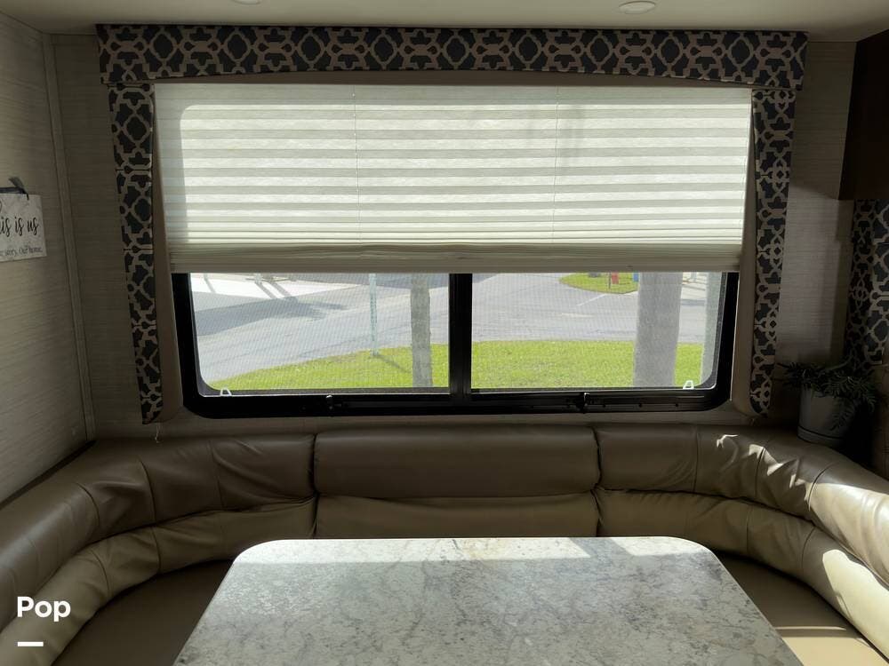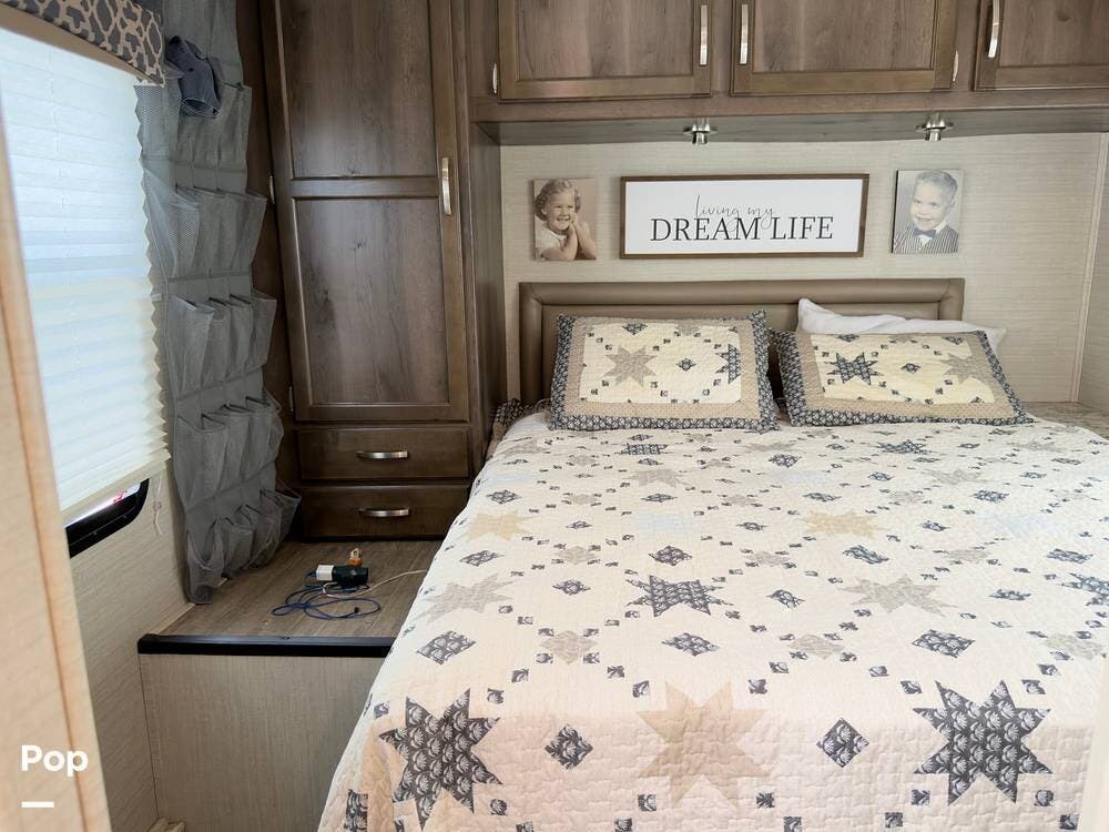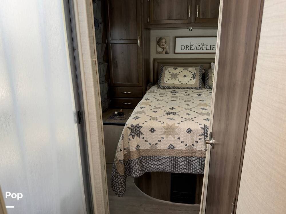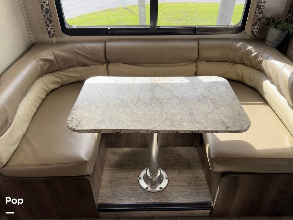 It features a spacious layout with a single large slideout, providing plenty of room to relax. Sleeping arrangements include a queen bed, a sleeper sofa, a U-shaped dinette sleeper, and an over-cab bunk, ideal for families or guests.