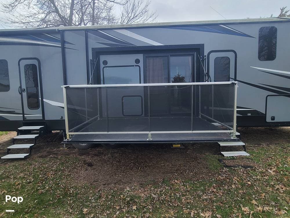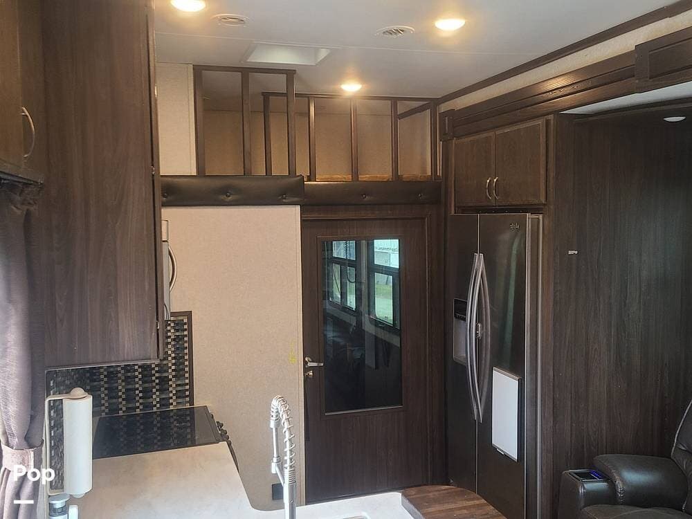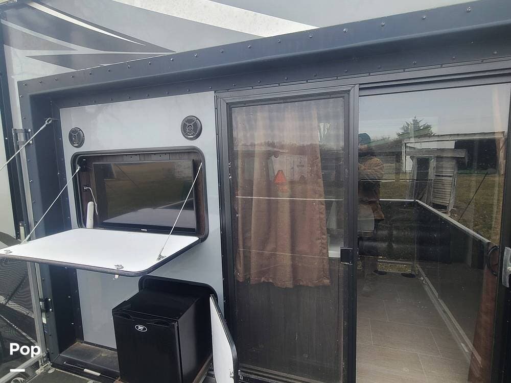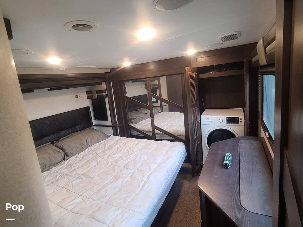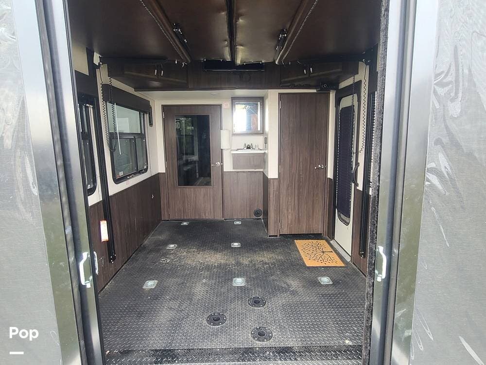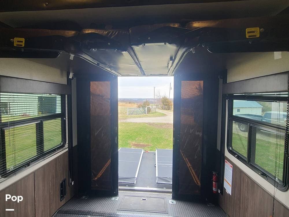 As a toy hauler, this model has a dedicated garage area at the rear, allowing for easy loading and unloading of recreational vehicles. The garage area has tie-downs and additional sleeping space.