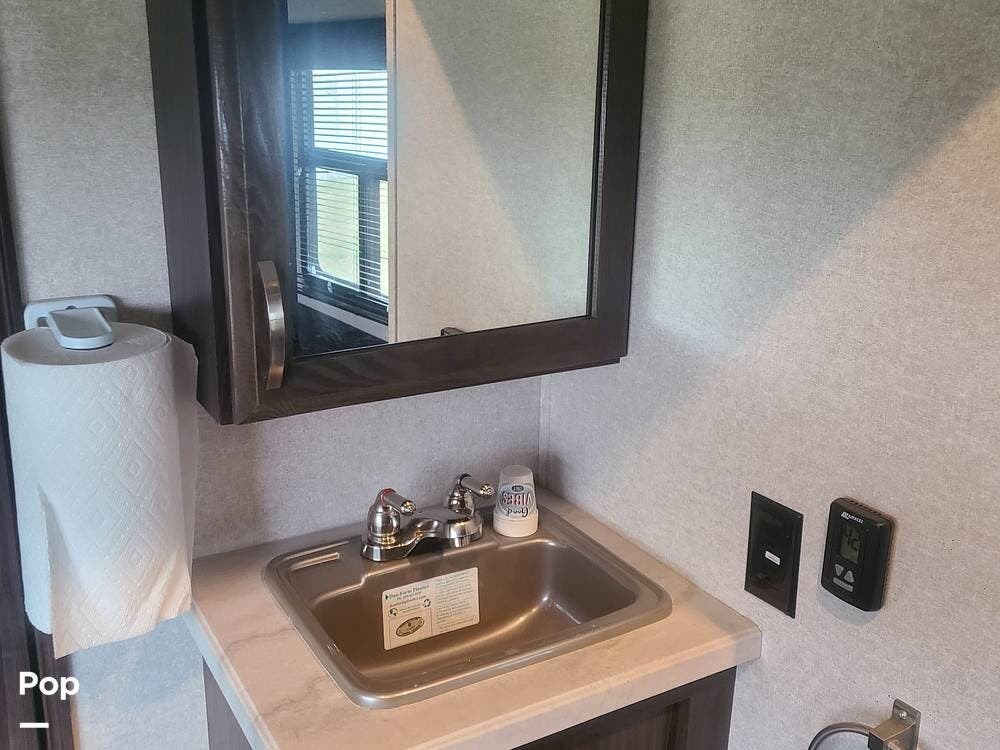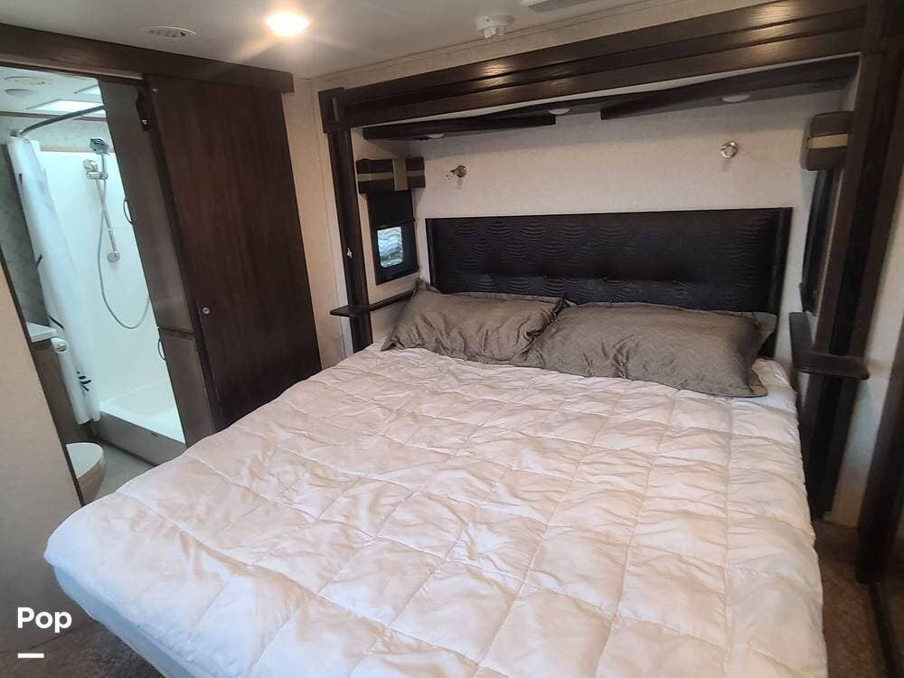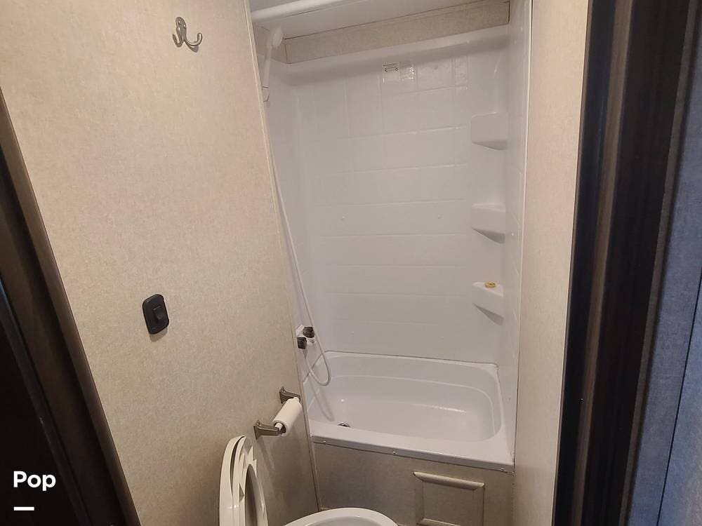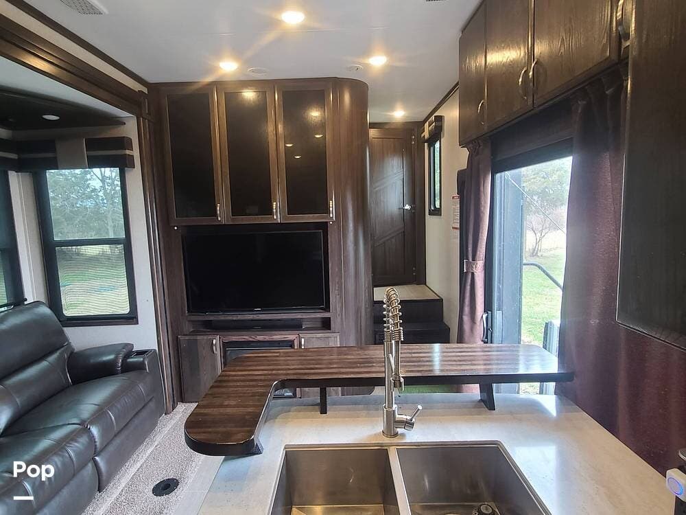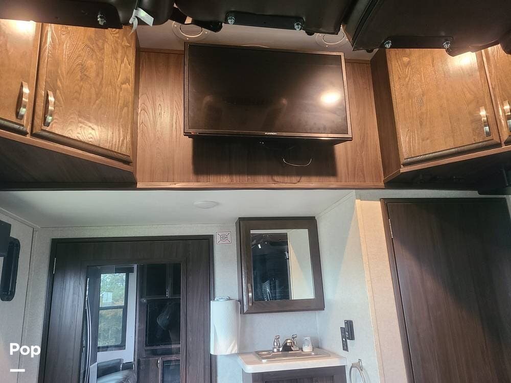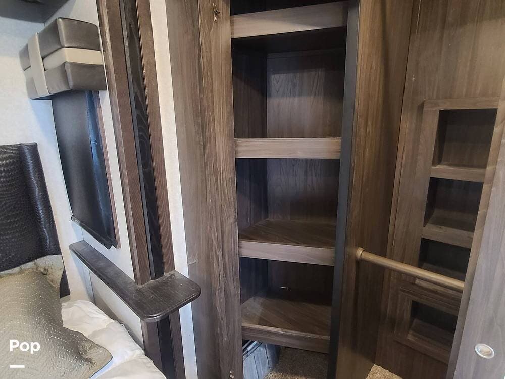 As a toy hauler, this model has a dedicated garage area at the rear, allowing for easy loading and unloading of recreational vehicles. The garage area has tie-downs and additional sleeping space.