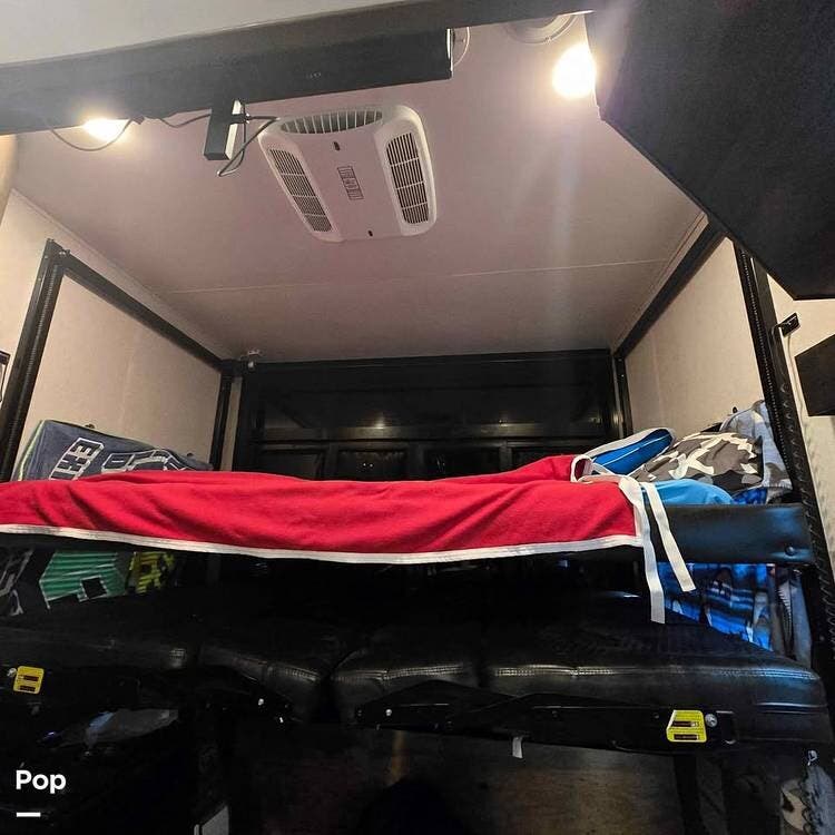 For those bringing along extra gear or toys, the garage is equipped with a durable rubberized floor liner, a steel frame with D-rings for secure transport, and a powered overhead bunk for added versatility. Overhead drop-down beds, too!