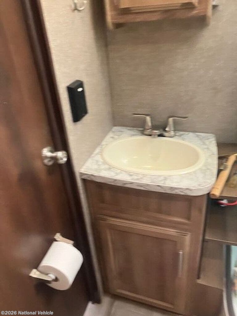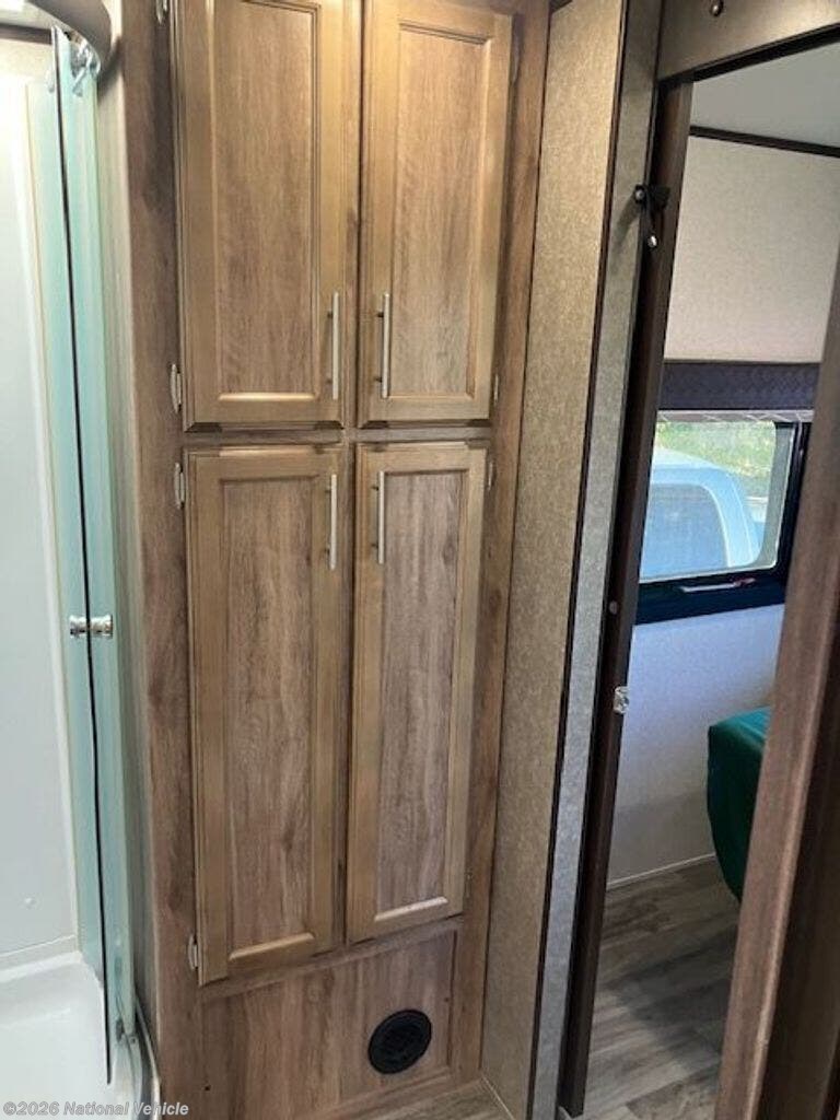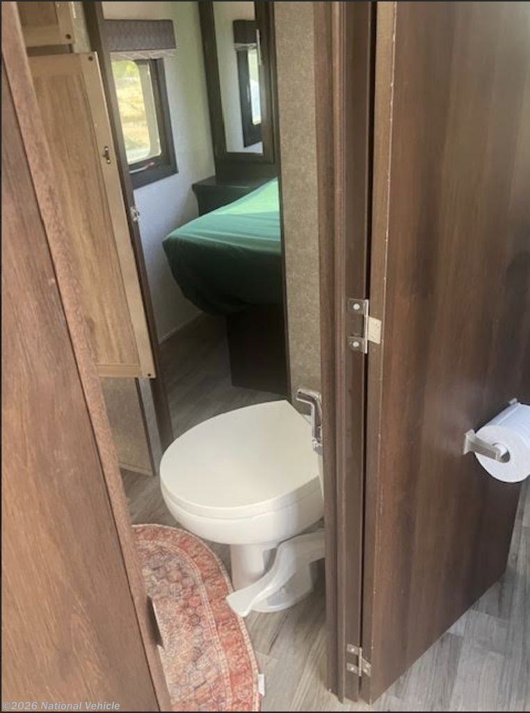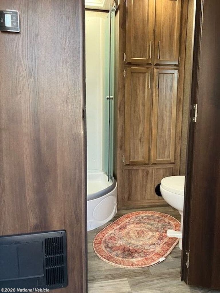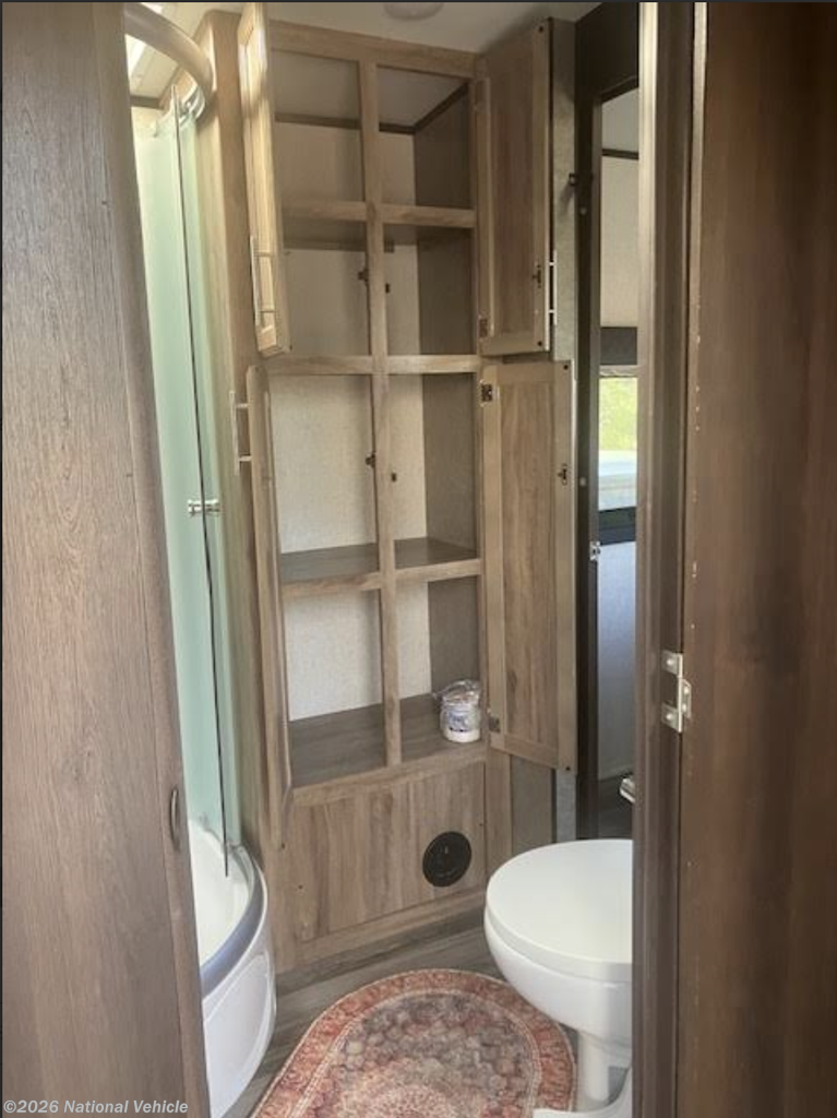 The private master suite is positioned for maximum privacy and relaxation, offering a comfortable retreat at the end of the day. The bathroom impresses with a huge closet, additional shelving, and excellent storage rarely found in a travel trailer of this class. Throughout the interior, all windows are equipped with operational blackout shades, allowing complete control of light and privacy.