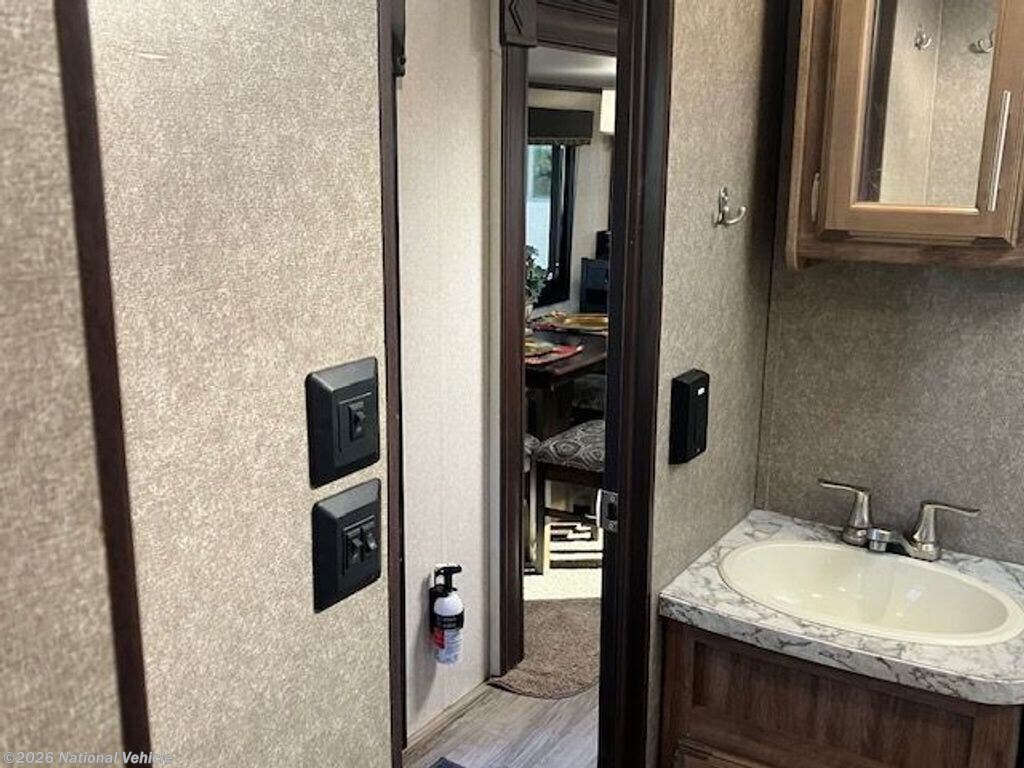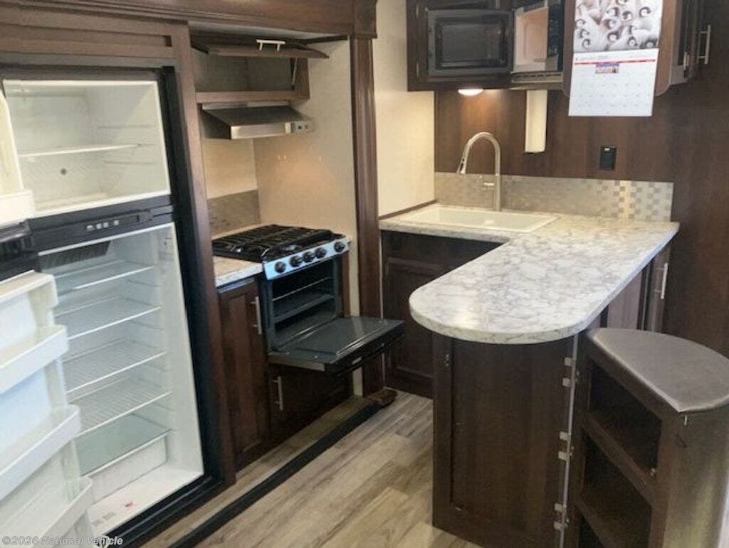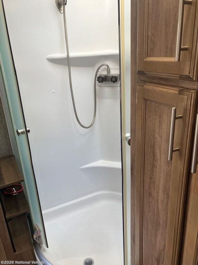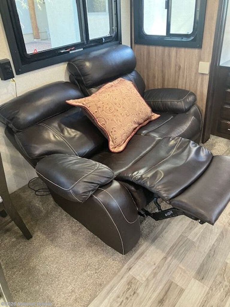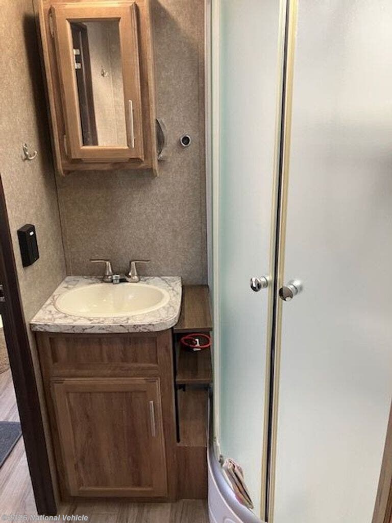 The private master suite is positioned for maximum privacy and relaxation, offering a comfortable retreat at the end of the day. The bathroom impresses with a huge closet, additional shelving, and excellent storage rarely found in a travel trailer of this class. Throughout the interior, all windows are equipped with operational blackout shades, allowing complete control of light and privacy.