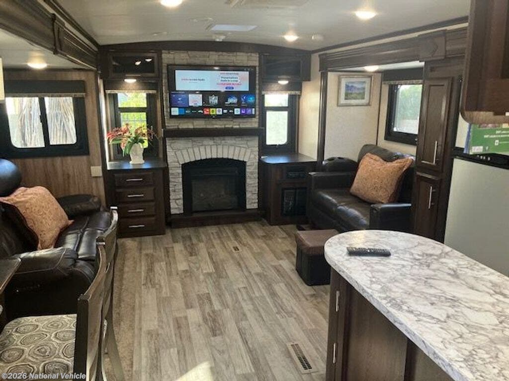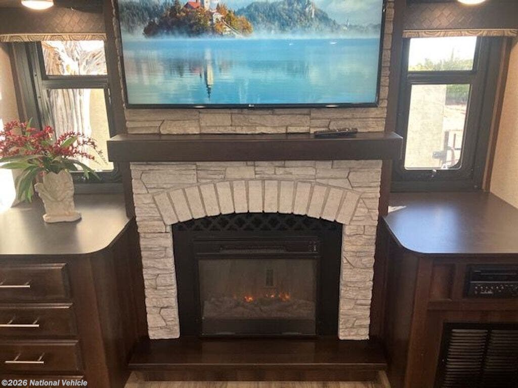 The rear entertainment living area is the heart of the coach, featuring a 39" LED TV paired with an electric fireplace that also functions as a heater, setting the tone for cozy evenings and all-season comfort. Opposite the main sofa is a double power recliner, providing premium lounging, while the sofa easily converts into a full double bed, offering flexible sleeping accommodations for guests.