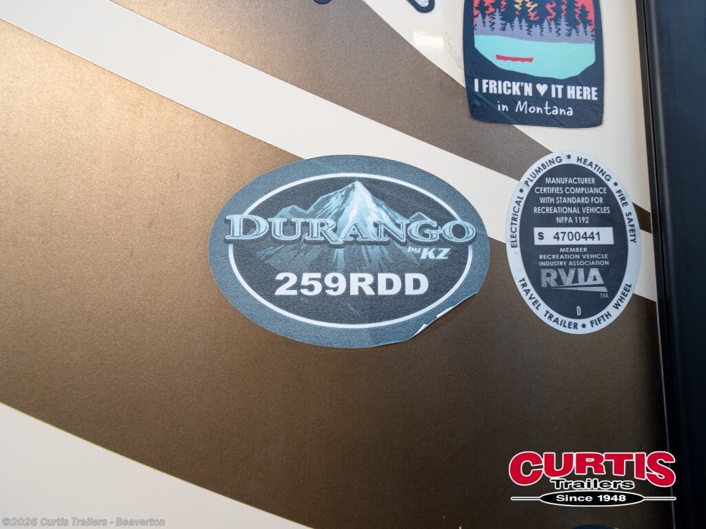 KZ Durango 1500 fifth wheel D259RDD highlights: U-Shaped Dinette 20 Electric Awning 8 CU FT Refrigerator Sleeps Six Two slides are what provide the extra space needed for this Durango 1500 fifth wheel to sleep six people during each of your travels. Whether you spend your night on the queen-size bed in the master bedroom, the U-shaped dinette, or the sleeper sofa, you will wake up rejuvenated and refreshed for the day ahead, and after feeling the warmth of the morning sun streaming through the shower skylight as you get ready, you will truly be ready to tackle any adventure that comes your way. Each Durango 1500 lightweight luxury fifth wheel by KZ includes Dexter Axles with self-adjusting brakes and Equa-Flex rubberized suspension for a smooth ride to any destination, and the fully heated and enclosed underbelly ensures that your tanks will stay warm enough so that you will always have running water even during the cooler seasons. The fully-finished, heated and sealed basement storage compartment will be able to hold all of your larger travel items in a safe environment that won t allow water to damage any of your valuables, and the 50 AMP service that has been included in the Durango 1500 makes it possible for you to enjoy your favorite electrical components no matter where you ve chosen to get away.