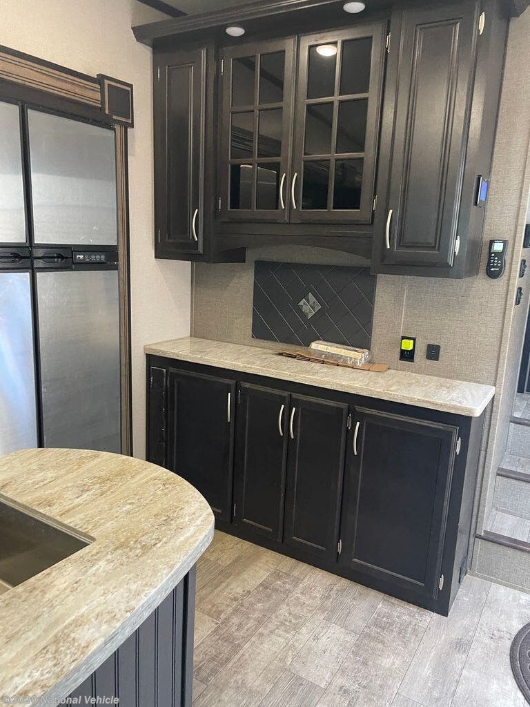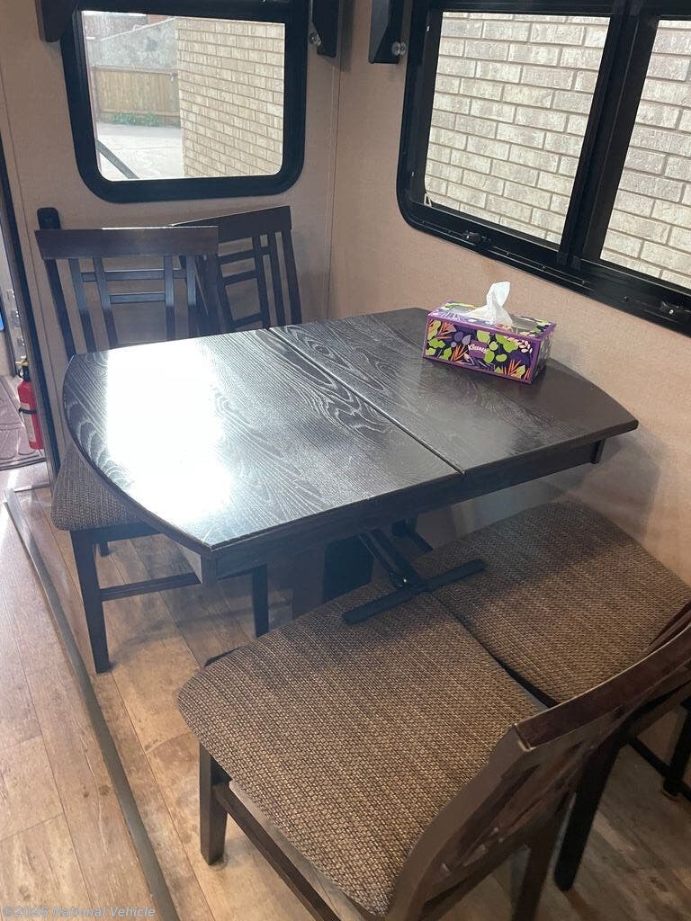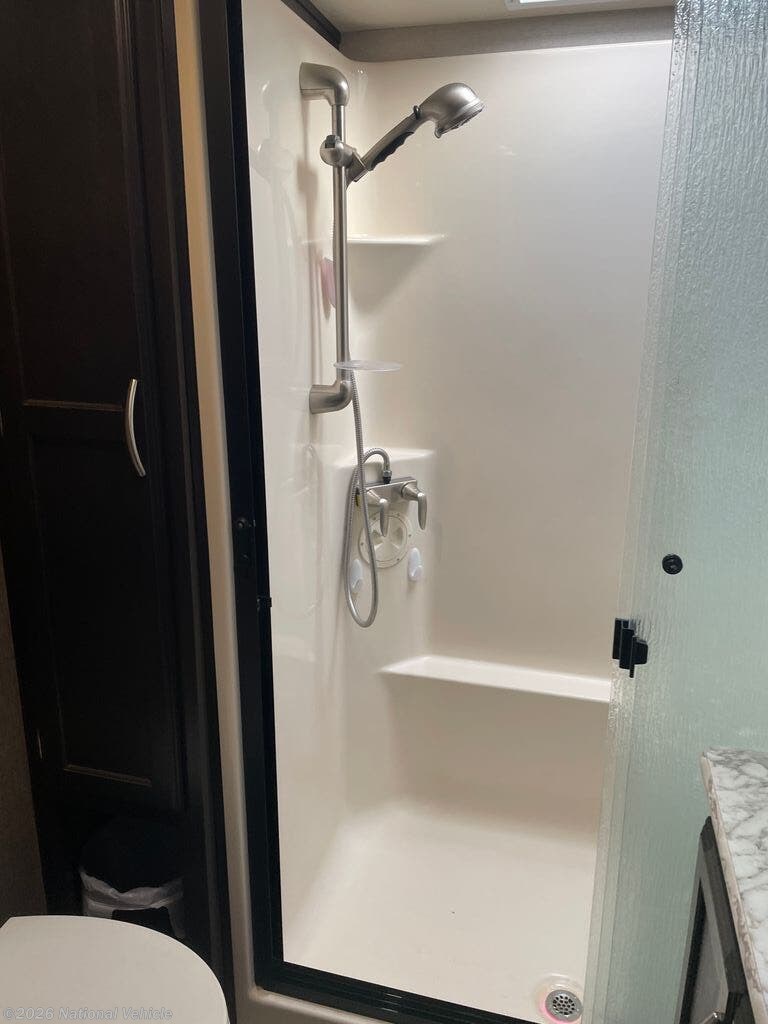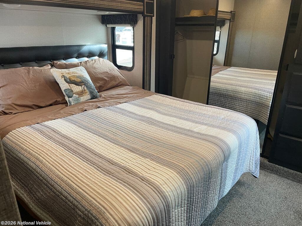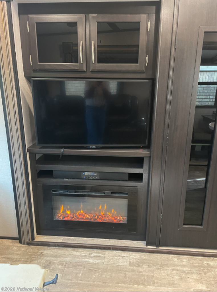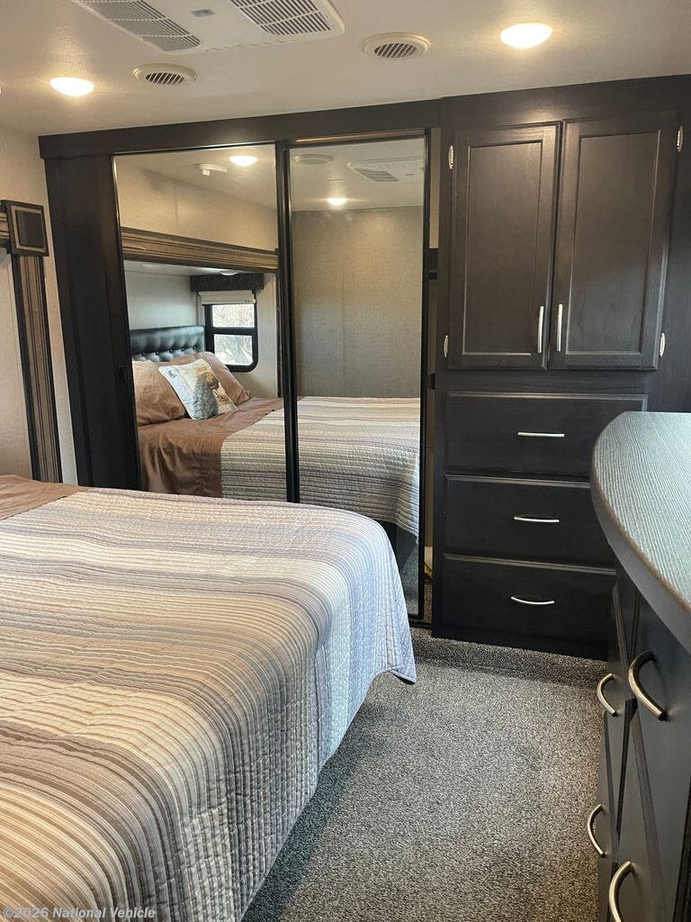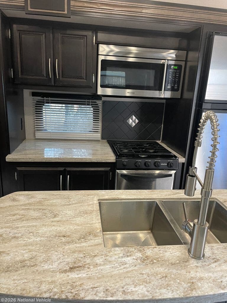 Step inside and enjoy a spacious rear-living layout that feels like a true home away from home. Oversized windows flood the living area with natural light, highlighting the theater seating, plush sofa, and entertainment center, perfect for relaxing after a day of adventure. The gourmet kitchen is fully equipped with solid-surface countertops, an island sink, a refrigerator, four-burner range, convection microwave, and an abundance of pantry and cabinet storage.