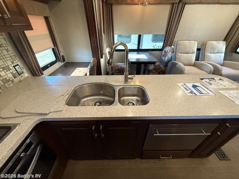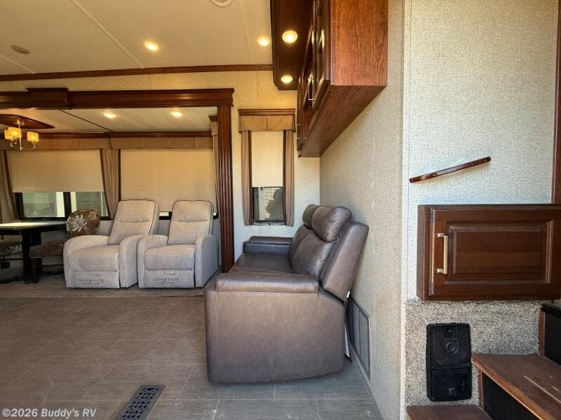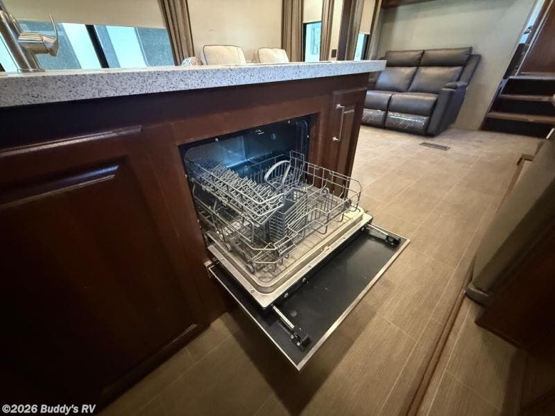 When you come to take a look at this fifth wheel, you will not be let down. The cook of the family will LOVE having extra counter space for prepping family favorites, and the kids will like having the space for cleaning up afterward. Enjoy one another's company while relaxing on the sofa sleeper, theater seats, or the free standing dinette. After a long day of relaxing, adventuring, and hanging out outside under the 16' power awning, you can get a good night's rest on the king bed in the private front bedroom.
