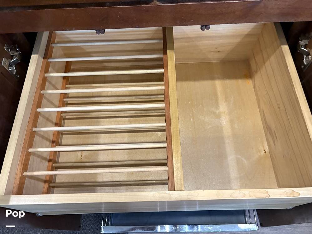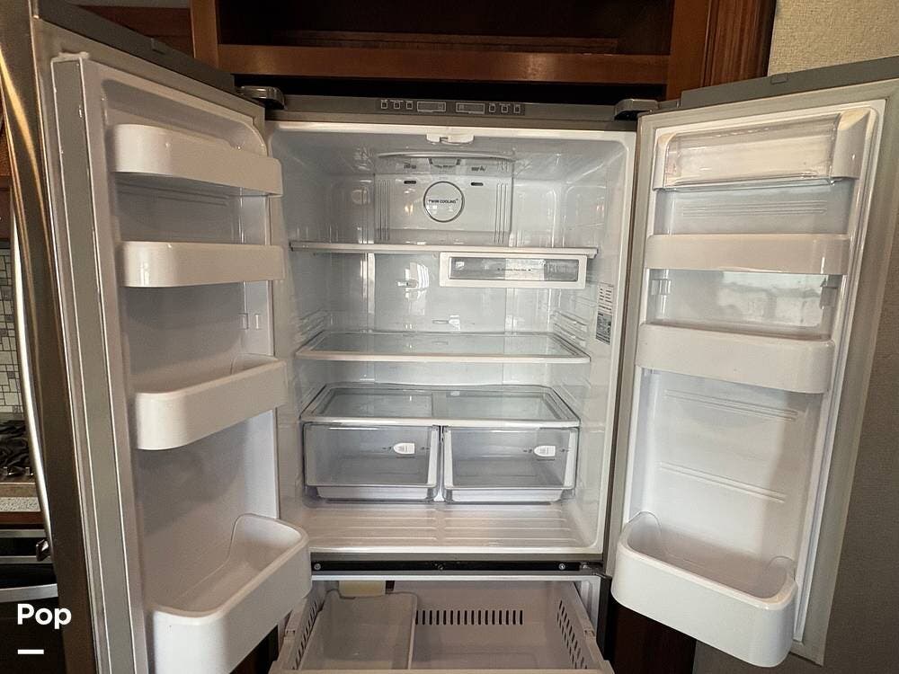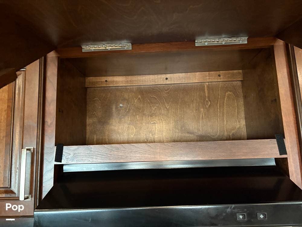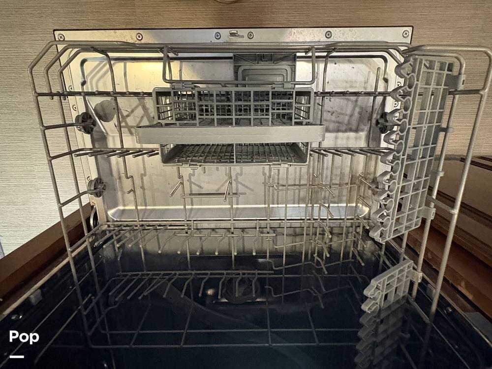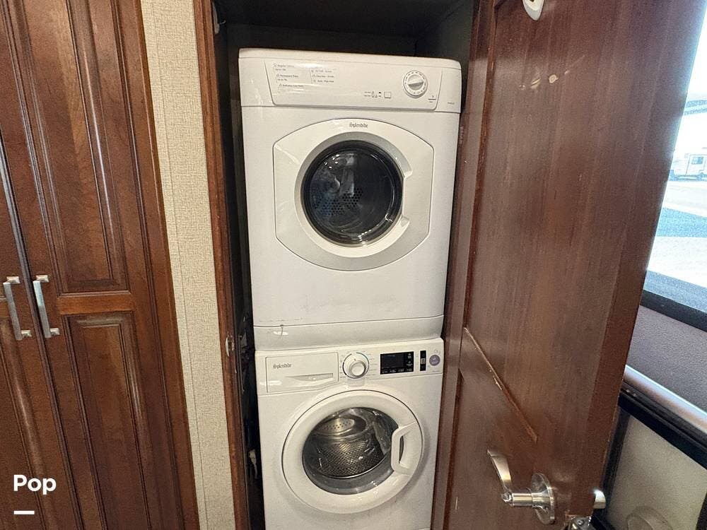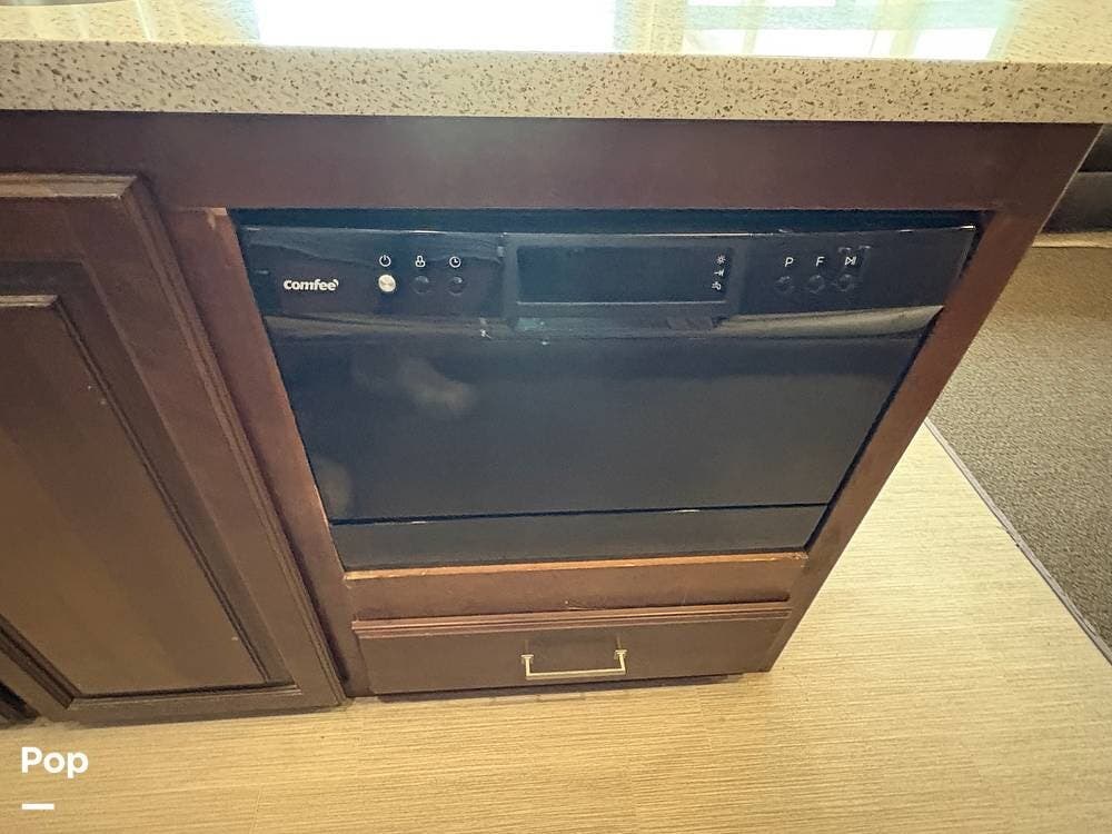 The island kitchen is beautifully appointed and features a full assortment of stainless steel appliances. It features a full-size refrigerator, microwave, 3-burner gas cooktop, and conventional oven. This one also comes with the optional dishwasher. There is also a washer and dryer nearby.
