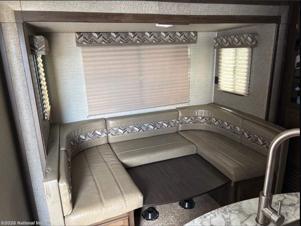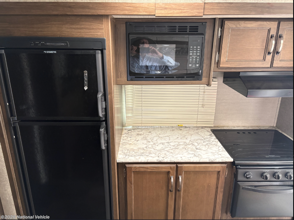 Step inside to a bright, open living space with a smart layout that maximizes every inch. The slide-out expands the main area, creating room for a comfortable dinette and seating area, while large windows bring in plenty of natural light. The kitchen is well-equipped with modern appliances, ample counter space, and overhead storage, making meal prep simple whether you're on a weekend getaway or a longer trip.