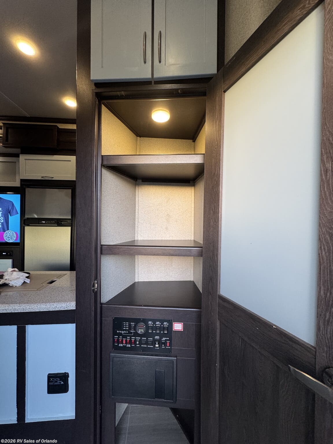 38 ft long - 8' 4" wide - 12909 weight - 3 slides - sleeps 7 - washer/dryer hookup in garage - interior space 72" - 11' garage space - dual entry doors - dual opposing slides to give an open concept - entertainment center - plenty of cabinet space -island kitchen peninsula counter in kitchen - double kitchen sink - 2nd pantry - twin loft - overhead electric bed in garage - bathroom has ample storage - queen master - 8 cu ft refrigerator - 3 TV's in master garage and living area