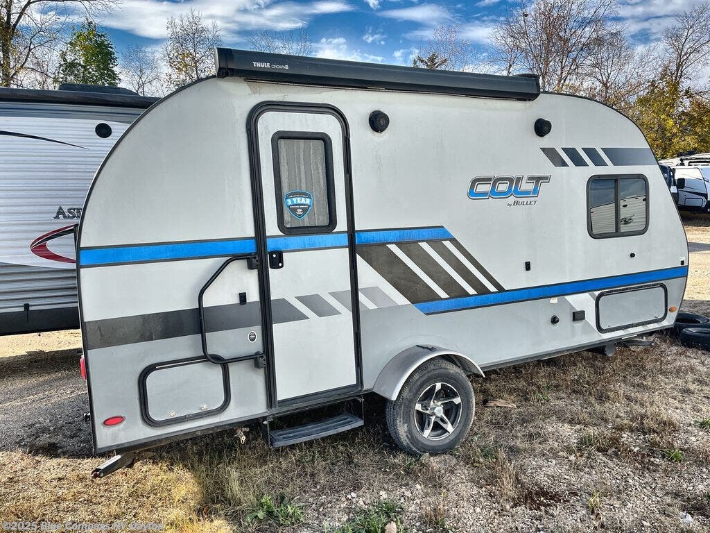 This Colt travel trailer by Bullet features sleeping for 3 or 4 with a queen size bed, and a slide out u-shaped dinette that can be converted at night for another bed.