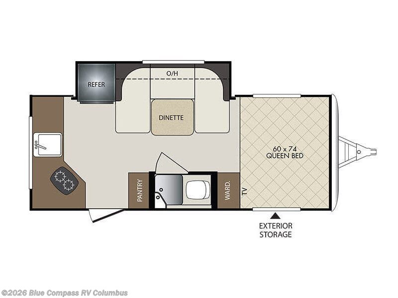 The very front is where you will find a queen size bed. You will also find a wardrobe along the curb side, and a spot for an optional 24" LED TV if you choose to add it, plus so much more!