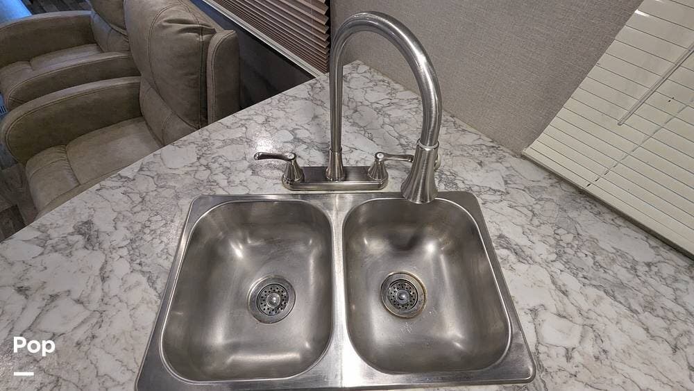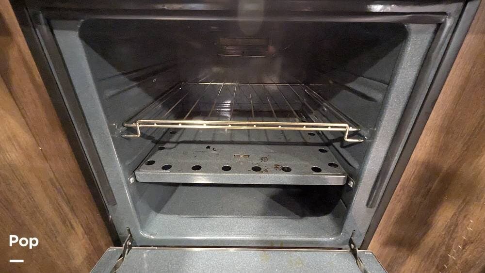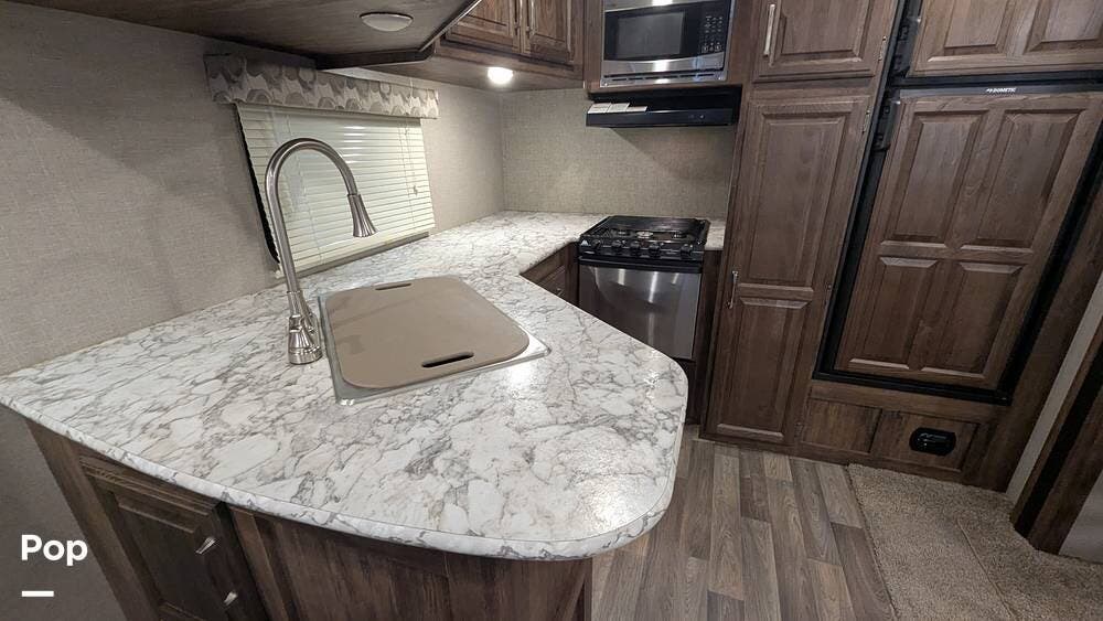 This 2018 Keystone Cougar 29RKSWE features the popular rear kitchen, offering abundant counter space, a refrigerator, a stainless steel undermount sink, and a microwave oven for meal prep.