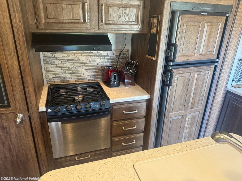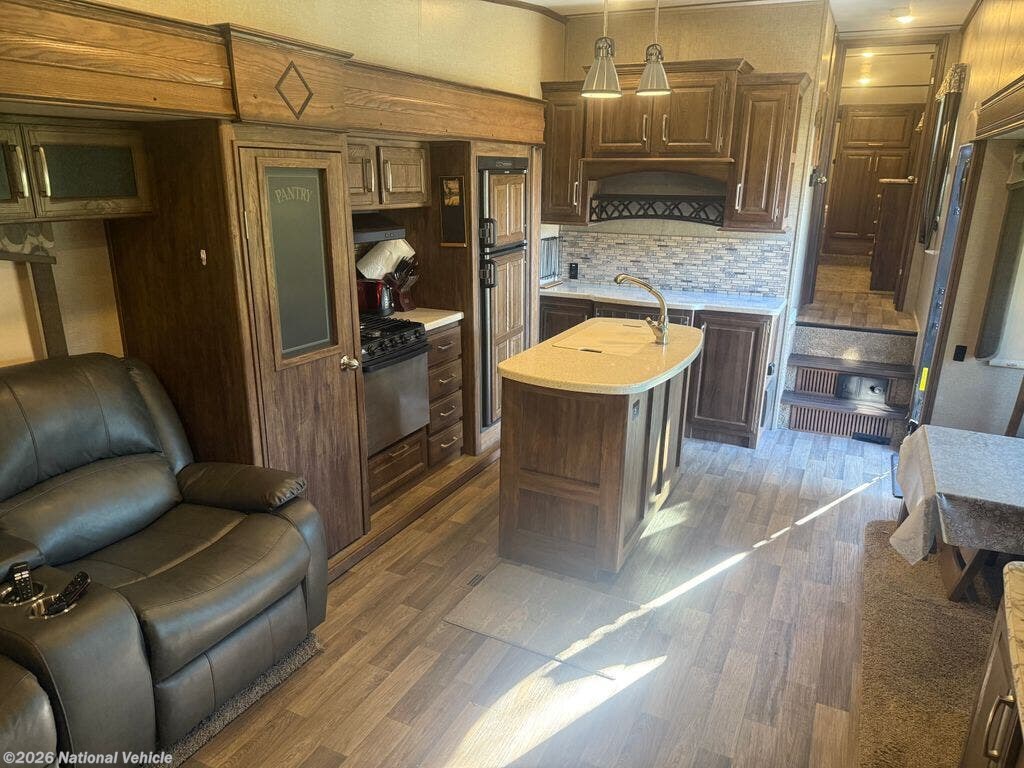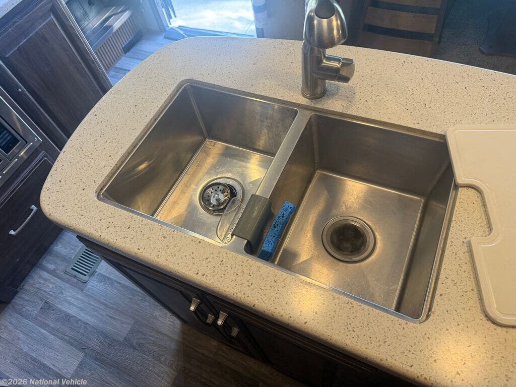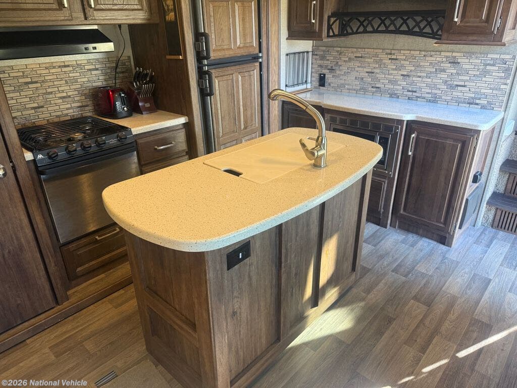 The rear kitchen layout is a standout feature, offering expansive counter space, a center island with double sink, a 3-burner range with oven, microwave, refrigerator, and abundant cabinetry. Designed for real-world use, this kitchen makes cooking and entertaining on the road both easy and enjoyable.