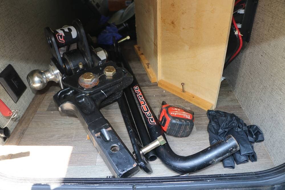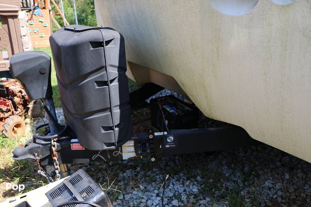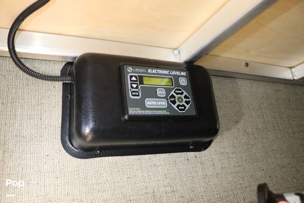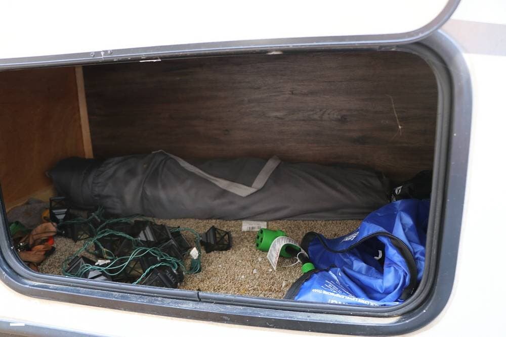 There is a large full-width storage space at the front of the RV and all of the RV systems are clearly marked and easily accessible around the unit. The tongue of the trailer is equipped for the weight distribution hitch system shown in the storage compartment, and it also has a power tongue jack in addition to the four-point leveling system that makes setup and breakdown quick and easy. The two 30 lb propane tanks and rock guard are positioned directly in front of the house battery box.