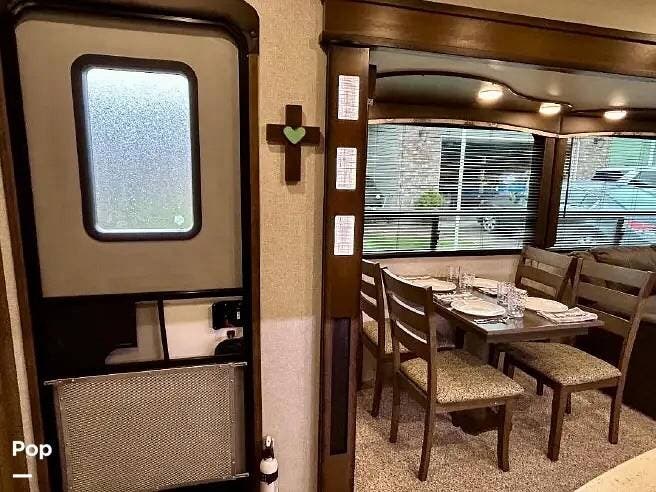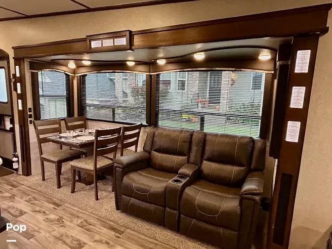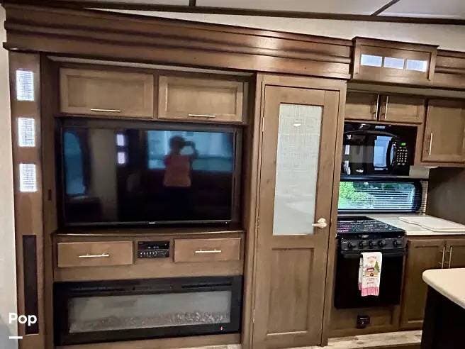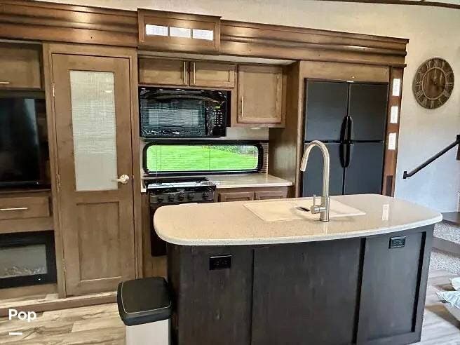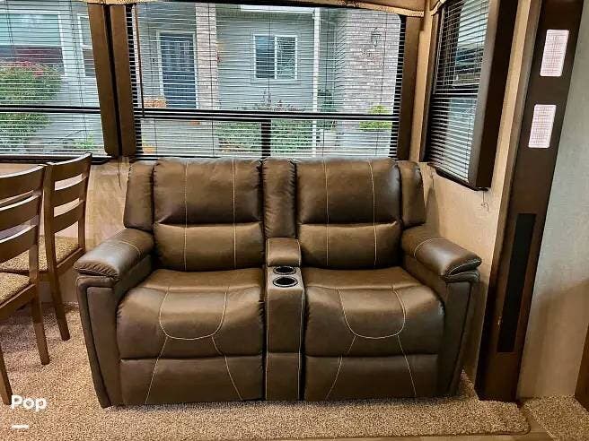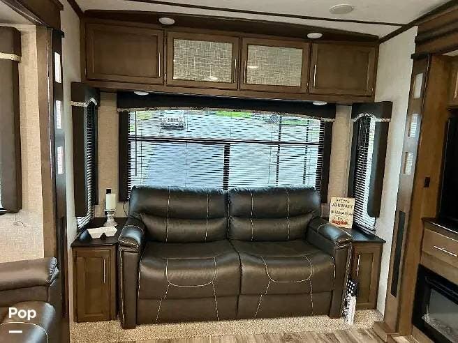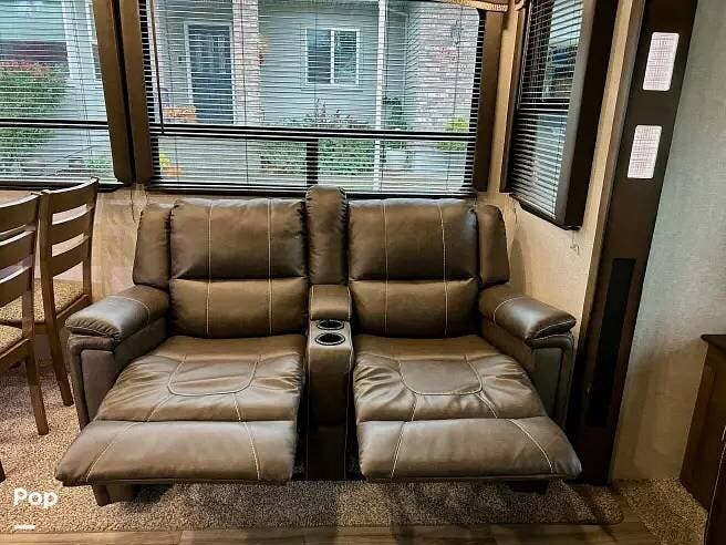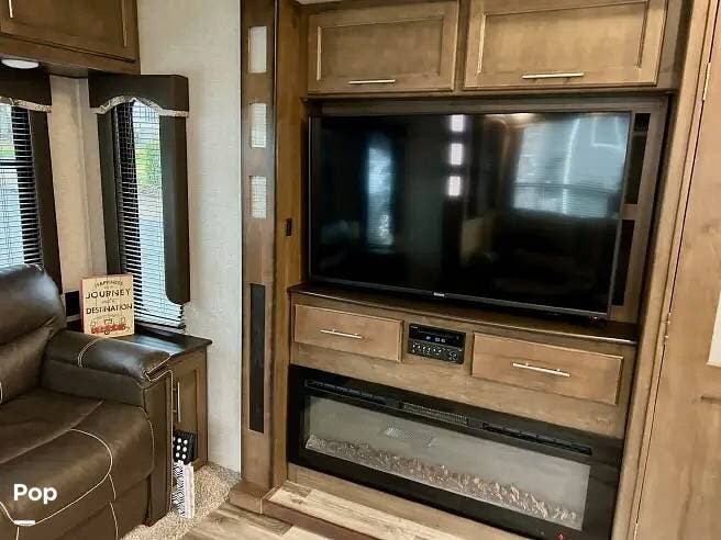 This 2018 Cougar 344MKS offers a comfortable layout built for both travel and extended stays. The rear living area features large windows, an entertainment center, theater seating, and a tri-fold sofa. It sleeps up to four with a king bed and sofa sleeper. Dual A/C units and an electric fireplace help maintain a steady interior climate year-round.