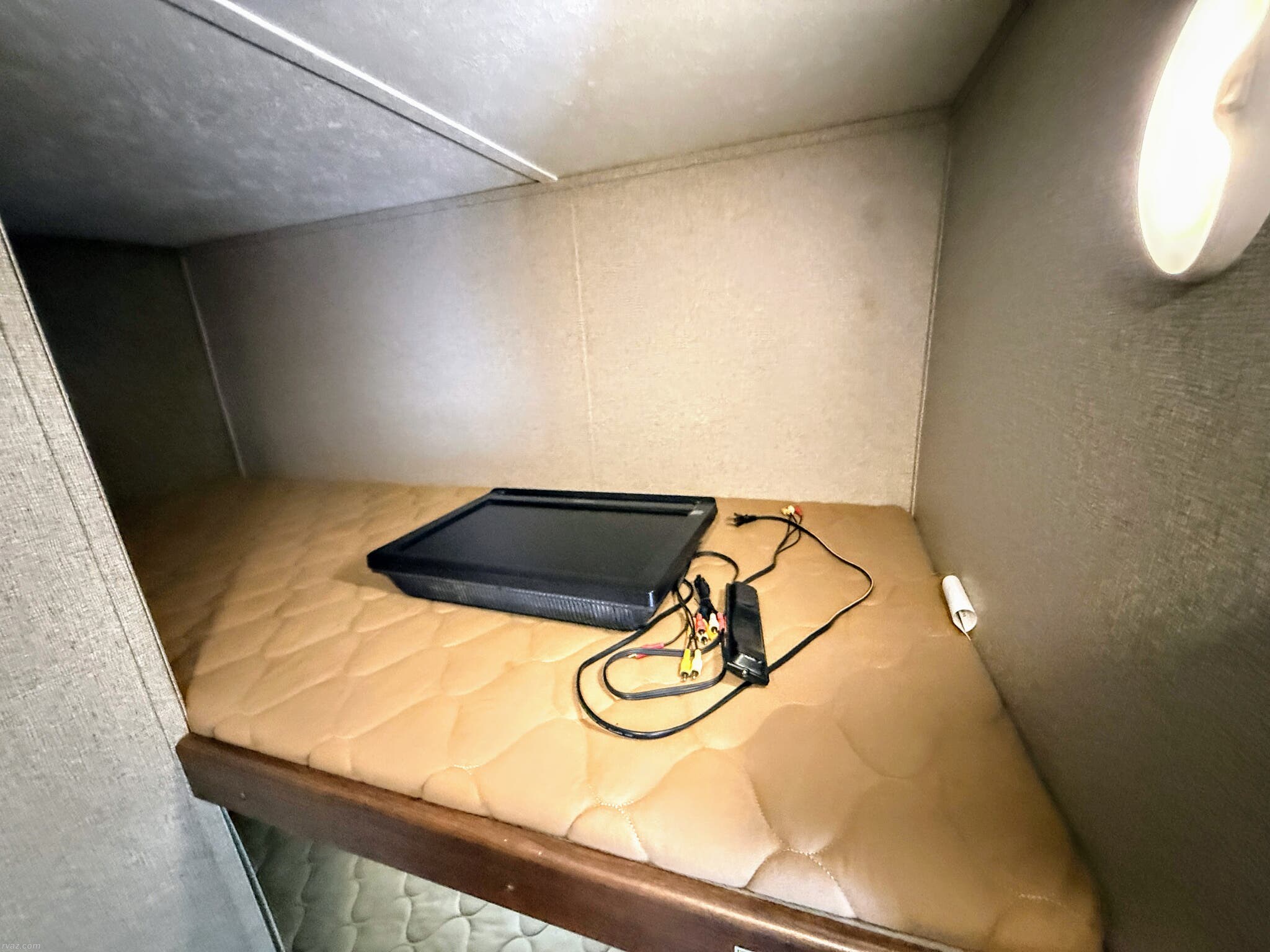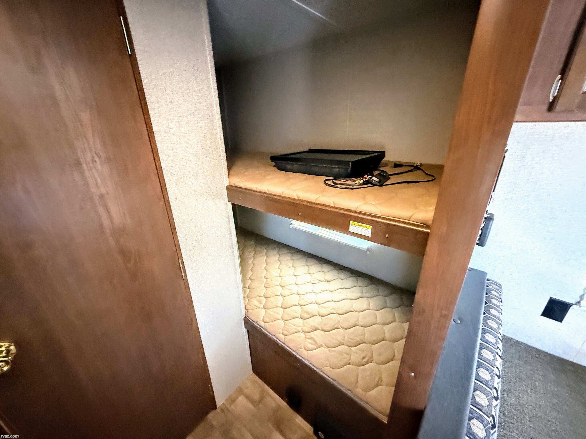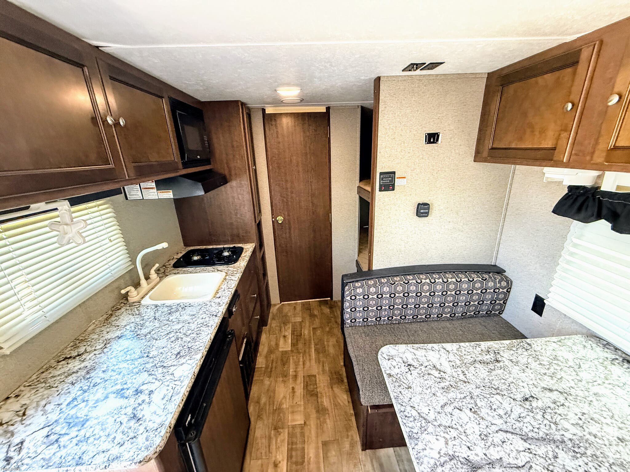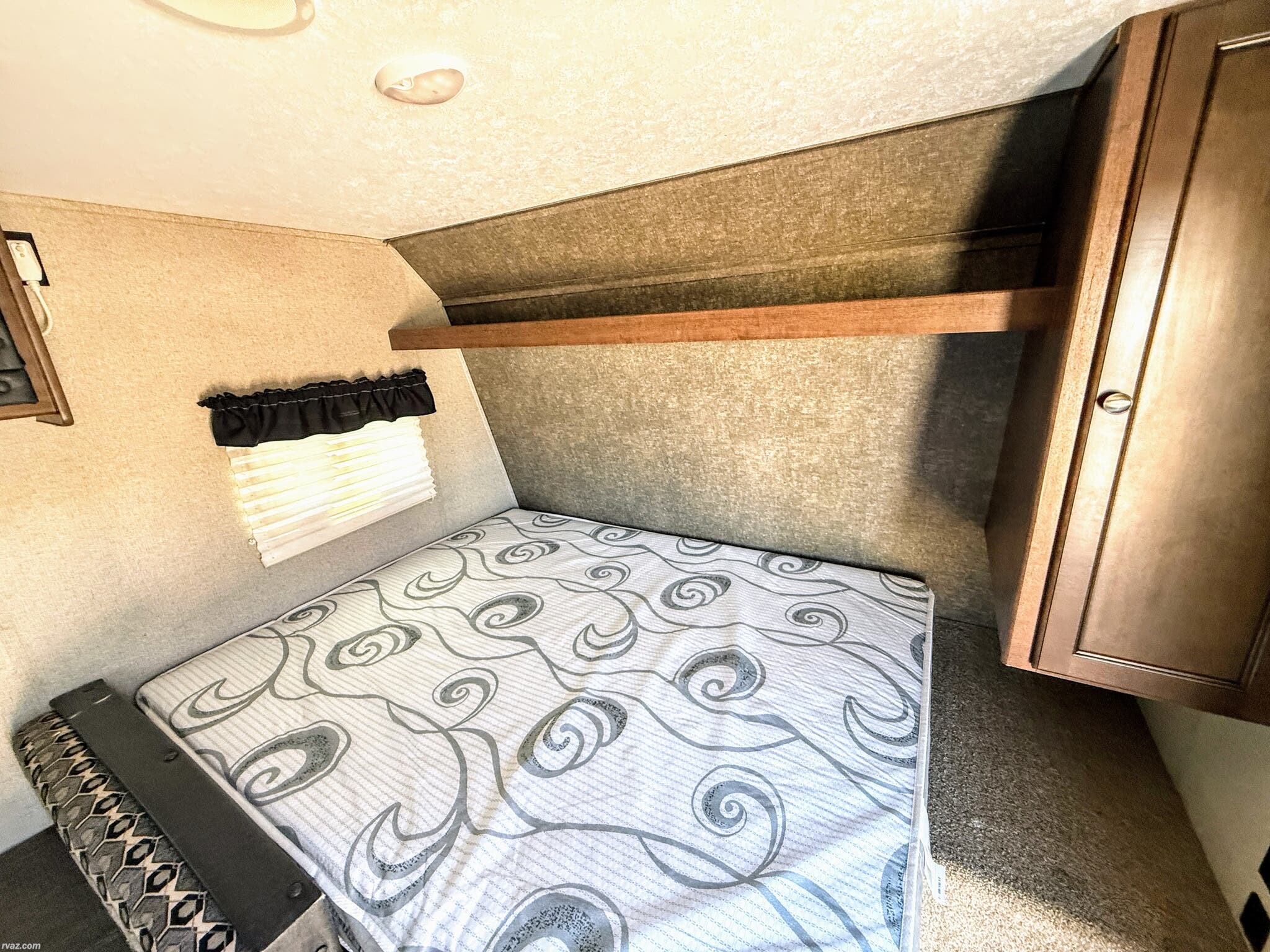 2018 KEYSTONE HIDEOUT 175LHS SMALL BUNK TRAILER THAT SLEEPS UP TO 6 FOR UNDER 10K Key Specifications Specification Value Length 21 ft. 5 in. Dry Weight 3,300 lbs Carrying Capacity 1,185 lbs GVWR 4,485 lbs Sleeps 5 (queen bed, 2 bunks, dinette) Fresh Water Capacity 27 gallons Gray Water Capacity 30 gallons Black Water Capacity 30 gallons Air Conditioning 8,000 BTU Heater (Furnace) 20,000 BTU Awning Manual retractable awning Tire Size ST205/75R14D Interior Features Front queen bed Two rear bunk beds Dinette that converts to a sleeping area Tub/shower combo with a toilet 3.2 cubic foot refrigerator with freezer 2-burner range top and microwave Bluetooth DVD/CD/MP3 stereo Monitor panel Ball bearing drawer guides Reversible dinette cushions Exterior Features Manual awning Manual front and rear leveling jacks 14-inch wheels Electric drum brakes on rear axle Exterior storage compartment Pass-through storage accessible from under the bed