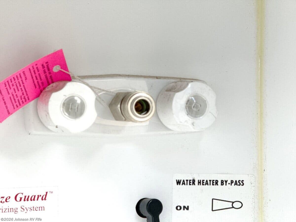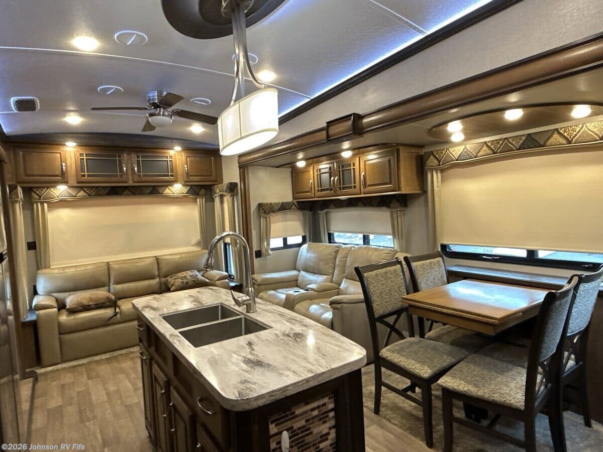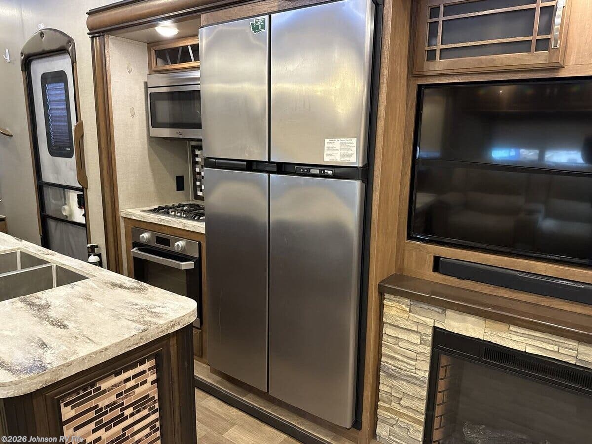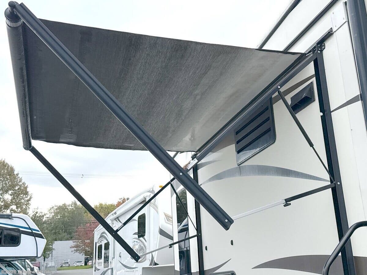 Features Include: Four Season, Patio Security Light, Vaulted Ceiling, Ceiling LED Lighting, Crown Molding, Armstrong Flooring, Shaw Carpeting, Roller Shades, Hide-A-Bed Sofa, Pull Out trash Can, Stainless Steel Sink, Backsplash, Systems Center, Rear Camera Prep, Satellite Prep, Queen Bed 60x80, Quilted Headboard, Bedside Nightstands, Reading Lights, Wood TV Cabinet, Underbed Storage, Wardrobe, Shower Skylight, Color Coded Wiring, 50-AmpService Cord, 75-Amp Converter, 30k Total AC, 16.5k Heat Pump, 3rd AC Prep, 35k Furnace, 12v Heated Tanks, Winterization Kit, Water Heater Bypass, Black Tank Flush, Max Turn, Hitch Vision, Painted Front Cap, Rear Roof Ladder