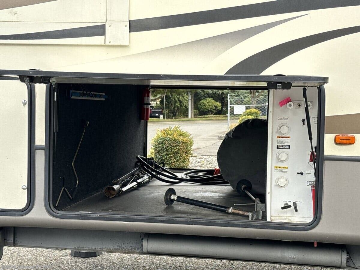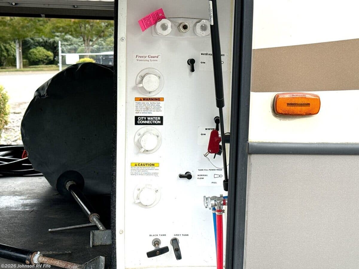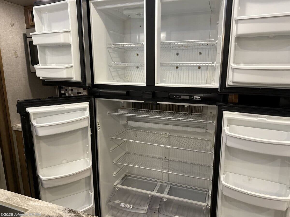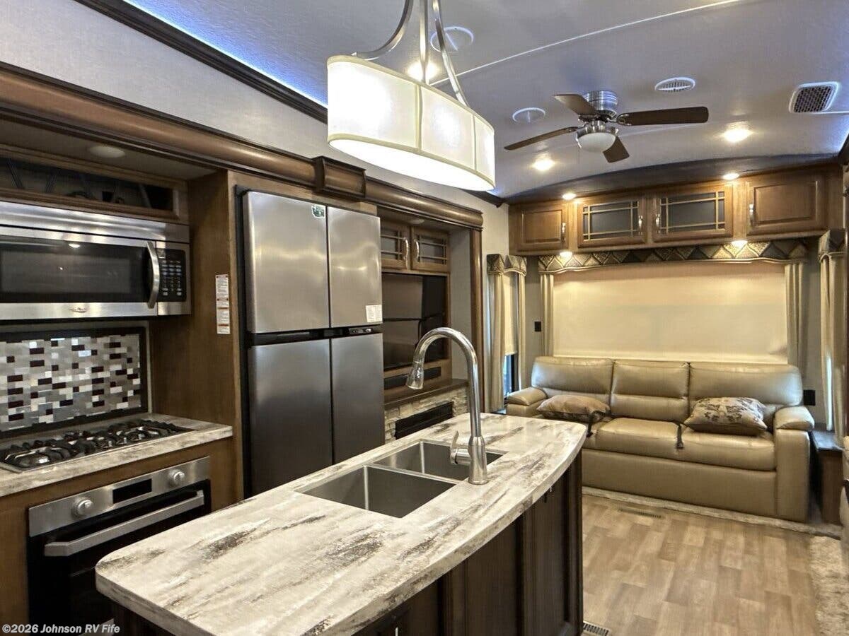 Features Include: Four Season, Patio Security Light, Vaulted Ceiling, Ceiling LED Lighting, Crown Molding, Armstrong Flooring, Shaw Carpeting, Roller Shades, Hide-A-Bed Sofa, Pull Out trash Can, Stainless Steel Sink, Backsplash, Systems Center, Rear Camera Prep, Satellite Prep, Queen Bed 60x80, Quilted Headboard, Bedside Nightstands, Reading Lights, Wood TV Cabinet, Underbed Storage, Wardrobe, Shower Skylight, Color Coded Wiring, 50-AmpService Cord, 75-Amp Converter, 30k Total AC, 16.5k Heat Pump, 3rd AC Prep, 35k Furnace, 12v Heated Tanks, Winterization Kit, Water Heater Bypass, Black Tank Flush, Max Turn, Hitch Vision, Painted Front Cap, Rear Roof Ladder