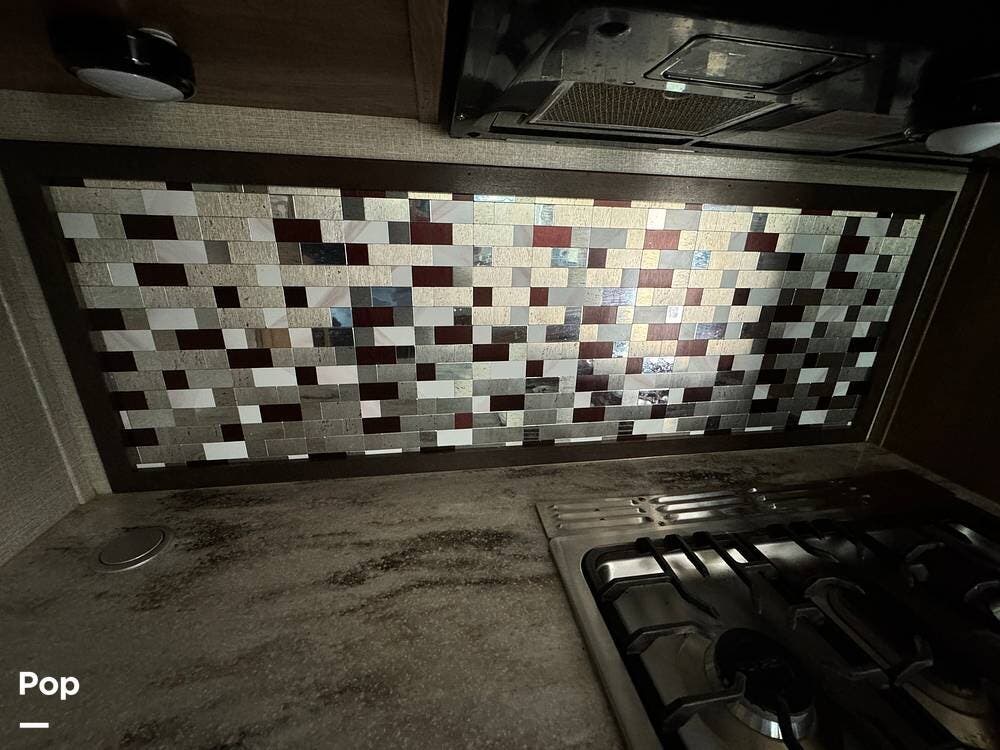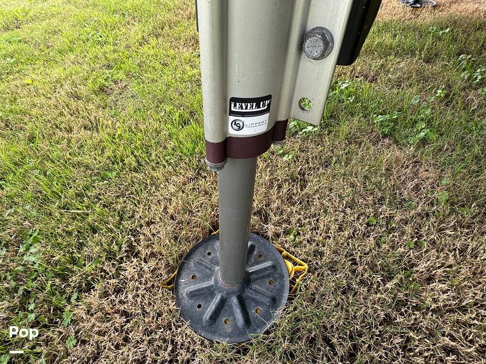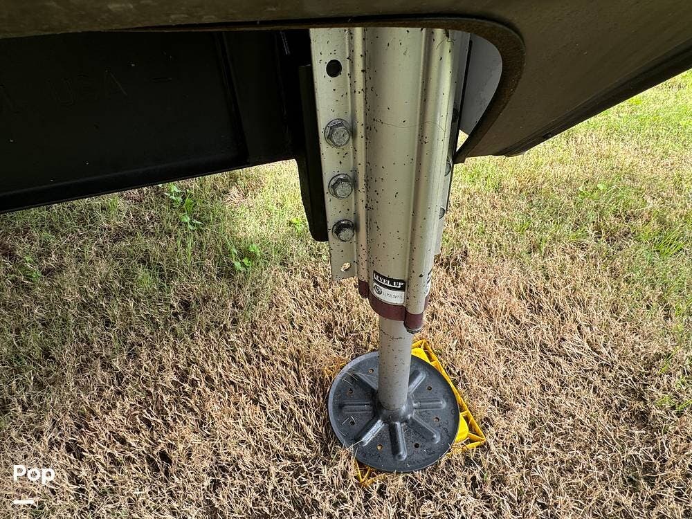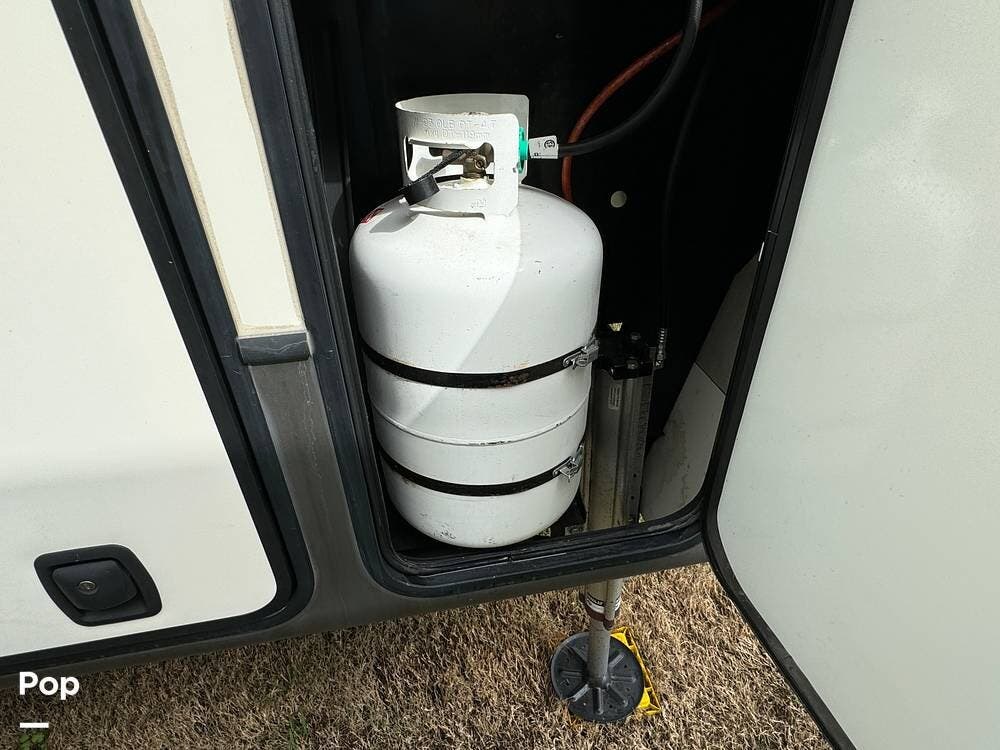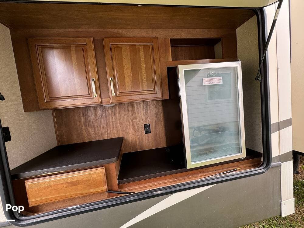 Outside, the RV is equipped with an Automated Leveling System, featuring push-button automatic leveling for easy setup and breakdown. There is an electric patio awning for a relaxing outdoor experience. For outdoor entertaining, there is a mini-fridge with a propane stove and storage.