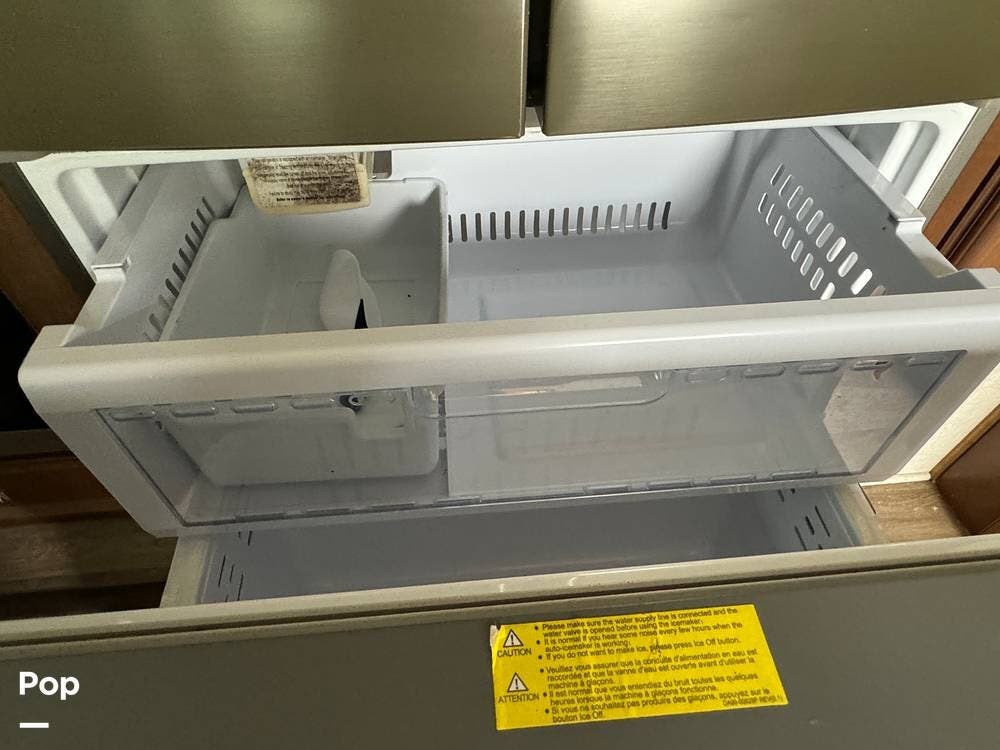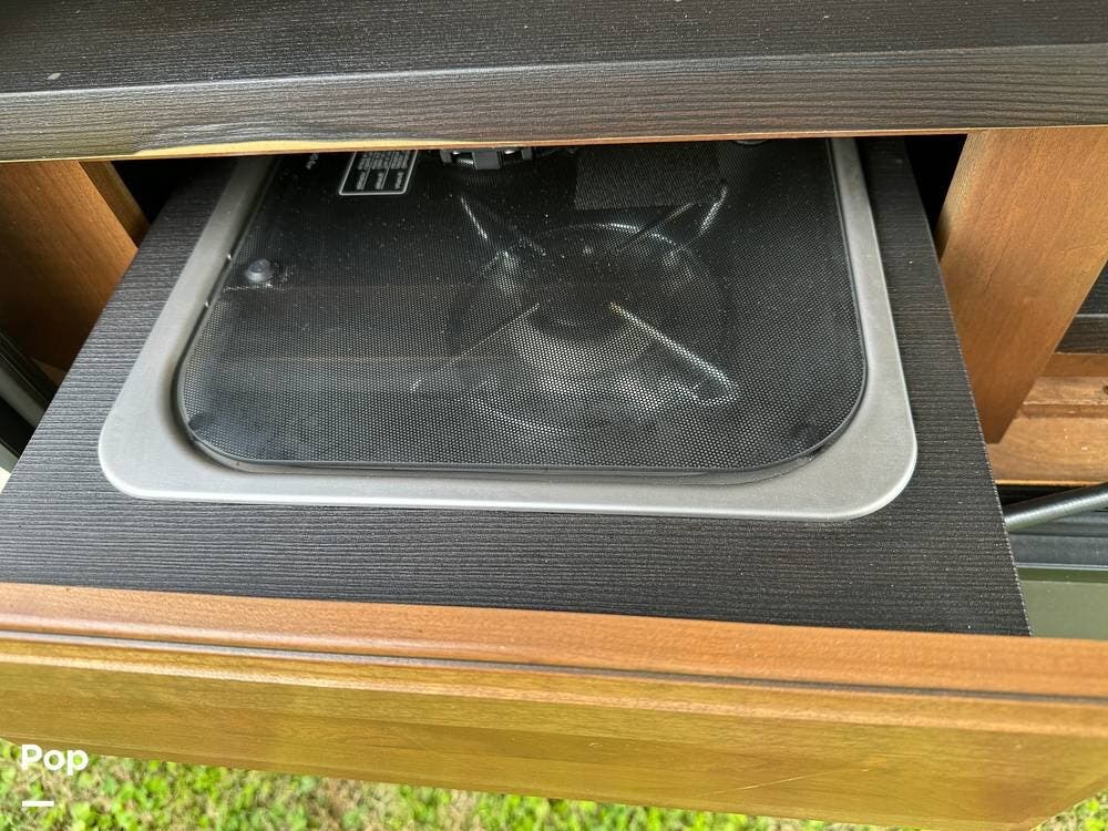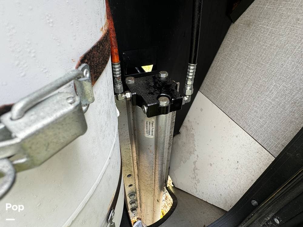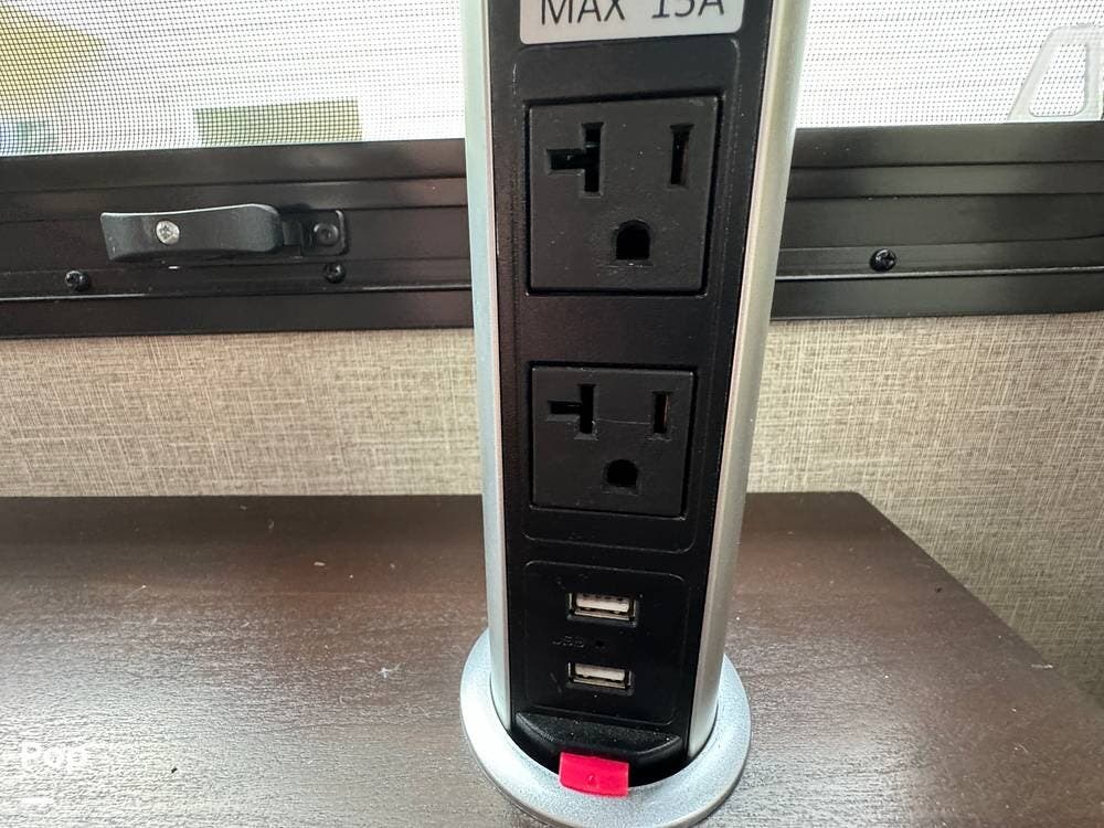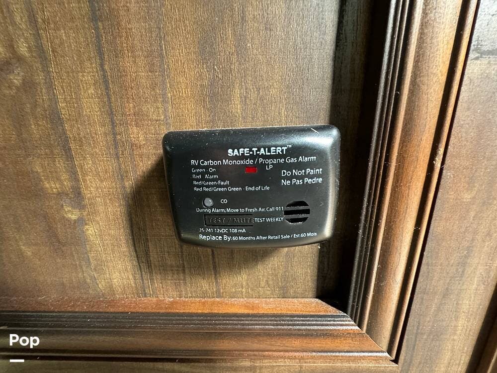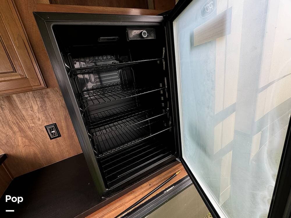 Outside, the RV is equipped with an Automated Leveling System, featuring push-button automatic leveling for easy setup and breakdown. There is an electric patio awning for a relaxing outdoor experience. For outdoor entertaining, there is a mini-fridge with a propane stove and storage.