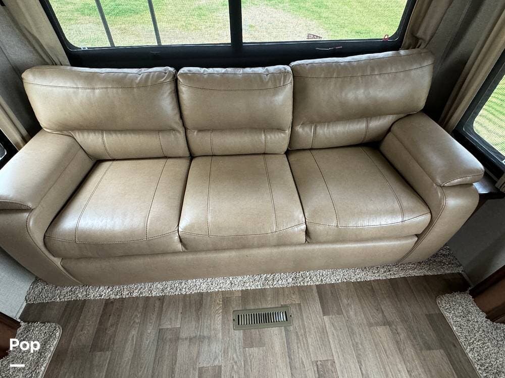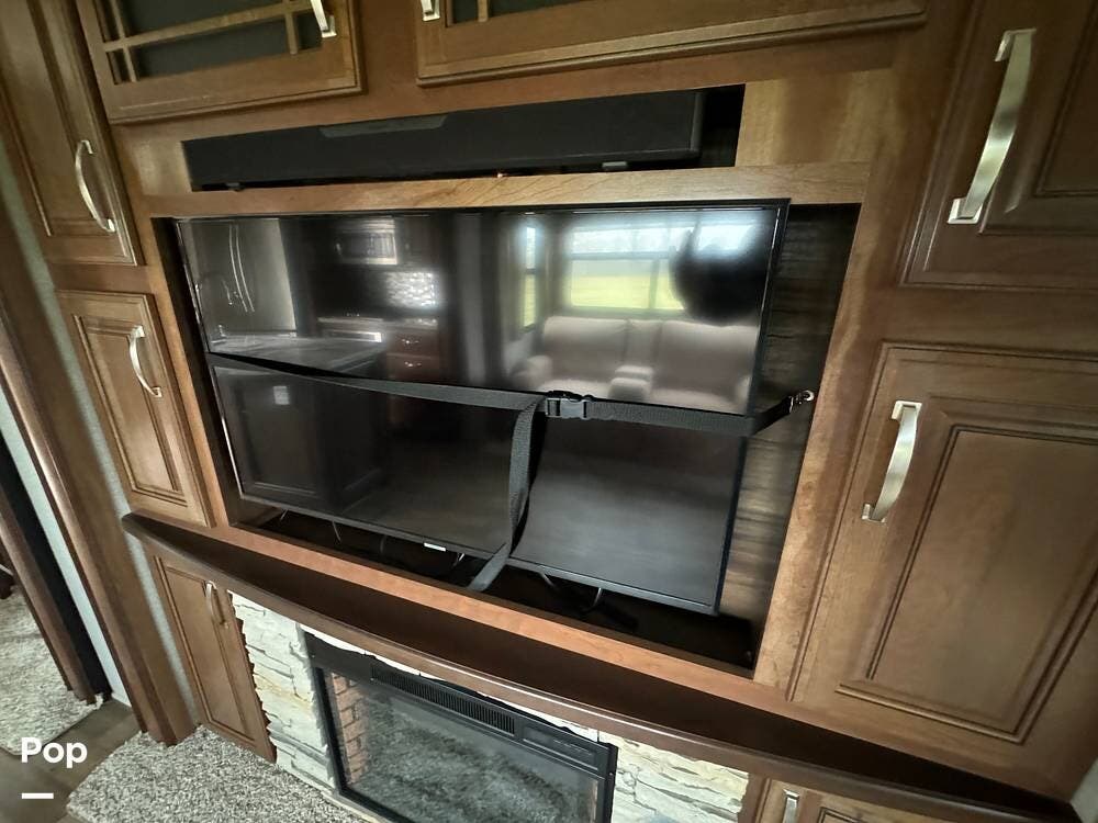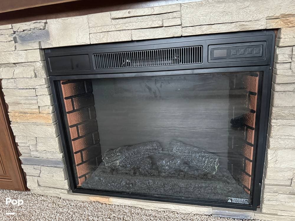 The spacious rear living area has dual opposing slides. Here, you will find theater-style recliner seating for two and a plush sofa that converts to a bed. There is a cozy electric fireplace with ambient lighting, a large flat-screen TV, and a stereo system with sound bar speakers and Bluetooth connectivity. The area is completed with a stylish ceiling fan.