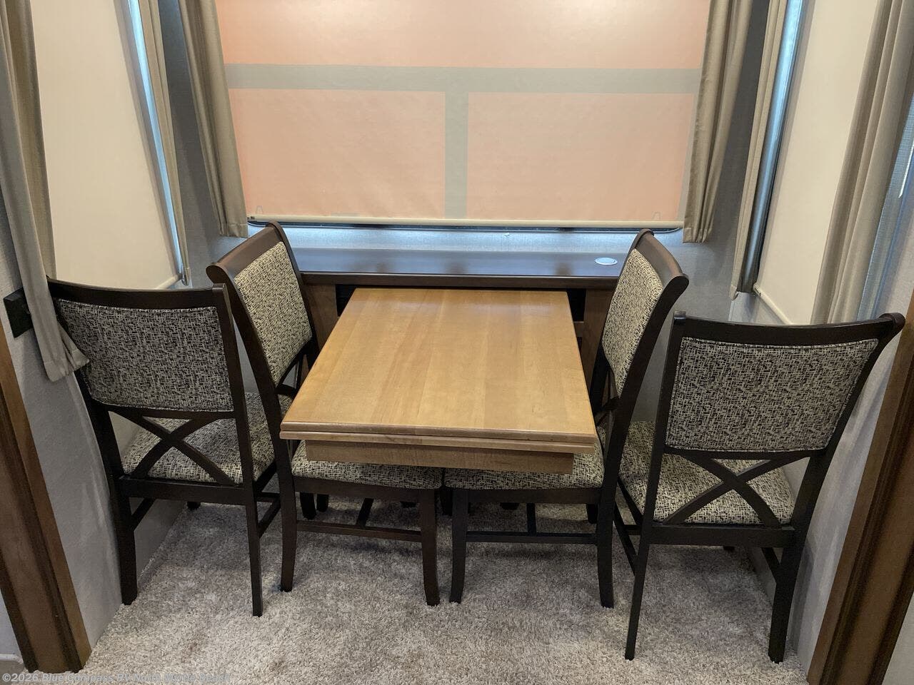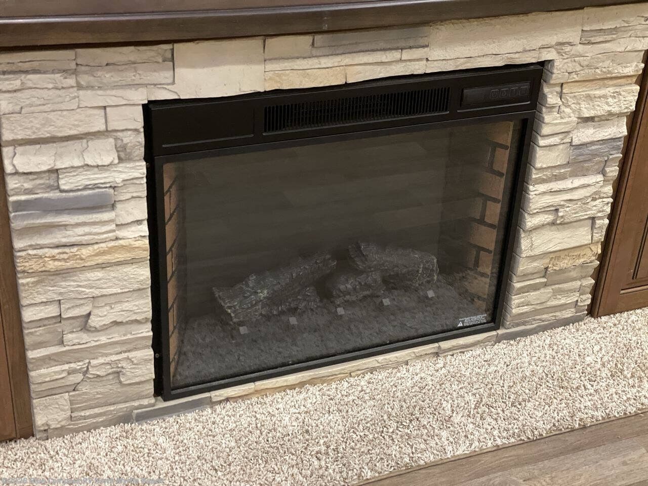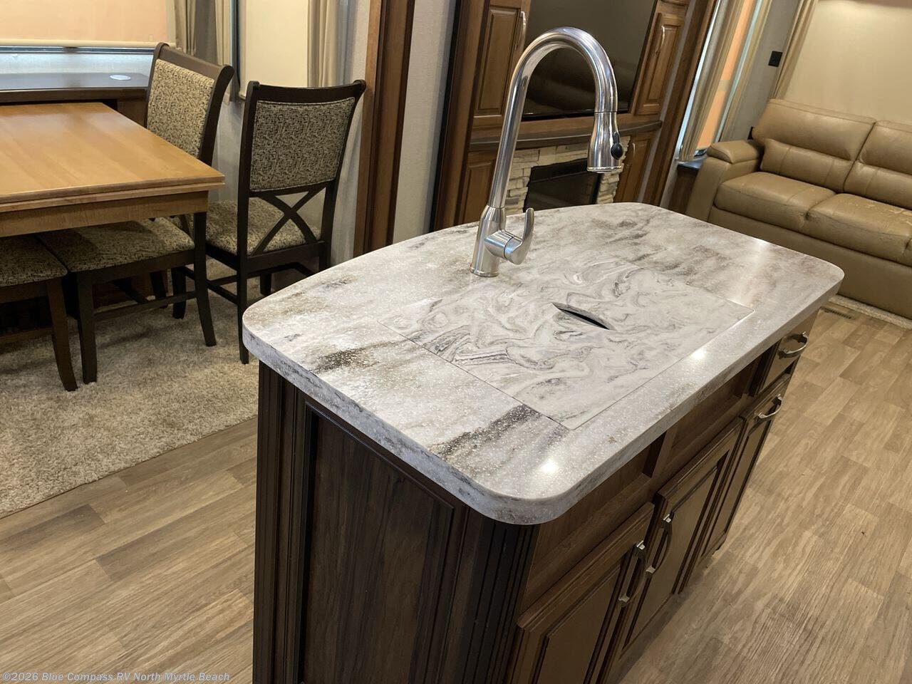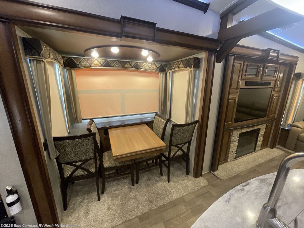 Step inside and you will be greeted by a wide open interior with a combined kitchen and living area. There is a slide out dining table, and a second slide out with an entertainment center, HDTV and fireplace to the left of the door.