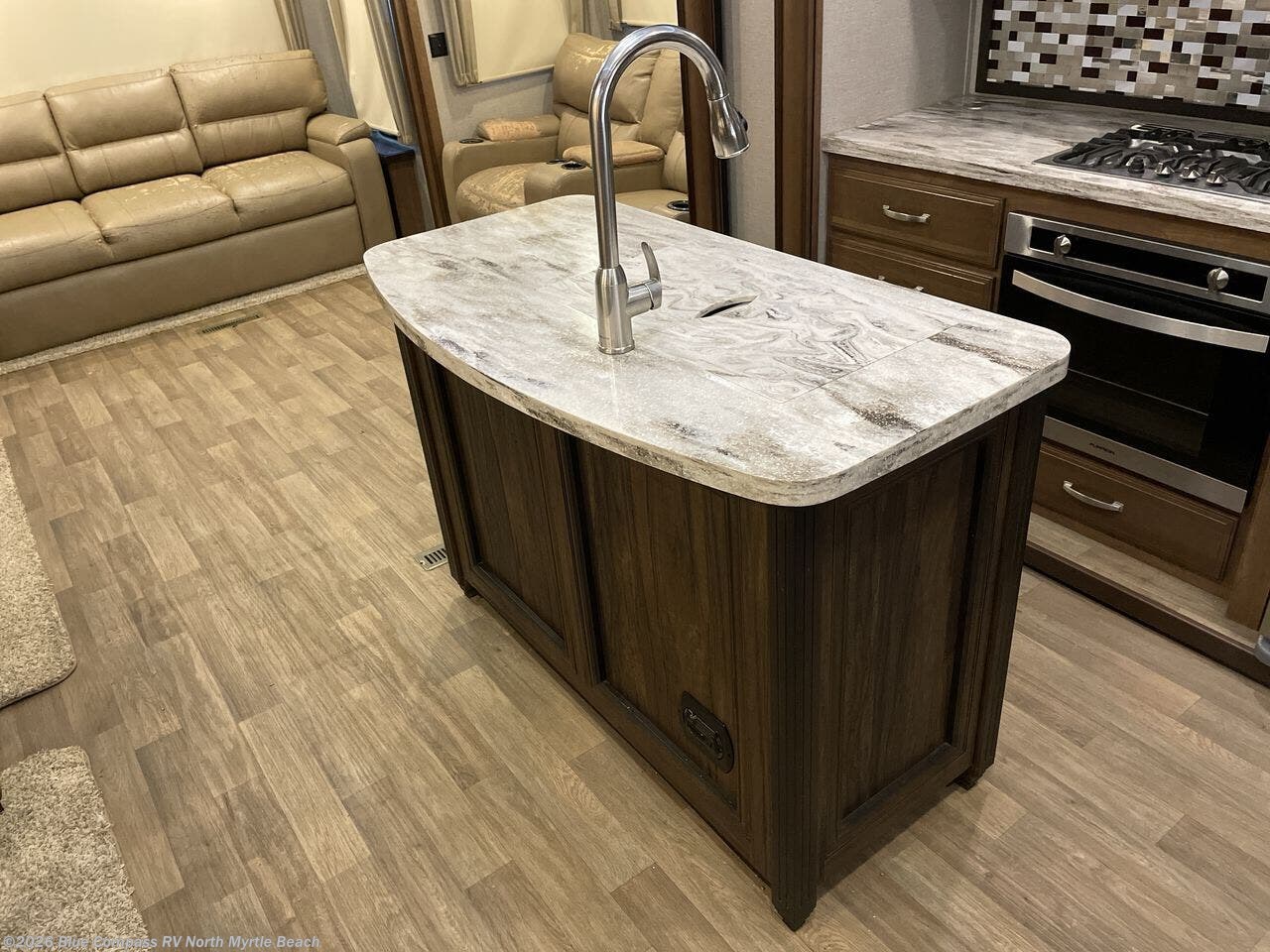 Opposite find a slide out with theater seating, and another slide out with a residential refrigerator, convection microwave oven, and three burner range. There is also counter space and additional storage. A nice pantry is adjacent along the interior wall straight in from the door which includes additional cabinet space both above and below. A convenient island is available in the center of the room and features double sinks for easy cleanup. Don't forget about the hide-a-bed sofa with end tables and overhead cabinets along the rear wall of the fifth wheel.