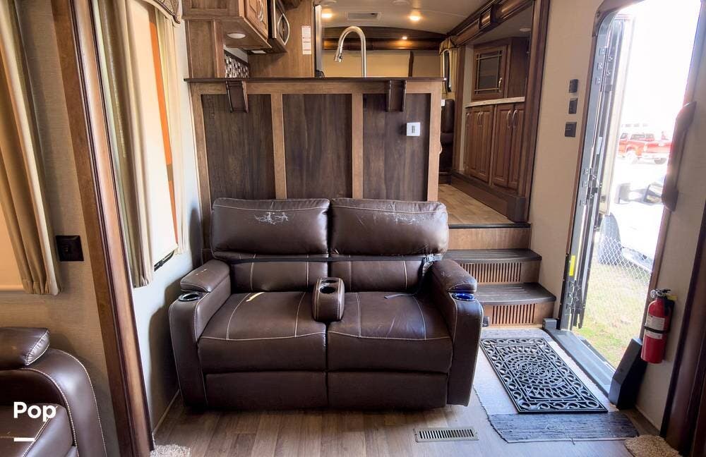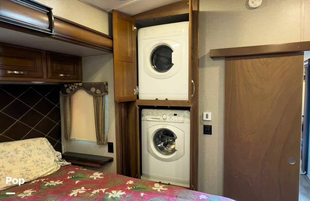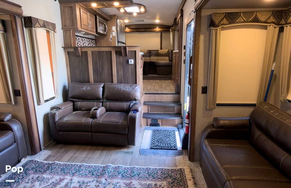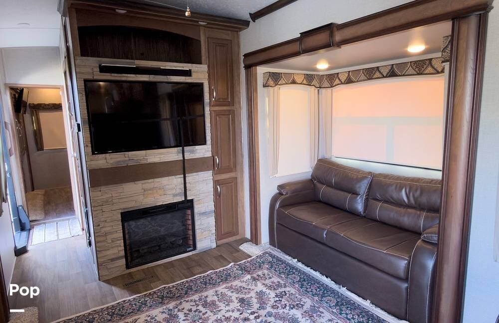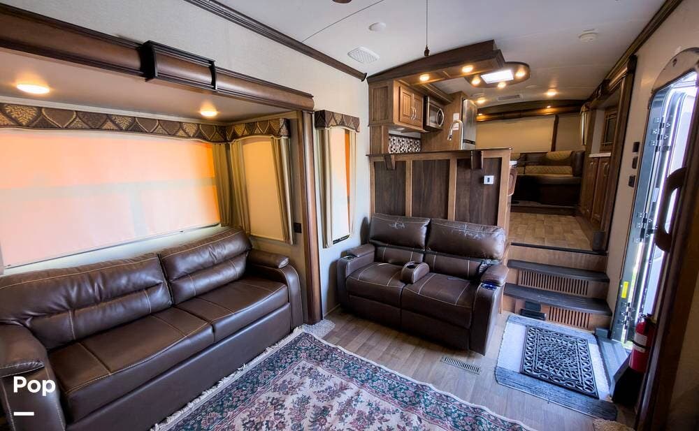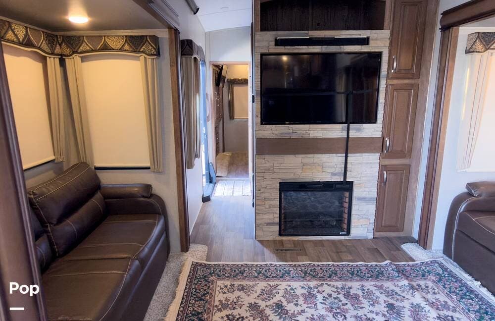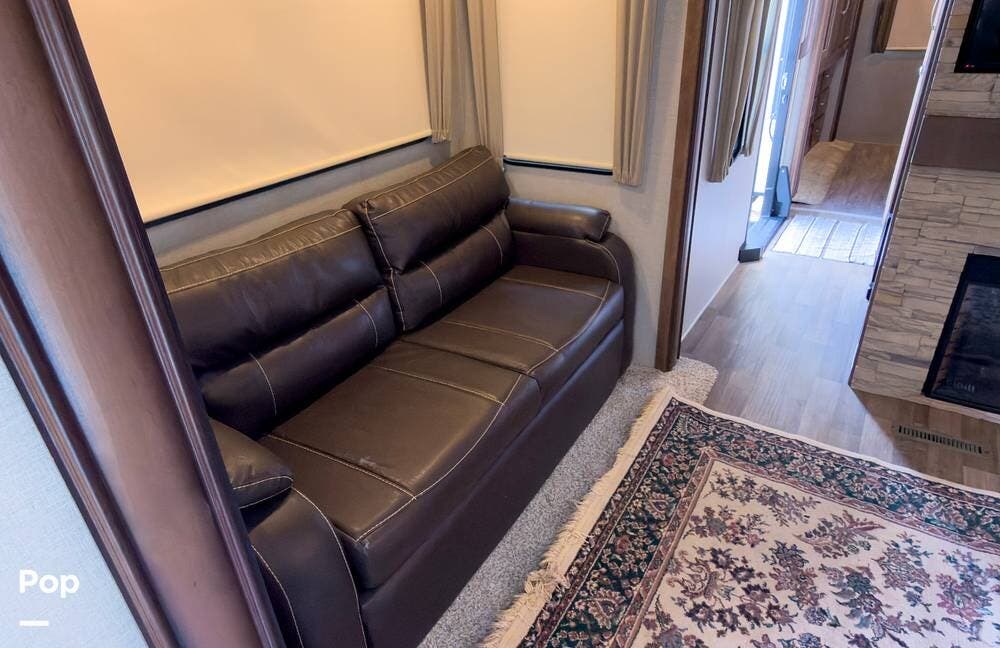 Beautiful 5th wheel with the best features! Enjoy a living area in center with 2 sofa beds & recliners, satellite TV, fireplace, washer/dryer & more!
